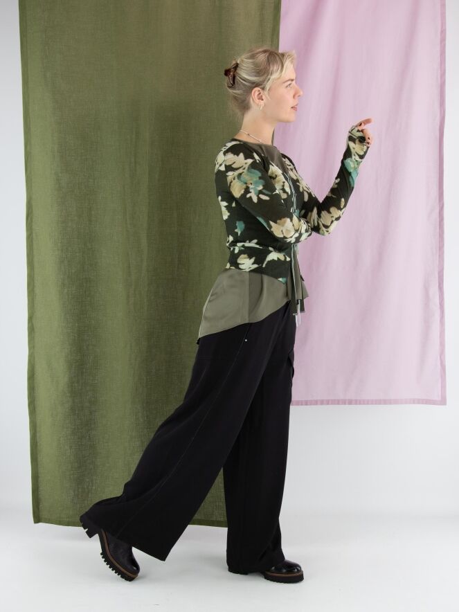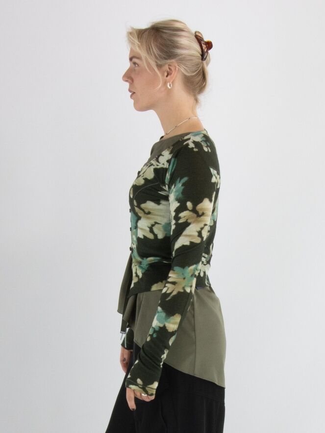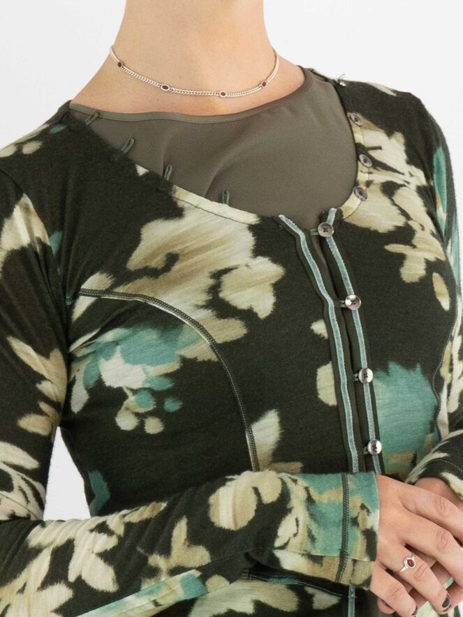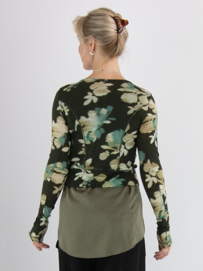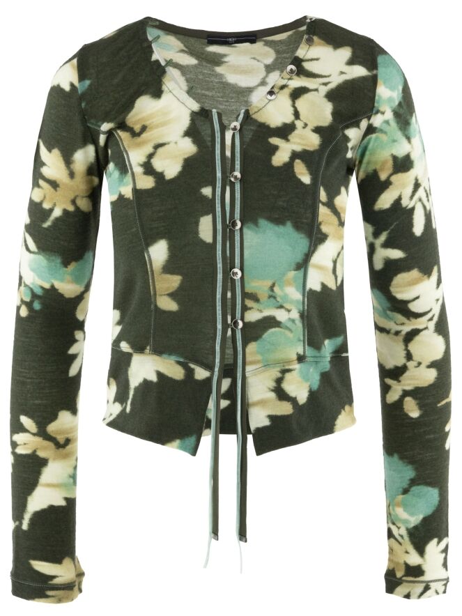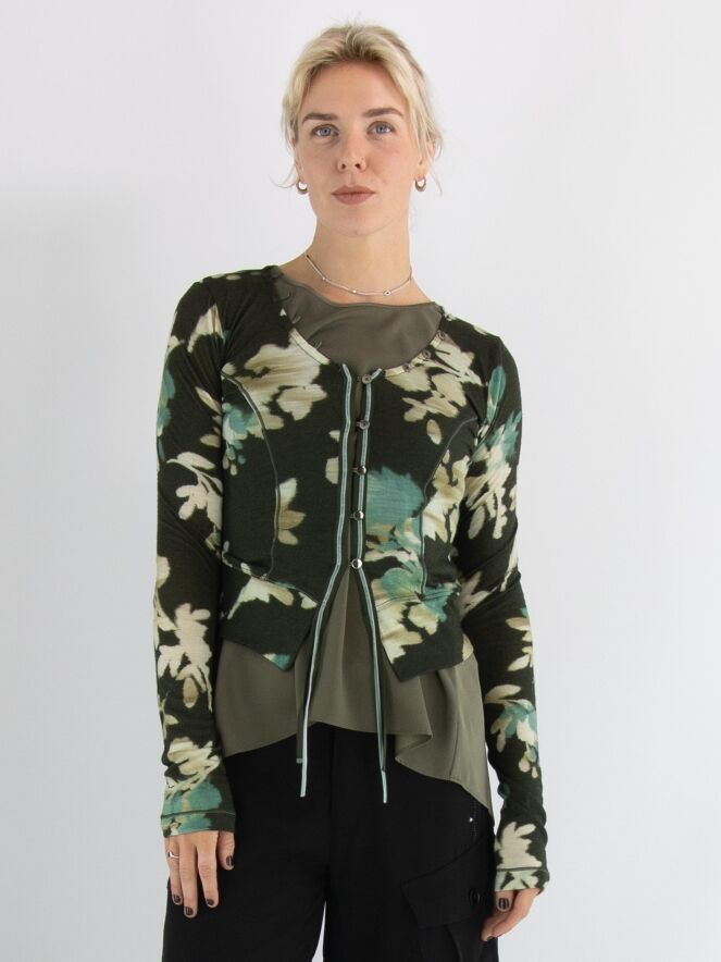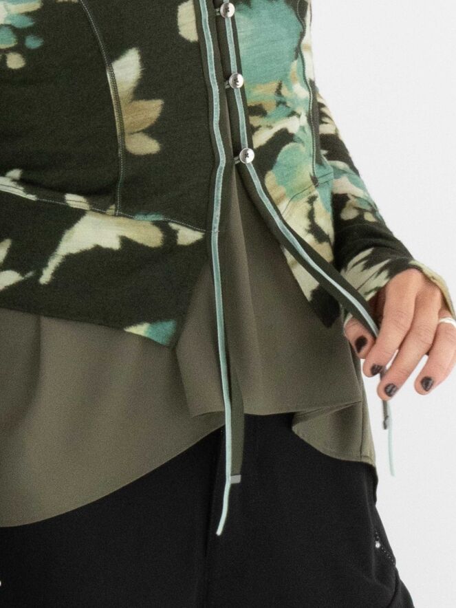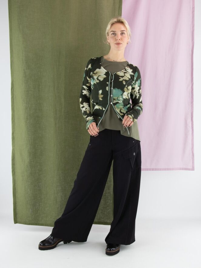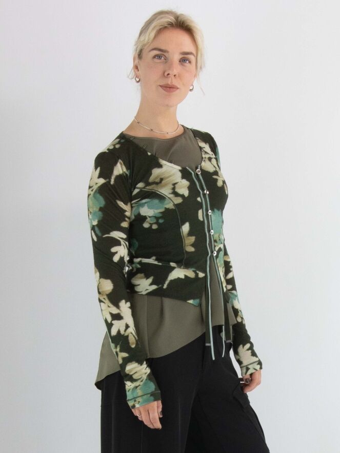 Een vest van High in een grafische bloemenprint met de kleuren beige, taupe en turquoise op een olijfgroene achtergrond. De knoopsluiting loopt decoratief door langs de rand van de hals. Langs de sluiting zit een fluwelen bies die aan de onderkant als twee linten doorloopt. Dit vest mag met de hand worden gewassen.