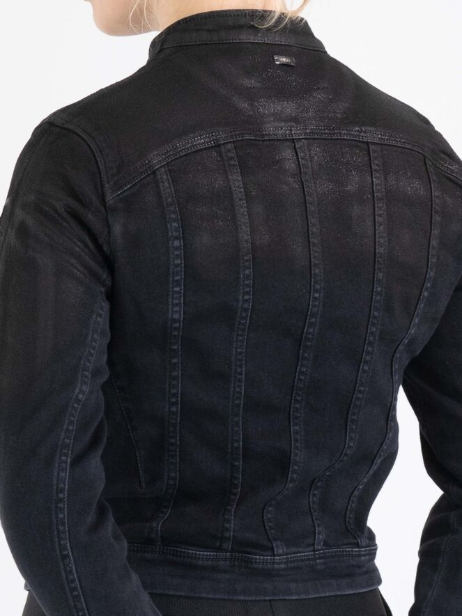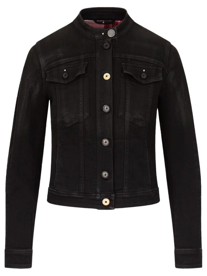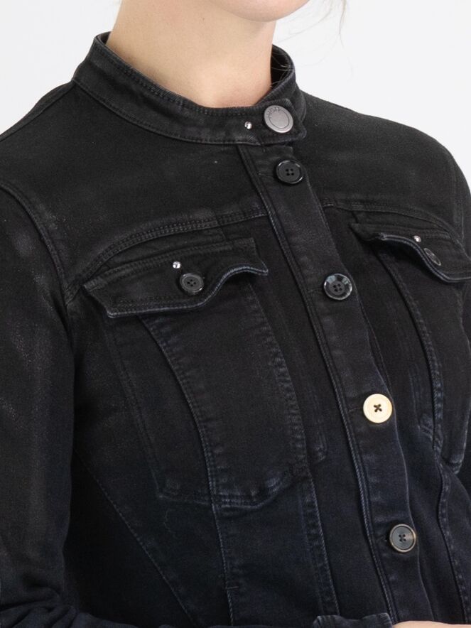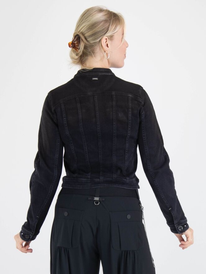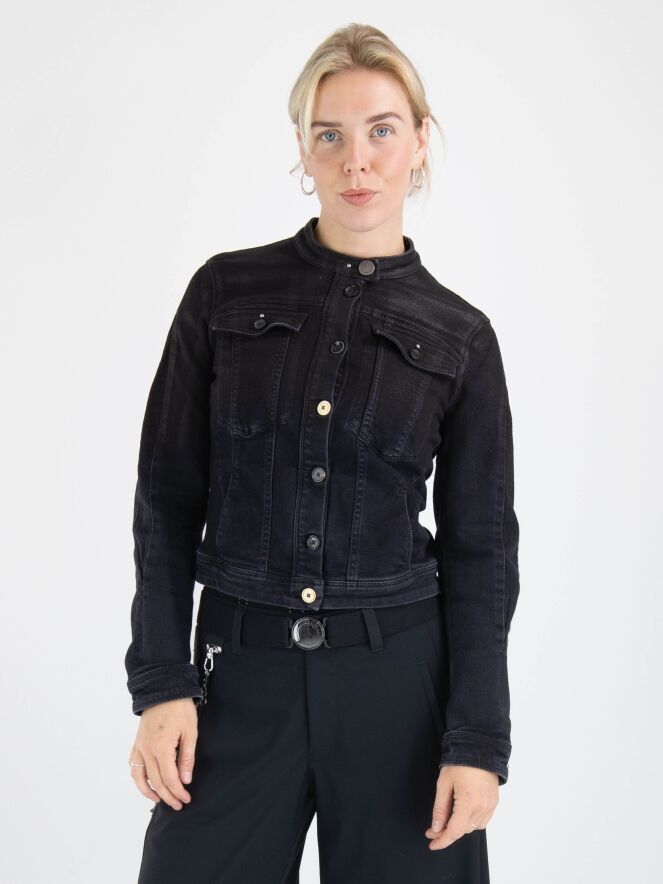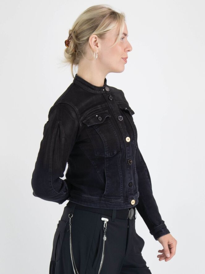 Een korte jeans blazer van High in een zwarte dark denim kleur. De blazer heeft borst en steekzakken en heeft een knoopssluiting. Deze blazer mag op de hand worden gewassen.