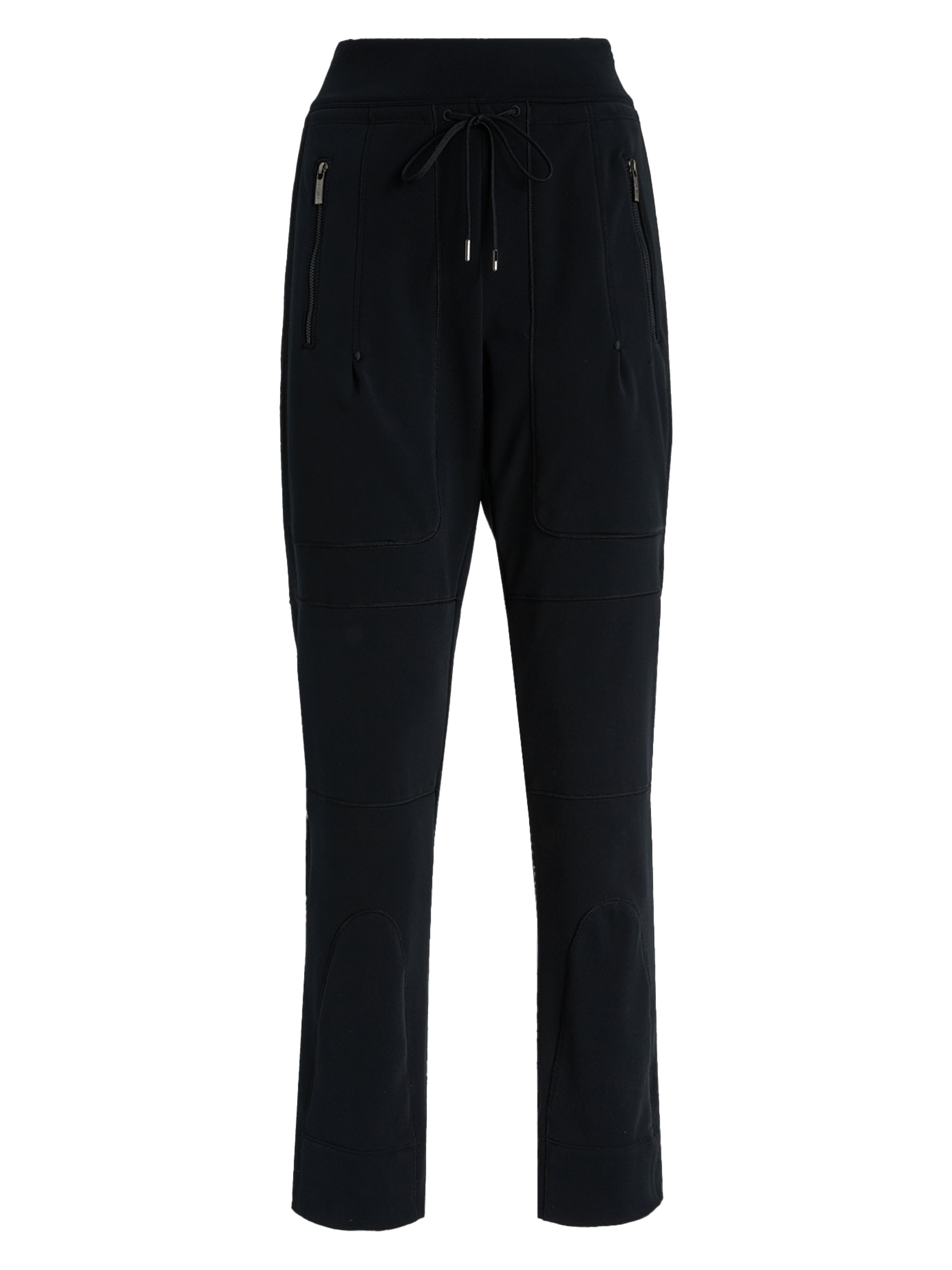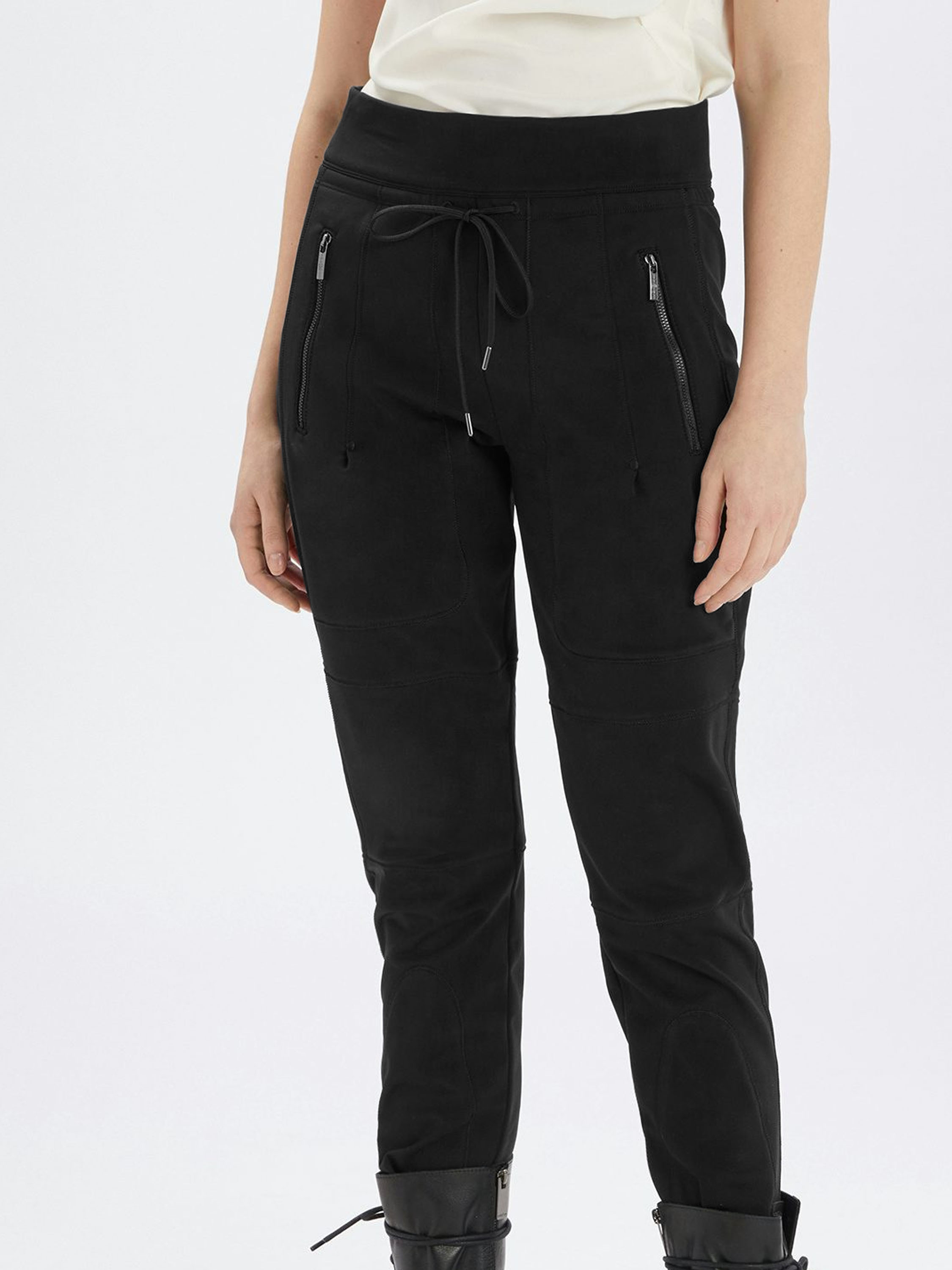 Een broek van High in de kleur zwart. In de taille zit een elastische band met daaronder een koord in tunnelverwerking waarmee de broek kan worden aangetrokken. De broek heeft meerdere decoratieve stiknaden bij de zakken en op het onderbeen. De zakken zijn voorzien van een ritssluiting. Deze broek kan op 30 graden worden gewassen.