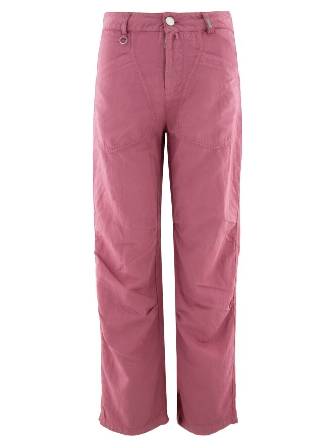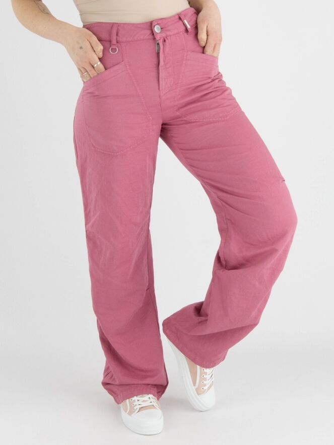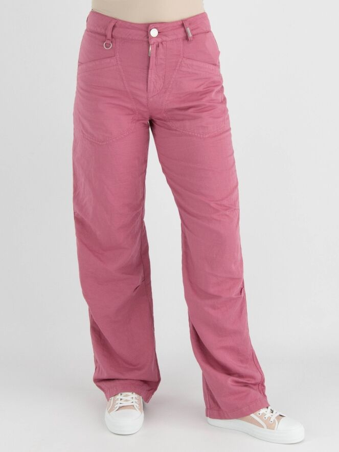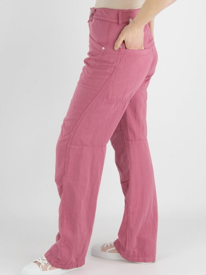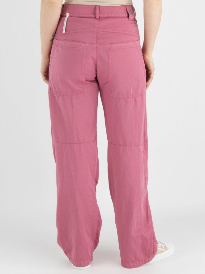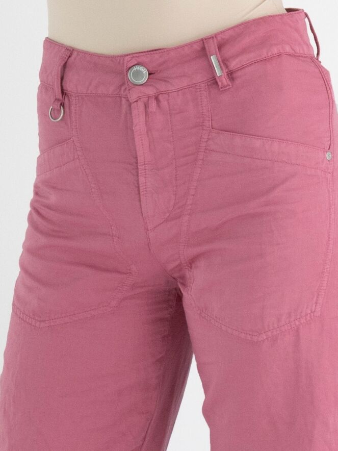 Een broek van High in een zachte koraalrode kleur. De broek heeft diagonaal gesneden steekzakken. Onder de knie zijn bij de zijnaden enkele plooien. Deze broek mag op 30 graden worden gewassen.