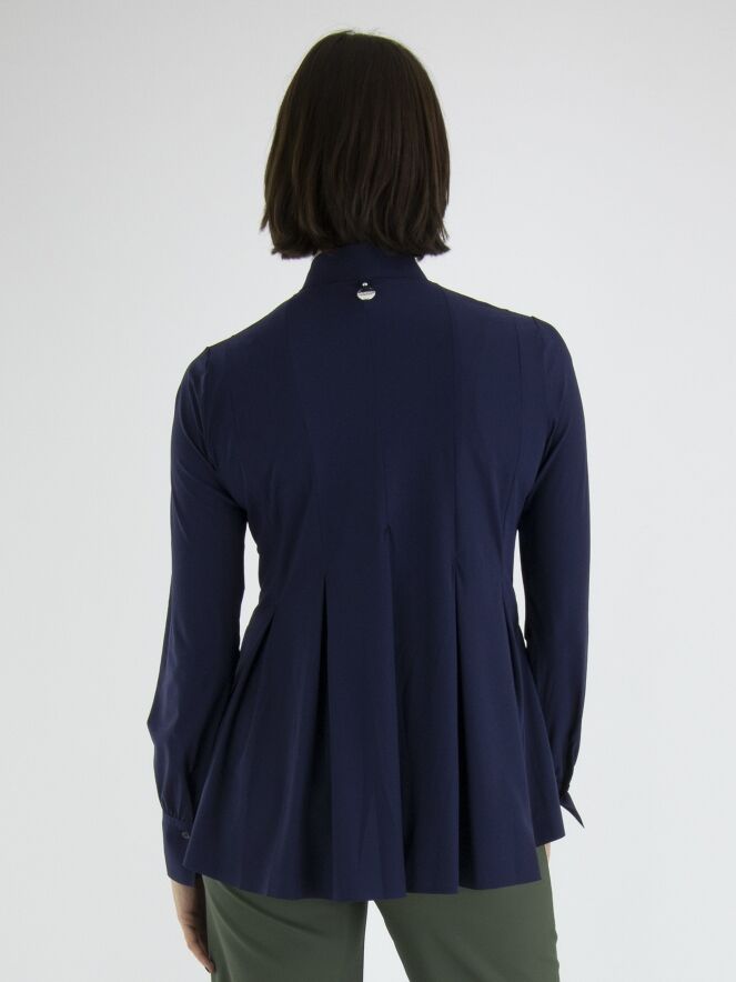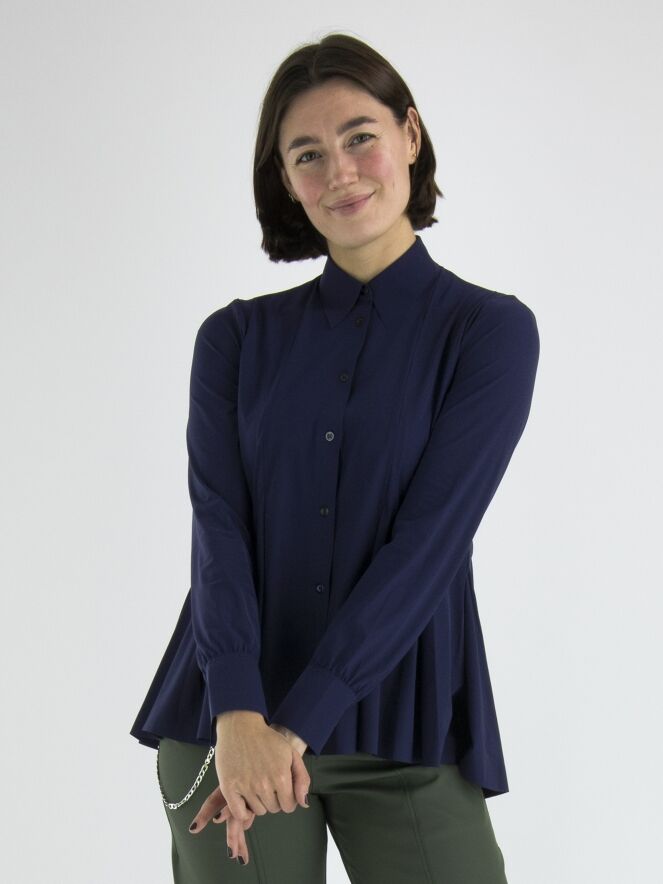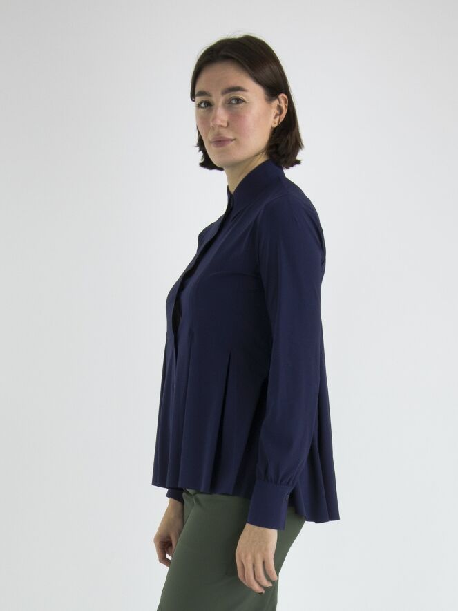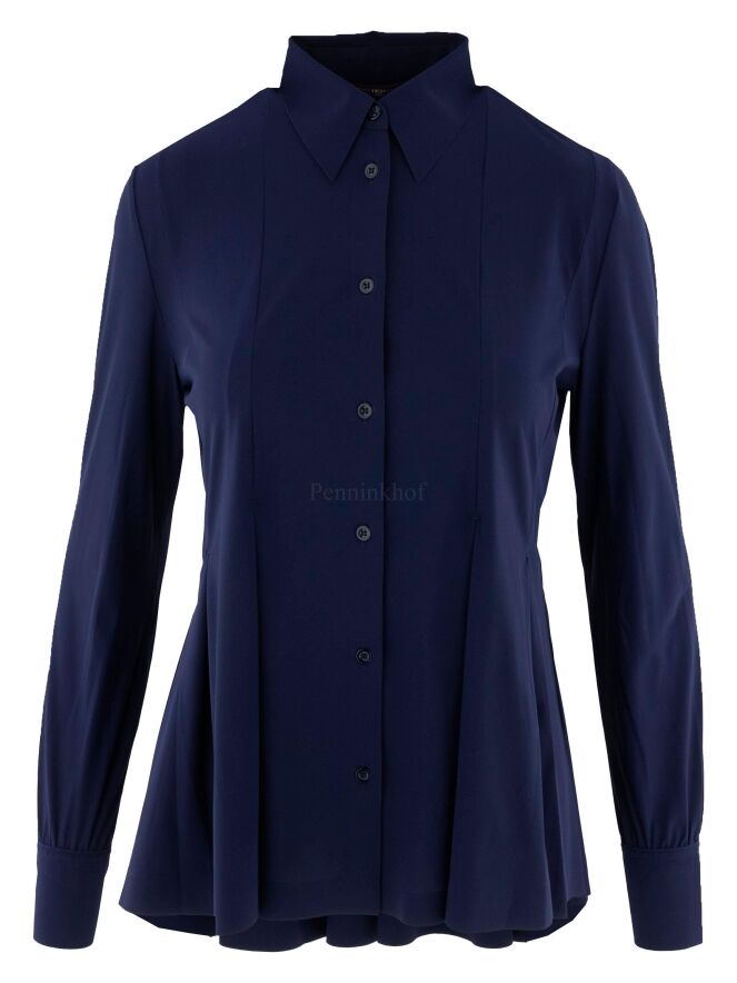 Een vest of en blouse van High in de kleur nachtblauw. Vanuit de taille zijn meerdere bandplooien waardoor het vest een A Lijn krijgt vanuit de taille. Dit vest mag op de hand worden gewassen.