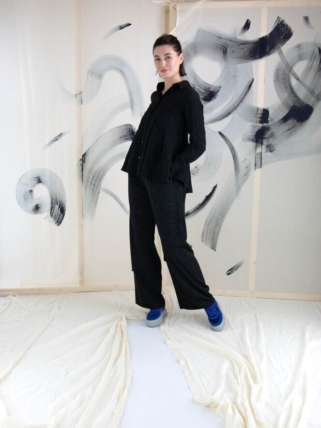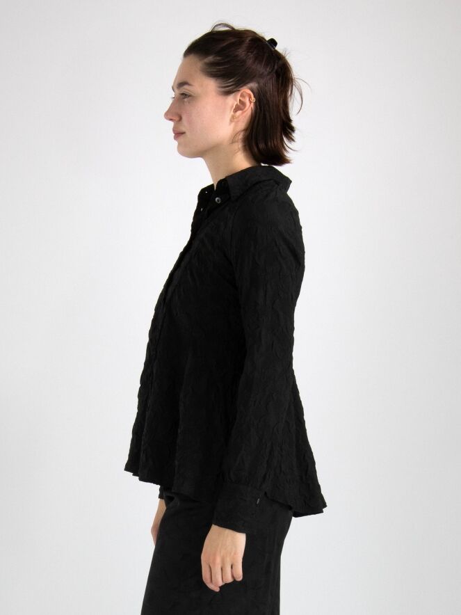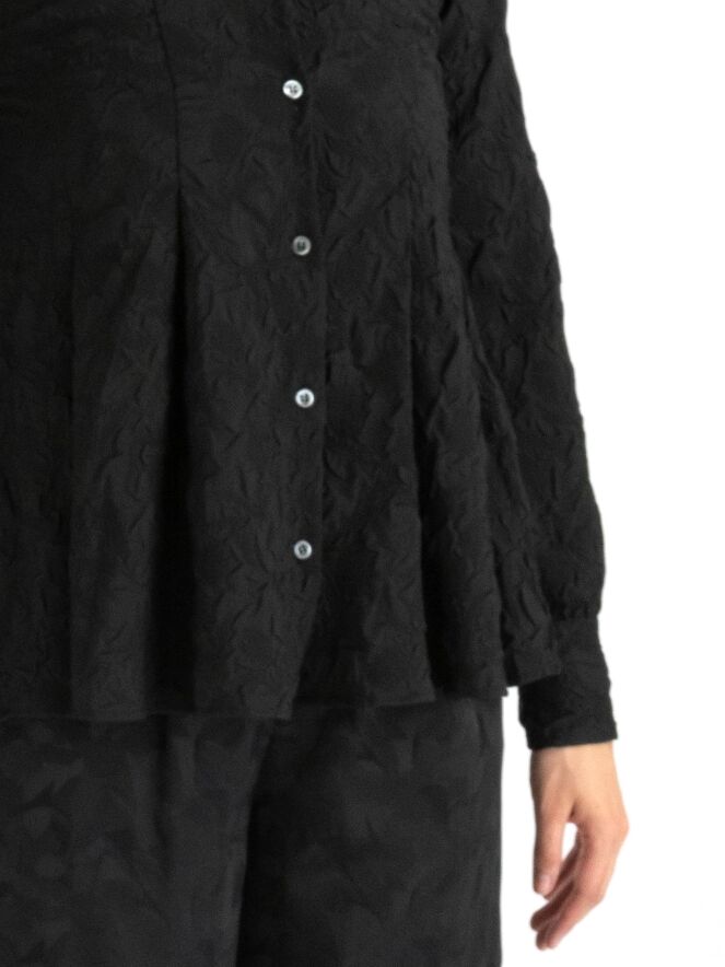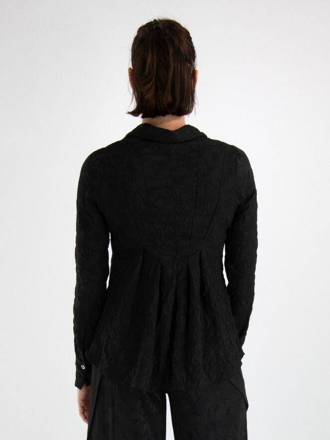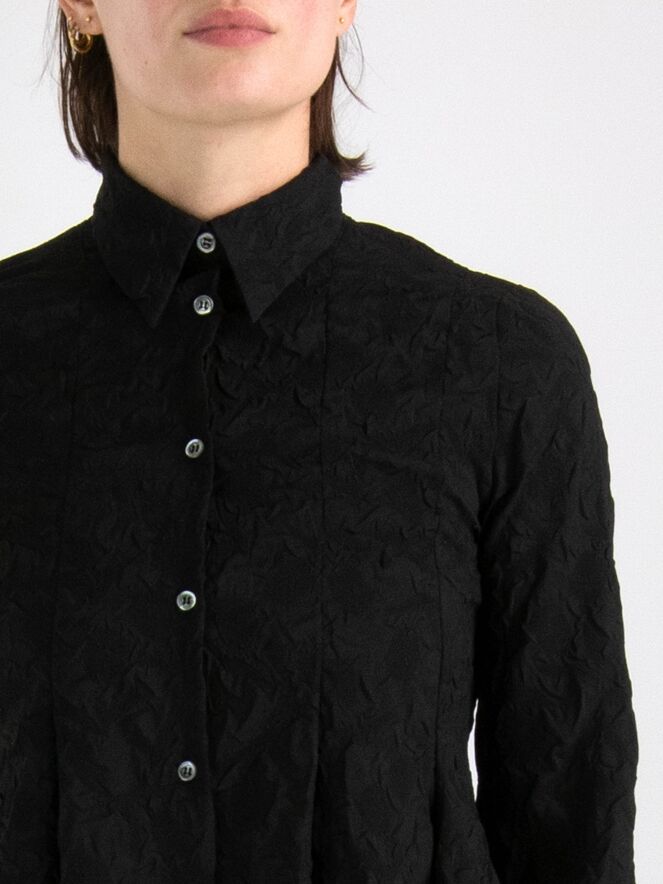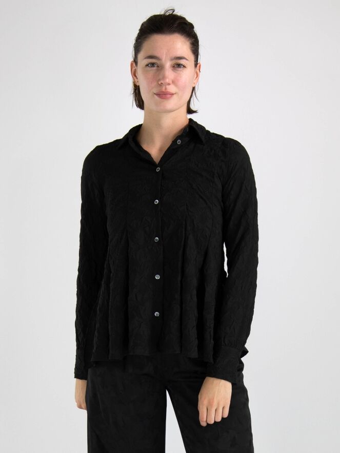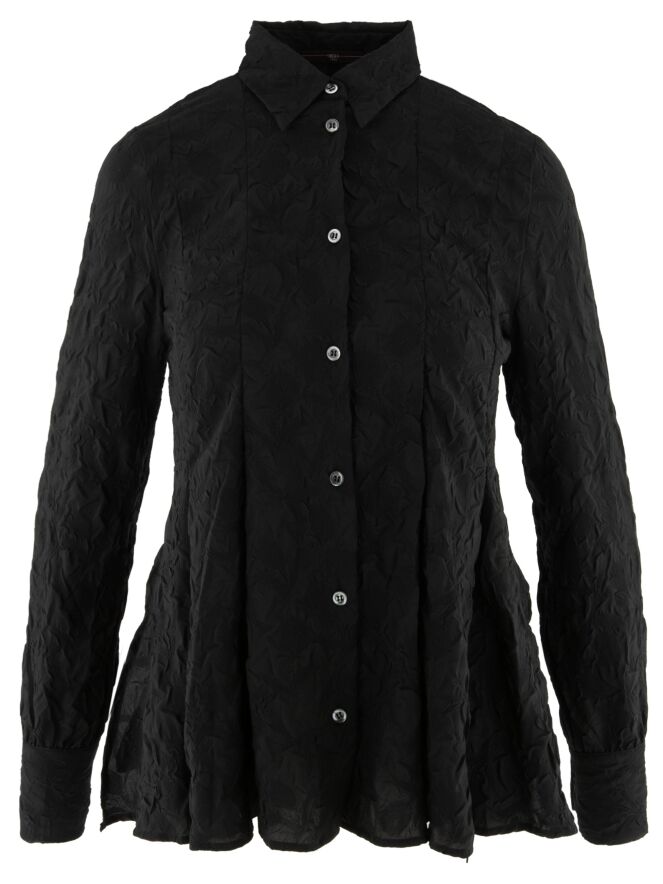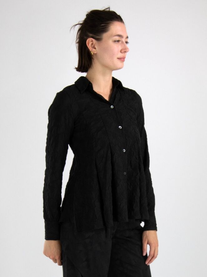 Een blouse van High in de kleur zwart. De stof is fijn gesmokt. De blouse heeft een licht getailleerde belijning en aan de onderkant is aan beide zijkanten een split. Deze blouse mag op de hand worden gewassen.
