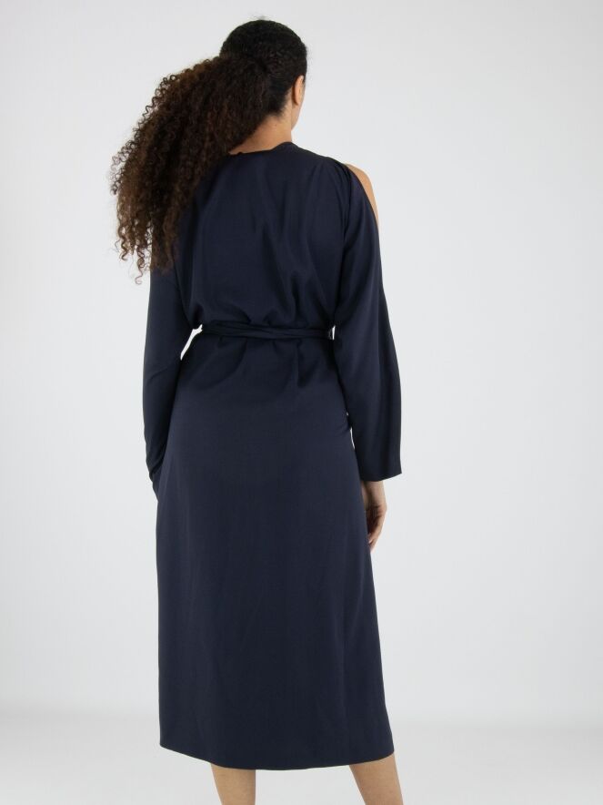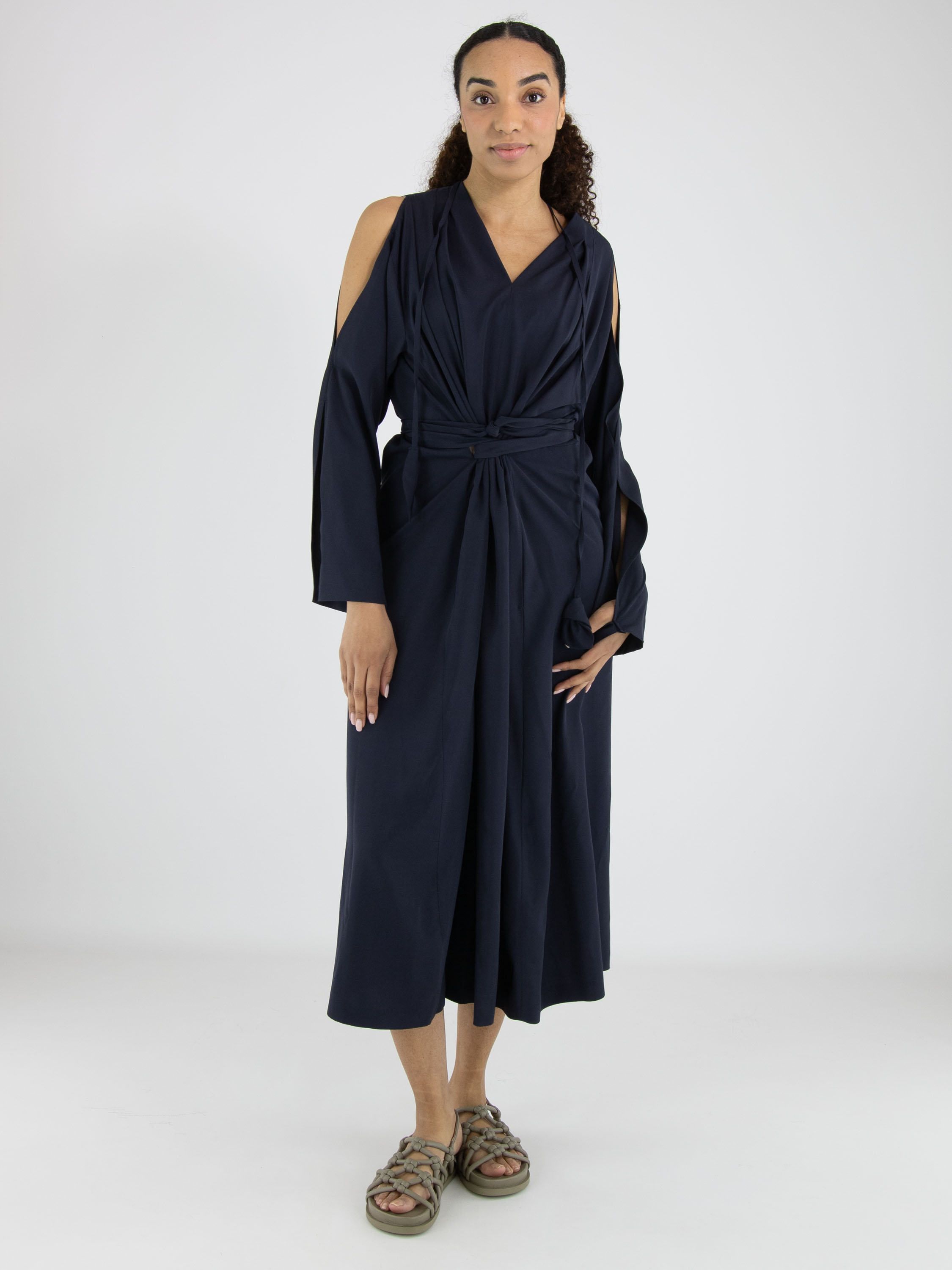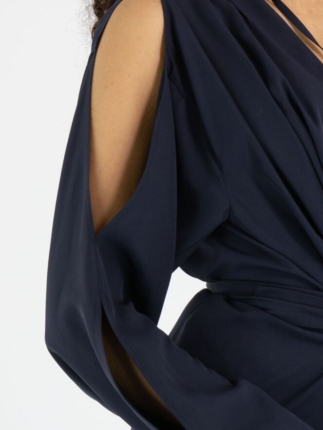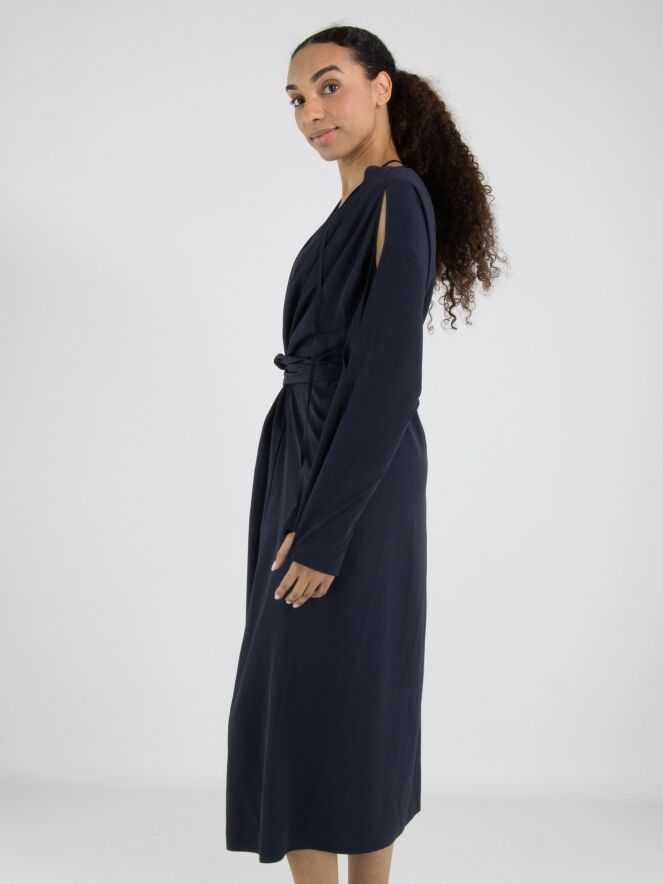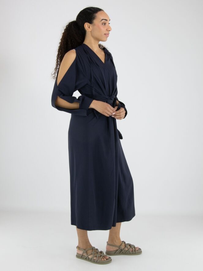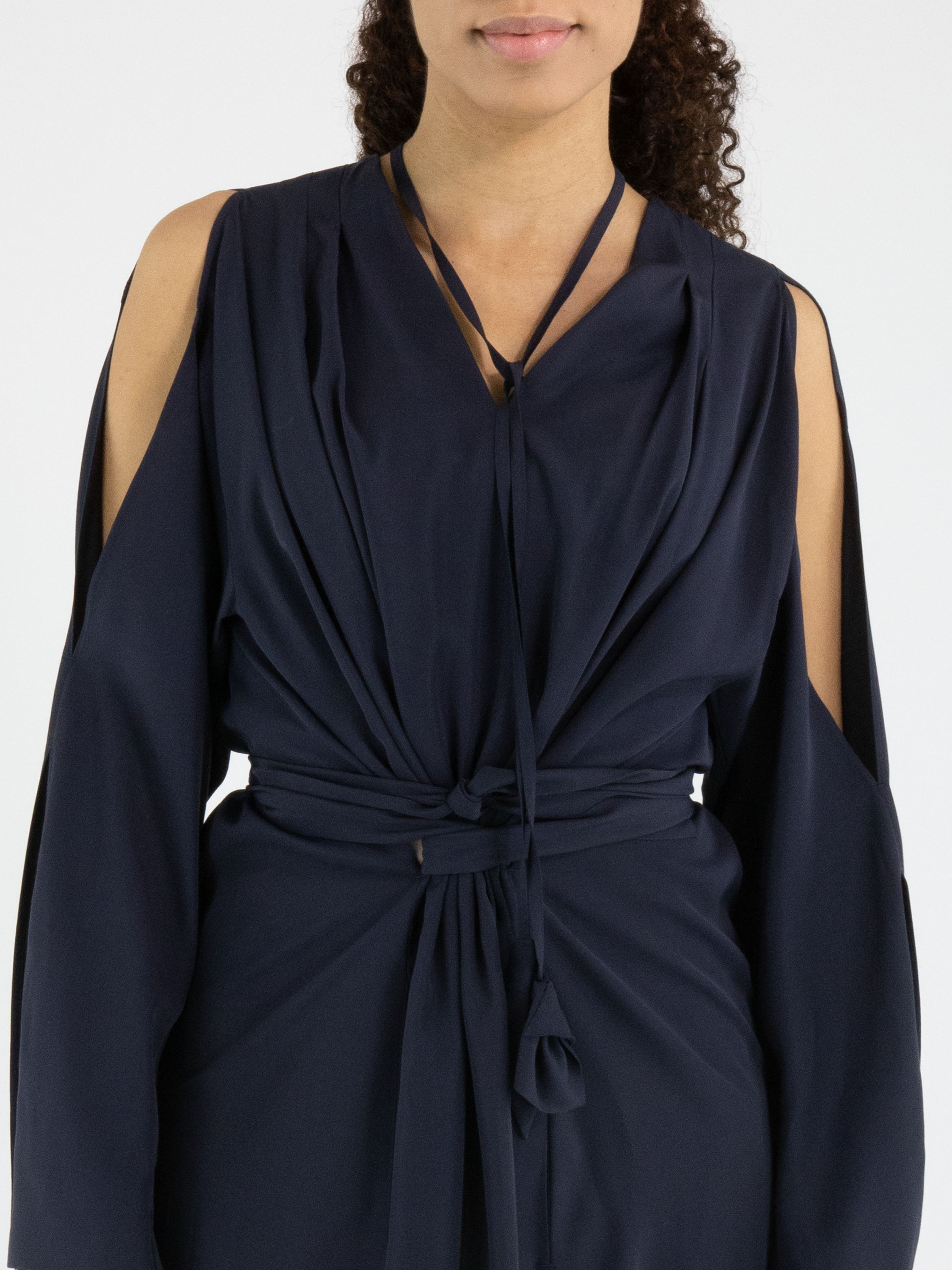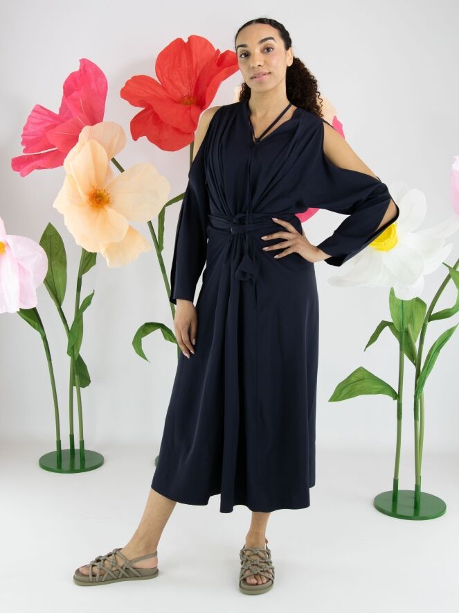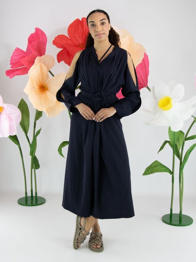 Robe de High dans une teinte rouge éclatante. De chaque côté de l’encolure en V, deux plis créent une belle fluidité et une allure féminine. Deux longs liens partent du col et se terminent par des feuilles décoratives, apportant une touche originale et élégante. À la taille, une ceinture passe par les côtés vers l’intérieur de la robe, permettant de souligner subtilement la silhouette. La partie supérieure des manches est ouverte de l’épaule jusqu’au coude. Des poches sont intégrées à hauteur de taille. Cette robe ne doit pas être lavée.
