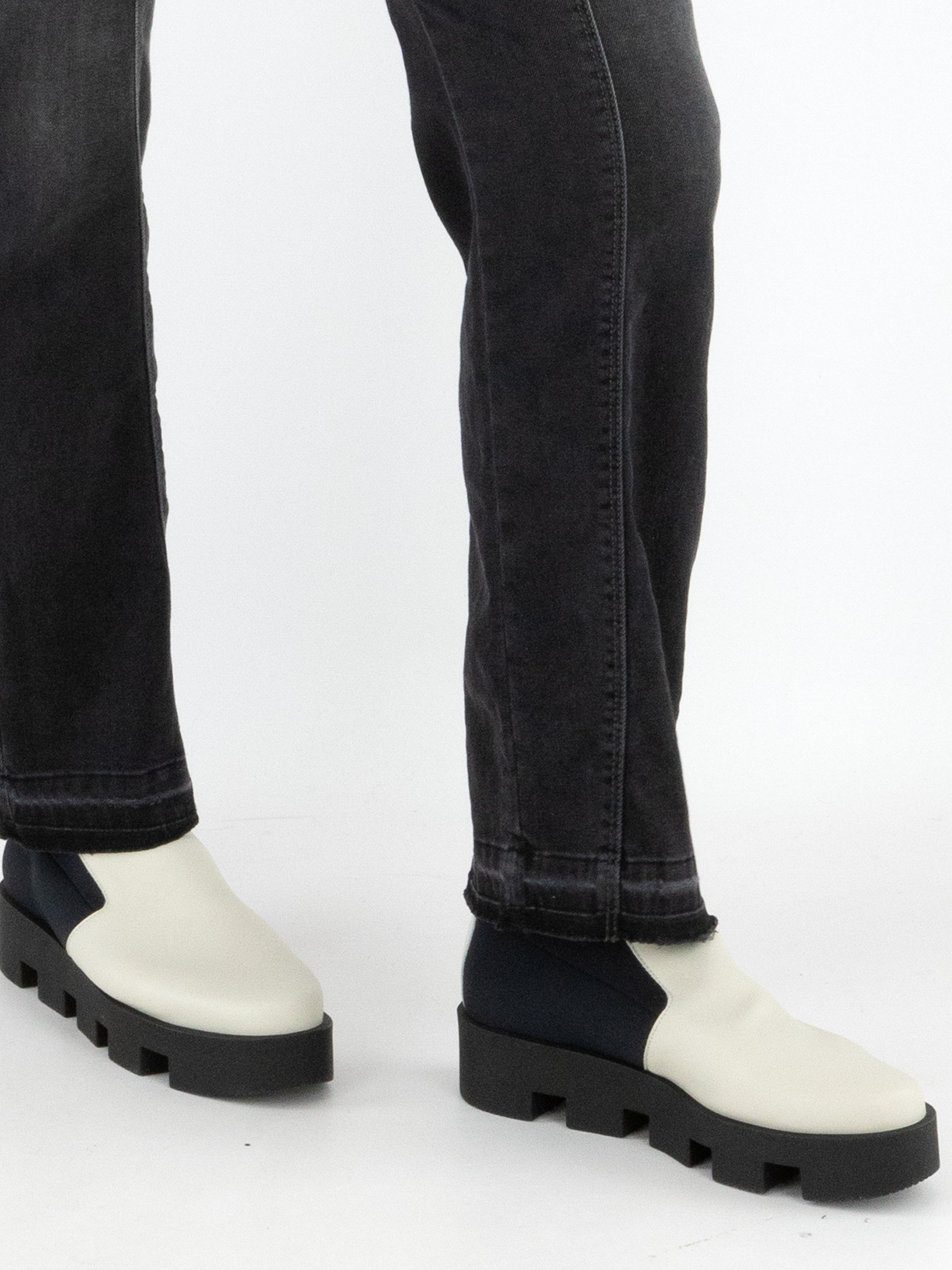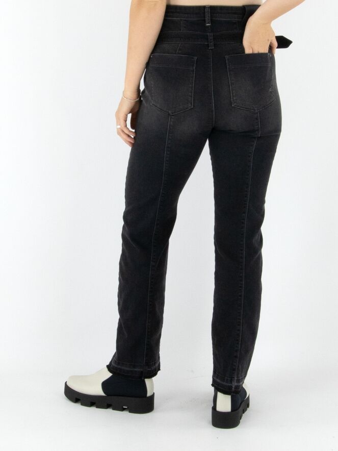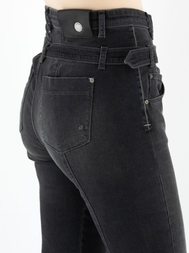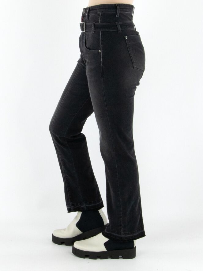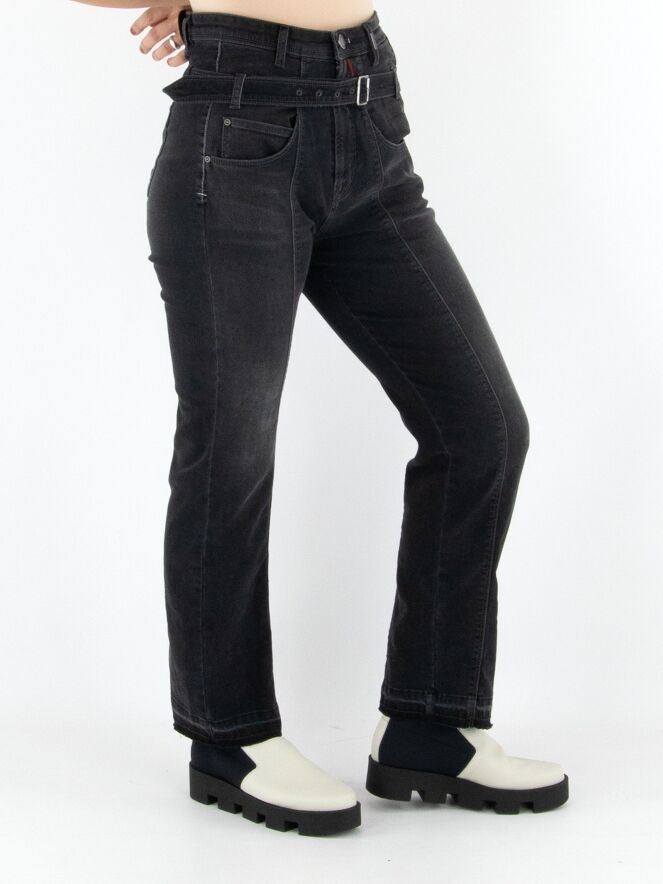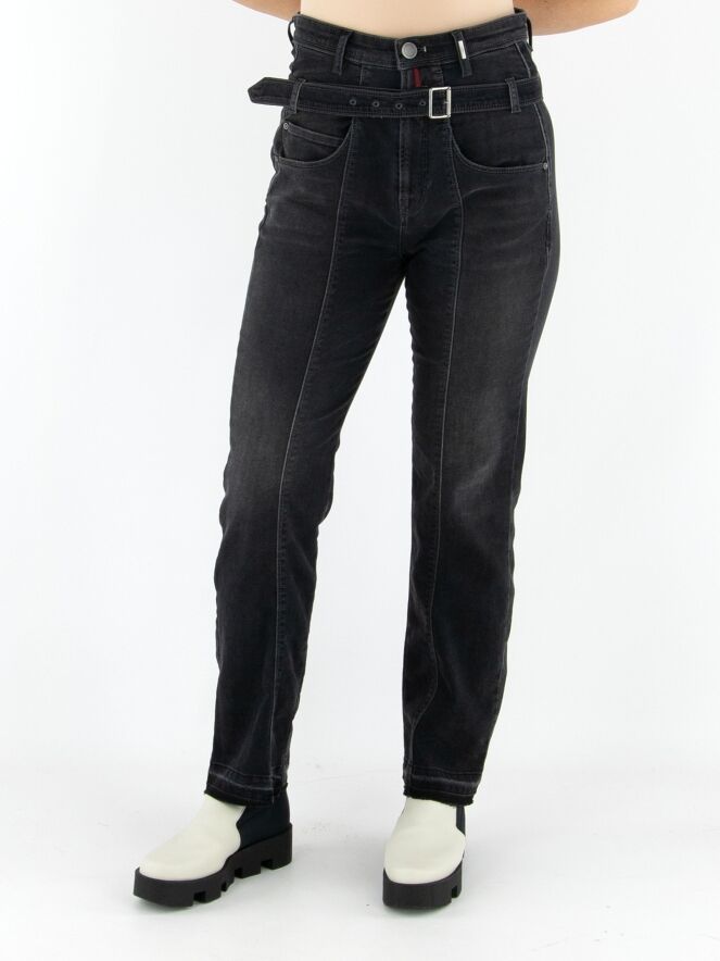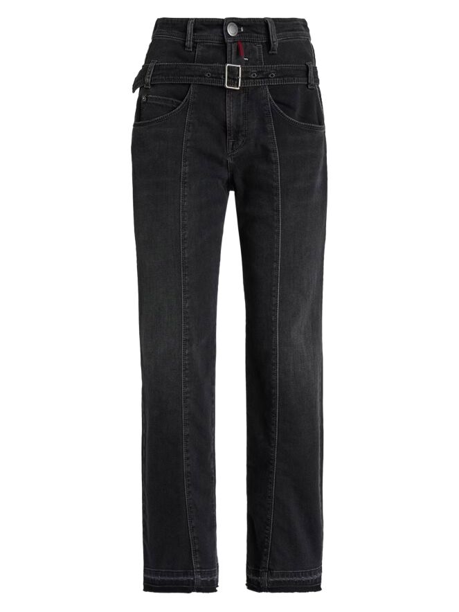 Een hooggesloten used jeans van High in de kleur antraciet. De jeans is uitgevoerd in een klassiek 5-pocket model en voorzien van een ceintuur in dezelfde stof. De randen aan de onderzijde van de pijpen zijn subtiel gerafeld, wat de jeans een nonchalant en modern karakter geeft. Deze jeans kan op 30 graden worden gewassen.