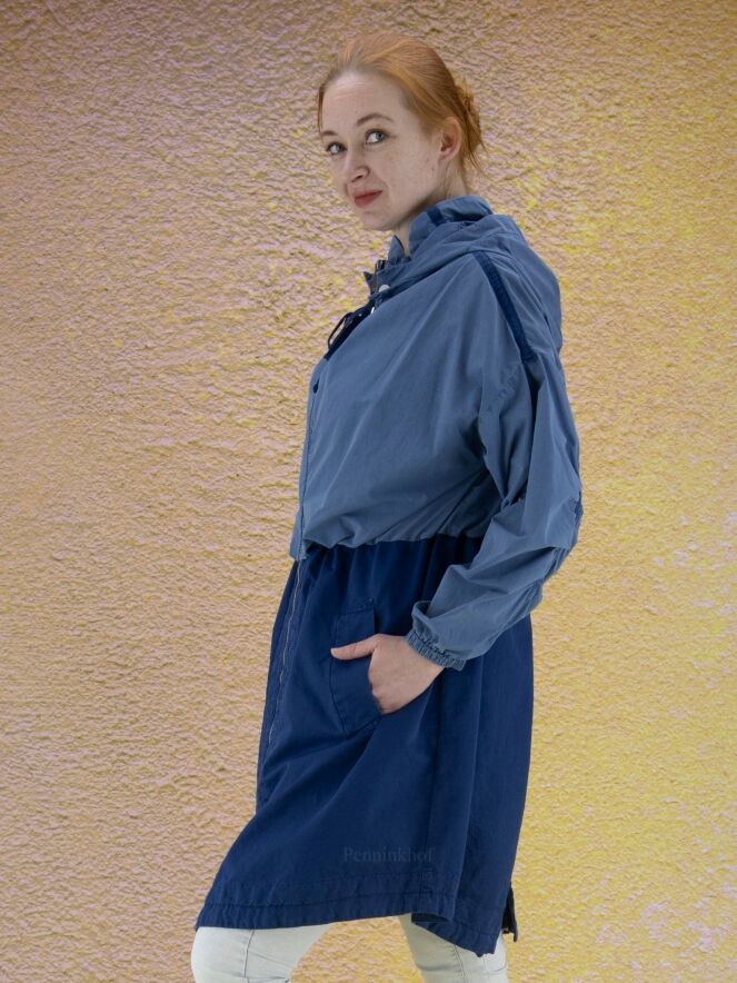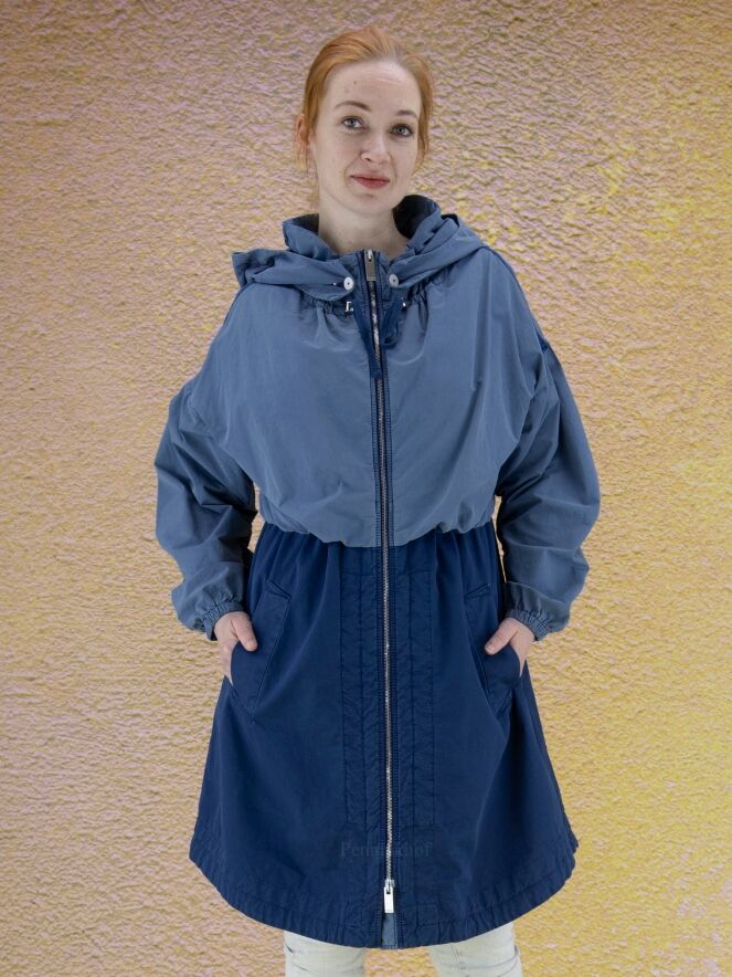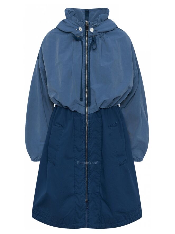 Een halflange coat van High in 2 kleuren blauw. Boven de taille is de stof in een zachte mat blauwe kleur. Onder de taille heeft de coat een kobaltblauwe kleur. De capuchon is afknoopbaar. Over de bovenkant van de mouwen is een bies waarlangs de stof fijn geplooid is. Aan het uiteinde van de mouwen is een smalle elastieken boord.De coat heeft een zilverkleurige ritssluiting en steekzakken. Deze coat mag niet worden gewassen.