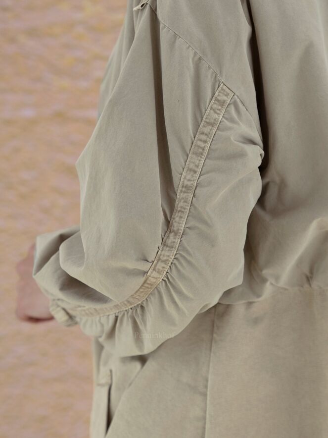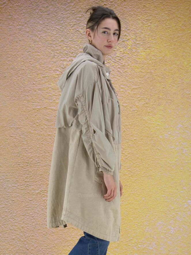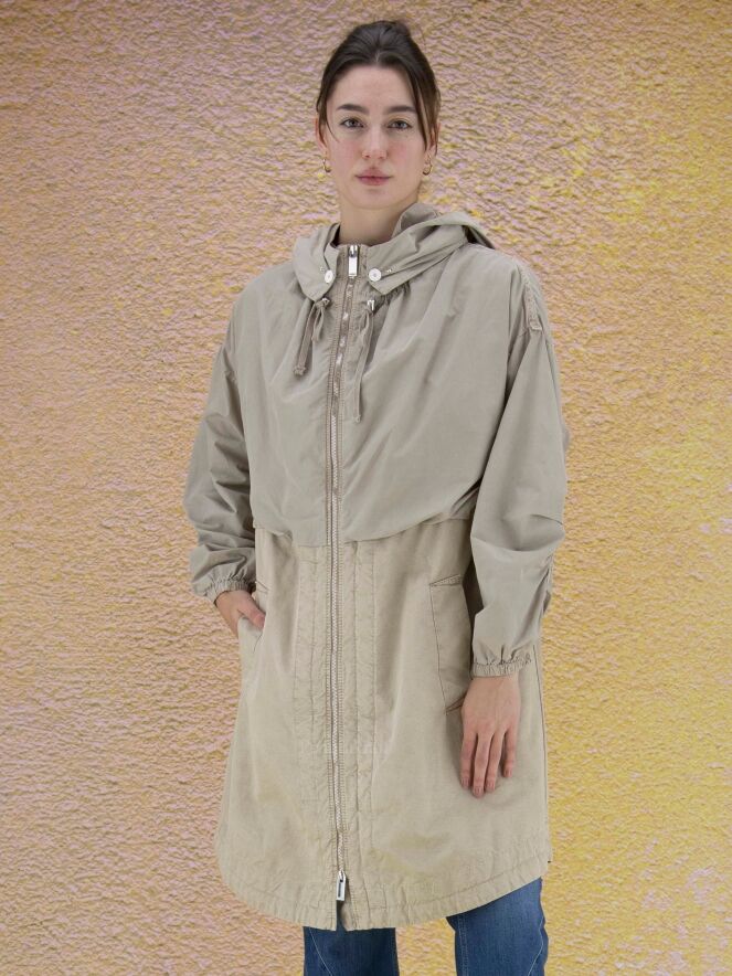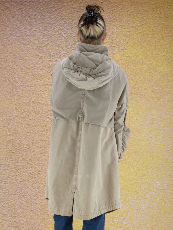 Een halflange coat van High in 2 zand tinten. Boven de taille is de stof in een pastel zand kleur. Onder de taille heeft de coat een volle zandkleur. De capuchon is afknoopbaar. Over de bovenkant van de mouwen is een bies waarlangs de stof fijn geplooid is. Aan het uiteinde van de mouwen is een smalle elastieken boord. De coat heeft een zilverkleurige ritssluiting en steekzakken. Deze coat mag niet worden gewassen.