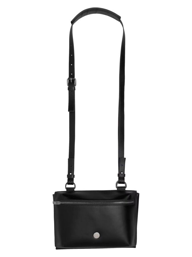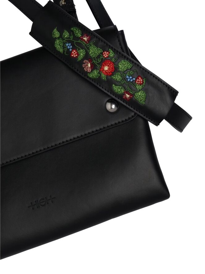 Een design schoudertas van High in de kleur zwart. De tas is in 2 delen waarvan het voorste deel een ritssluiting heeft en het achterste deel 2 drukknopen heeft. De schouderband is verstelbaar en heeft op de schouder een decoratief geborduurd bloem dessin.
