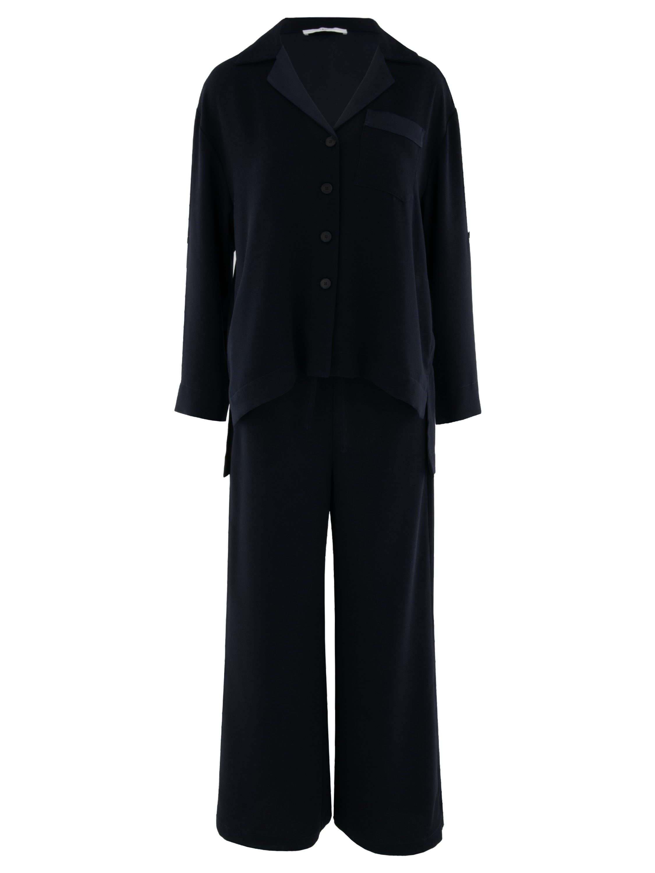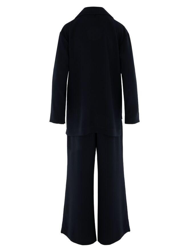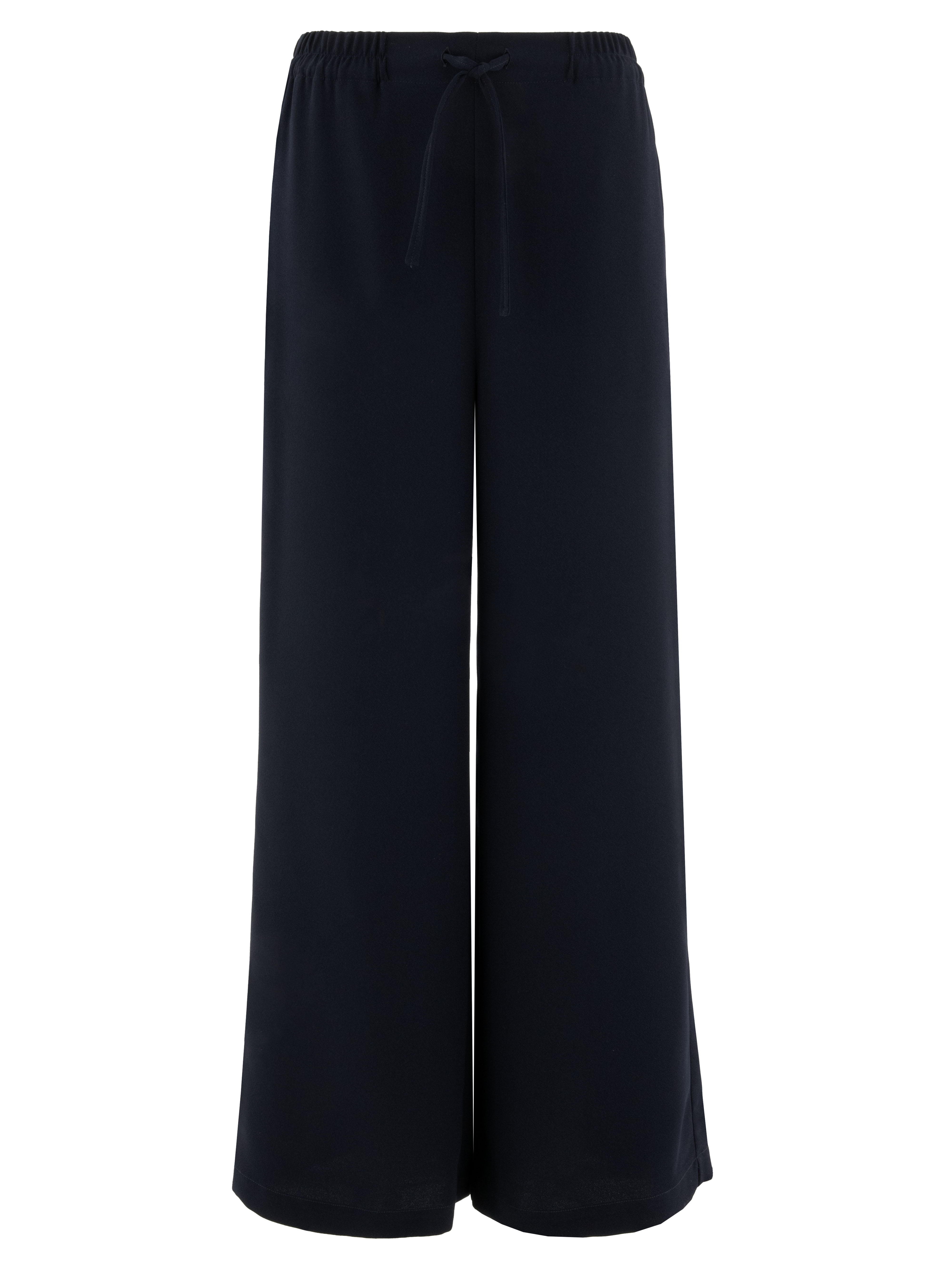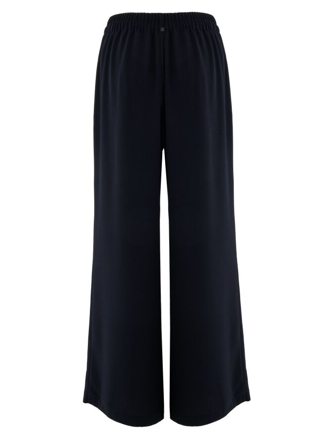 Broekpak van High in een elegante marineblauwe tint. De pantalon heeft in de taille een elastische band met een fijn geplooide structuur. Een koordceintuur in tunnelverwerking zorgt ervoor dat de taille naar wens kan worden aangetrokken. De broek heeft wijde pijpen die het silhouet een moderne en vloeiende uitstraling geven.