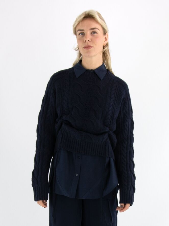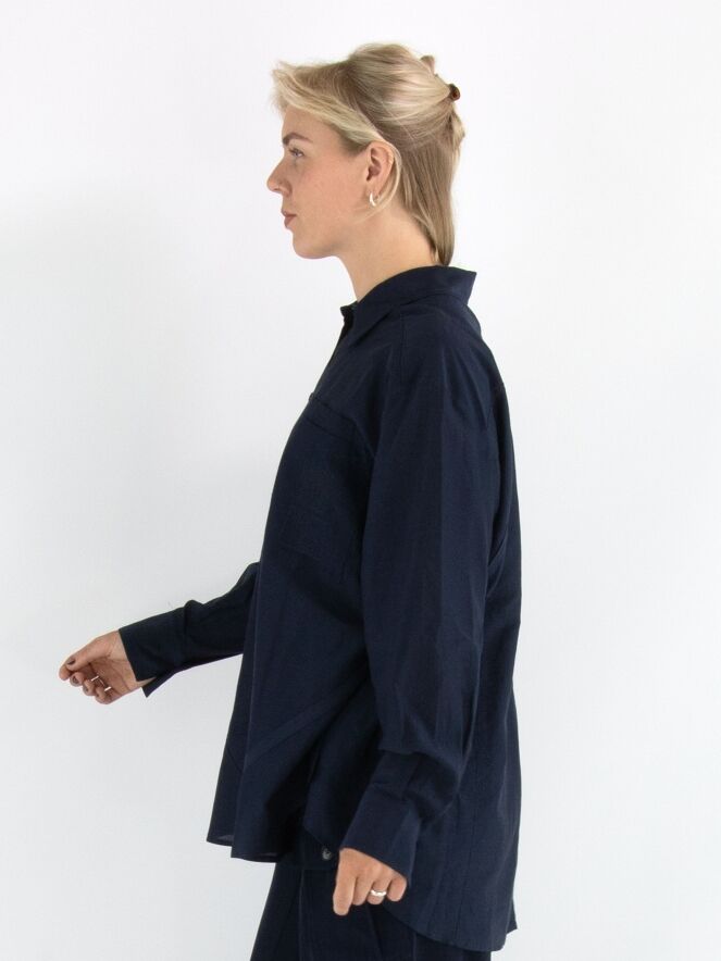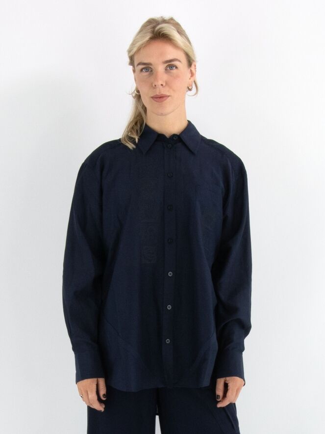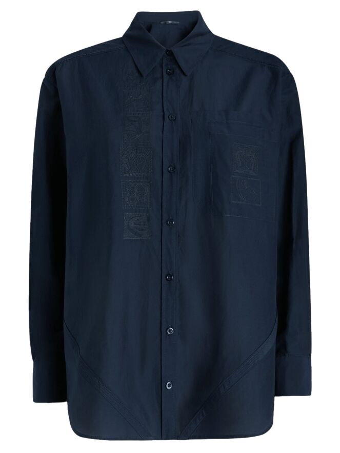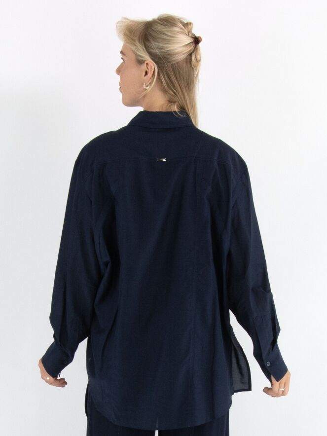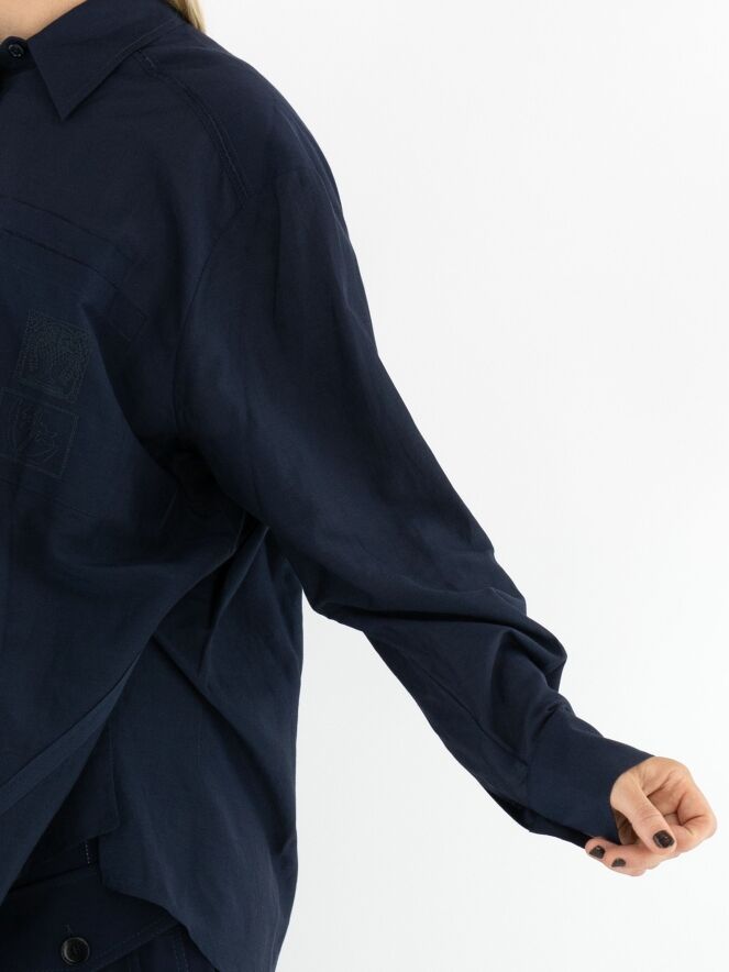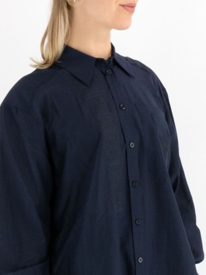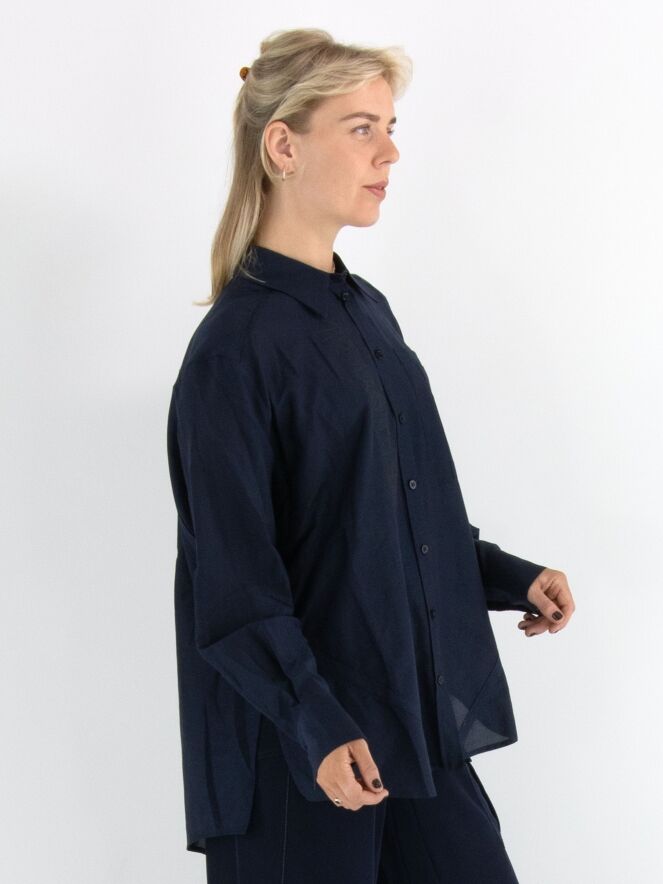Een wijde blouse van High in de kleur marineblauw. Aan de voorzijde bevinden zich meerdere kleine vierkante vakjes met gestikte bloemmotieven. Aan de onderkant zit aan beide zijkanten een split. Deze blouse mag met de hand worden gewassen.