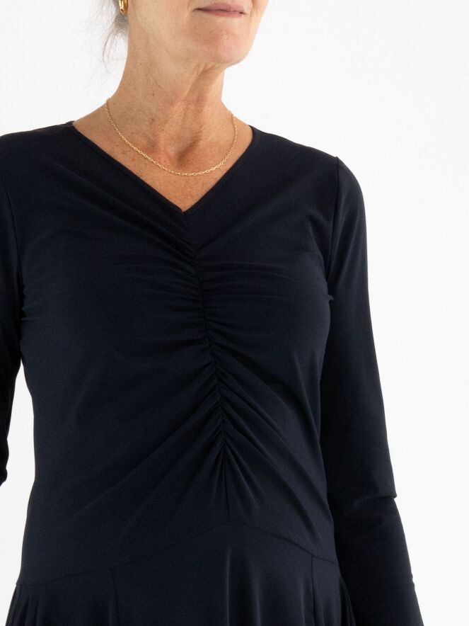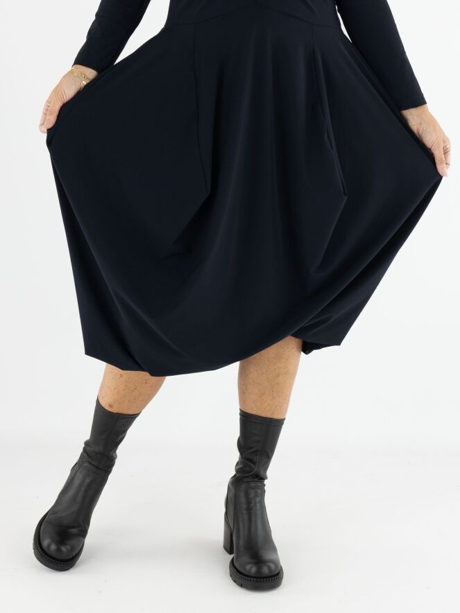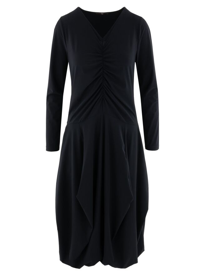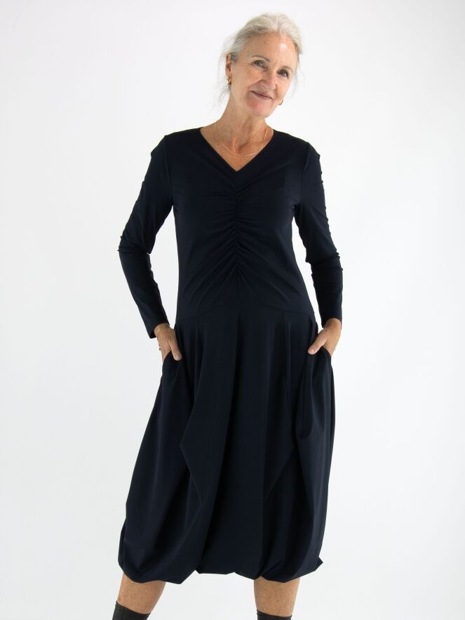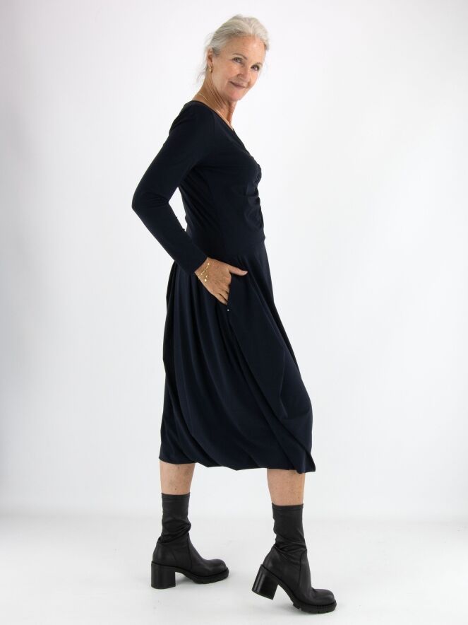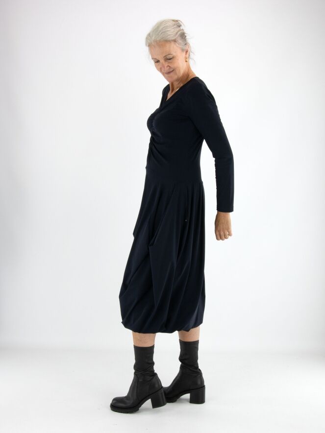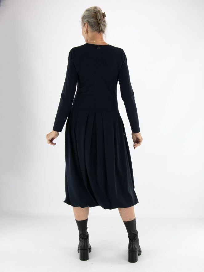 Een jurk van High in de kleur marineblauw. De jurk heeft een V-hals en lange mouwen. Vanuit het midden van de V-hals loopt een stiknaad naar beneden, waarlangs de stof fijn is geplooid. In de zoom aan de onderkant is de stof met elastisch garen fijn geplooid gestikt, wat een ballonvormig effect geeft. Ter hoogte van de taille bevinden zich steekzakken. Aan de achterkant zit op taillehoogte een stiknaad waarlangs de stof is geplisseerd. Deze jurk mag op 30 graden worden gewassen.