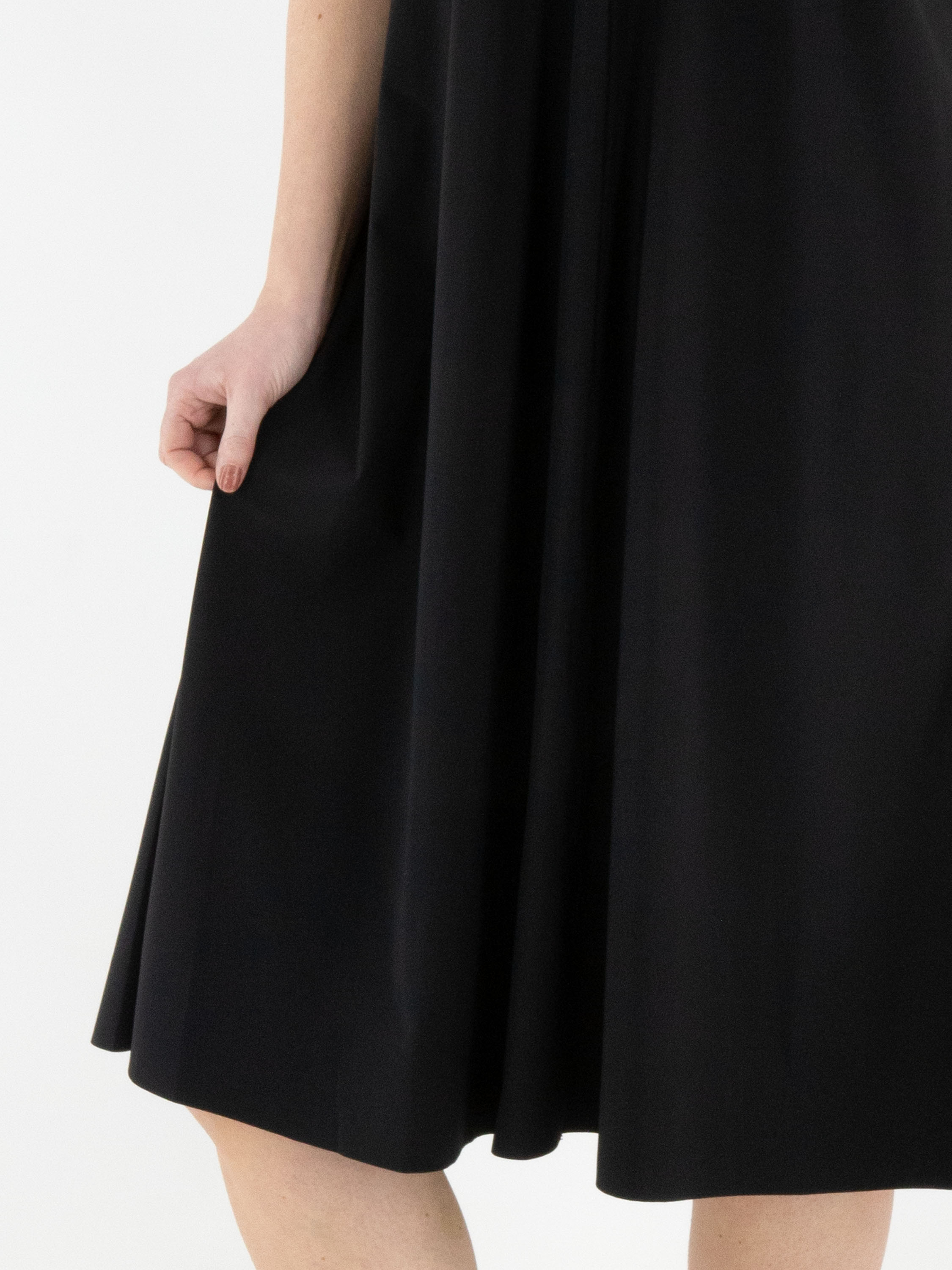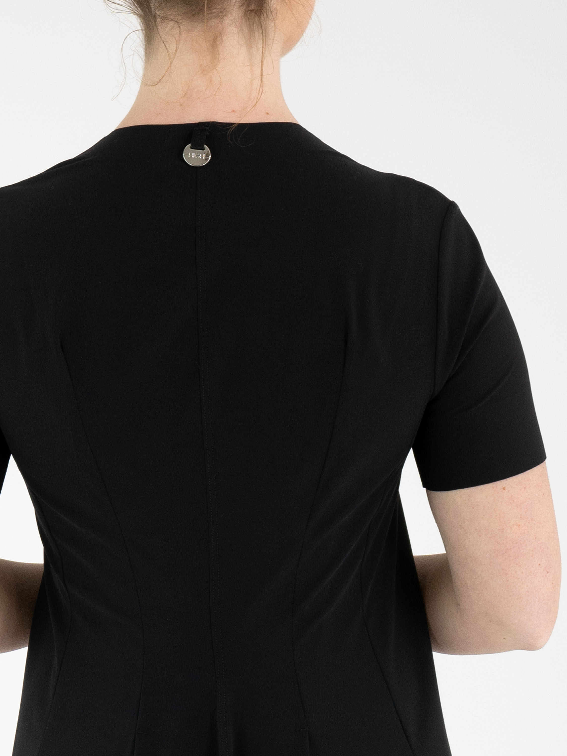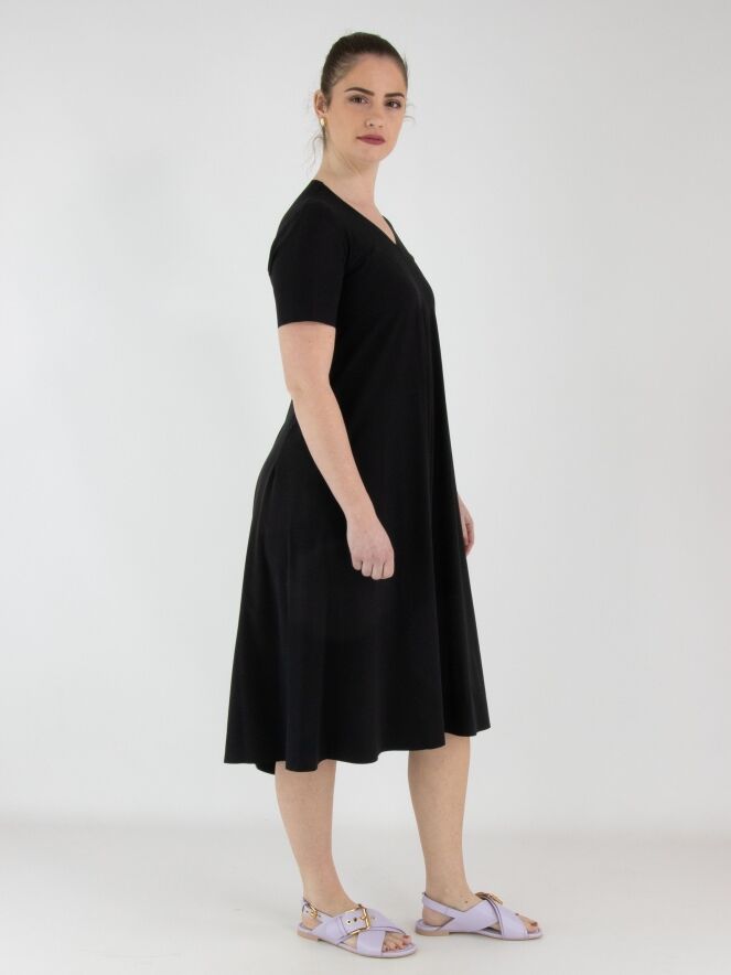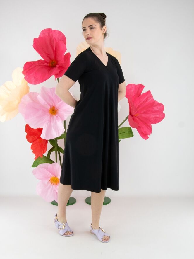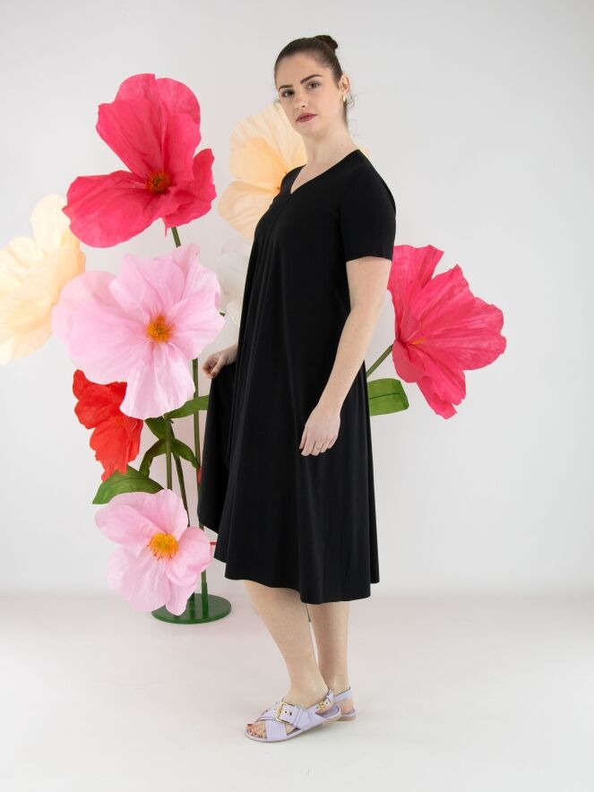 Een jurk van High in de kleur zwart. De jurk heeft een V-hals en korte mouwen. De jurk heeft een lichte A-lijn en mag op de hand worden gewassen.