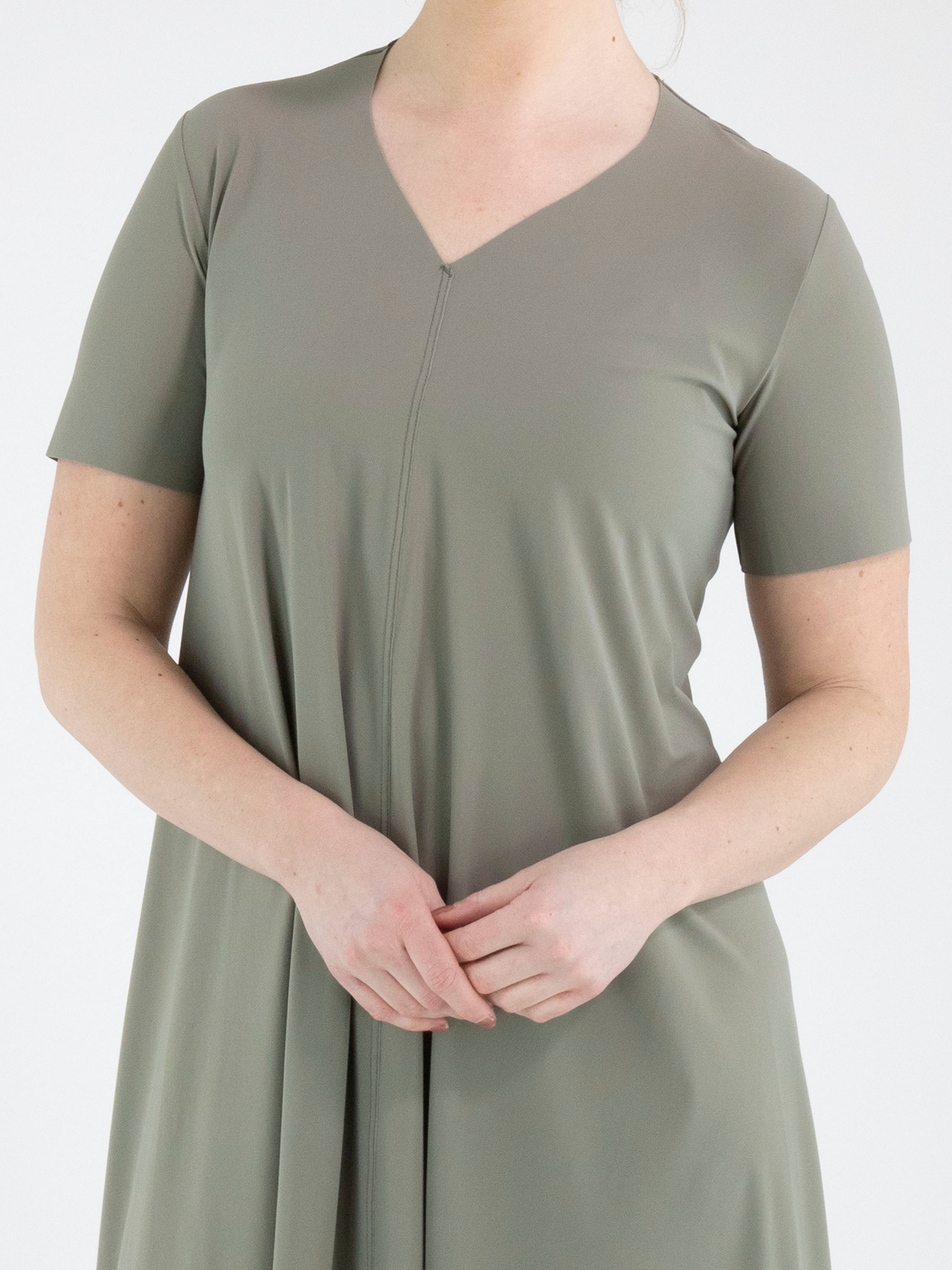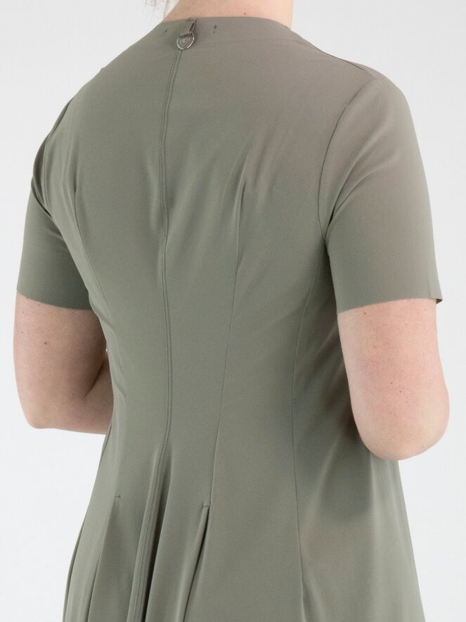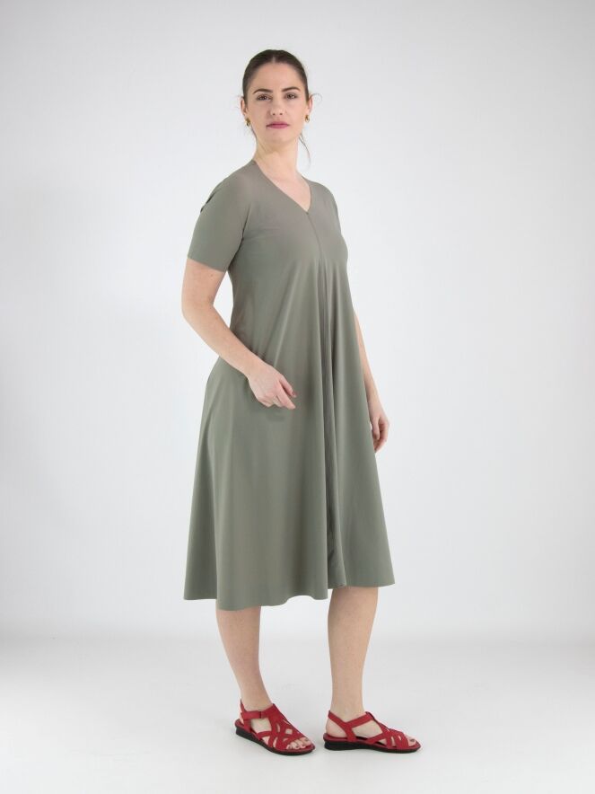 Een jurk van High in de kleur olijfgroen. De jurk heeft een V-hals en korte mouwen. De jurk heeft een lichte A-lijn en mag op de hand worden gewassen.