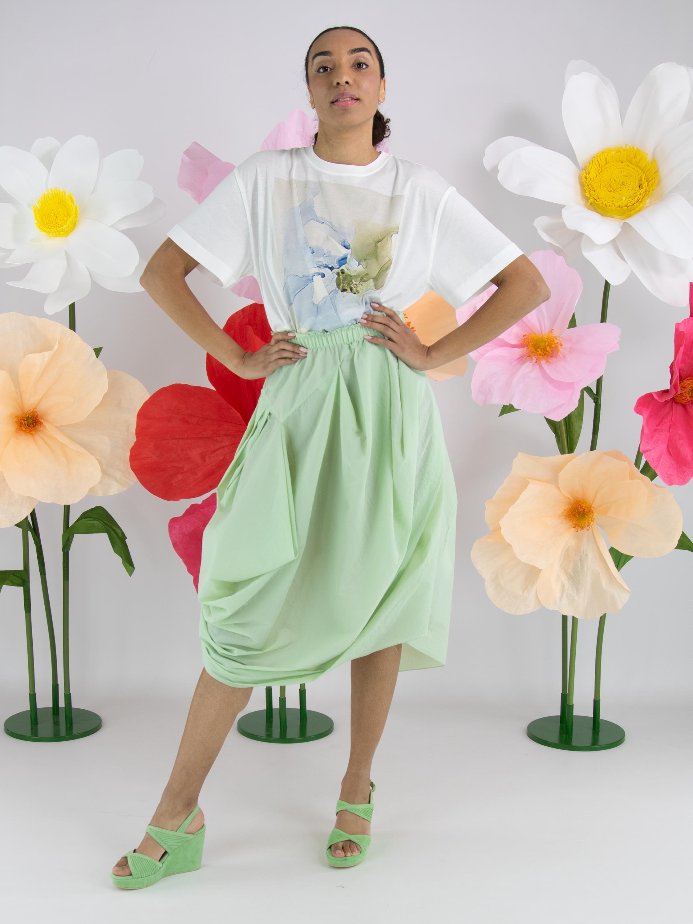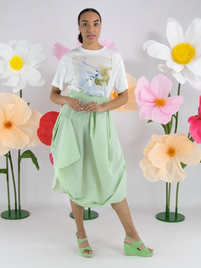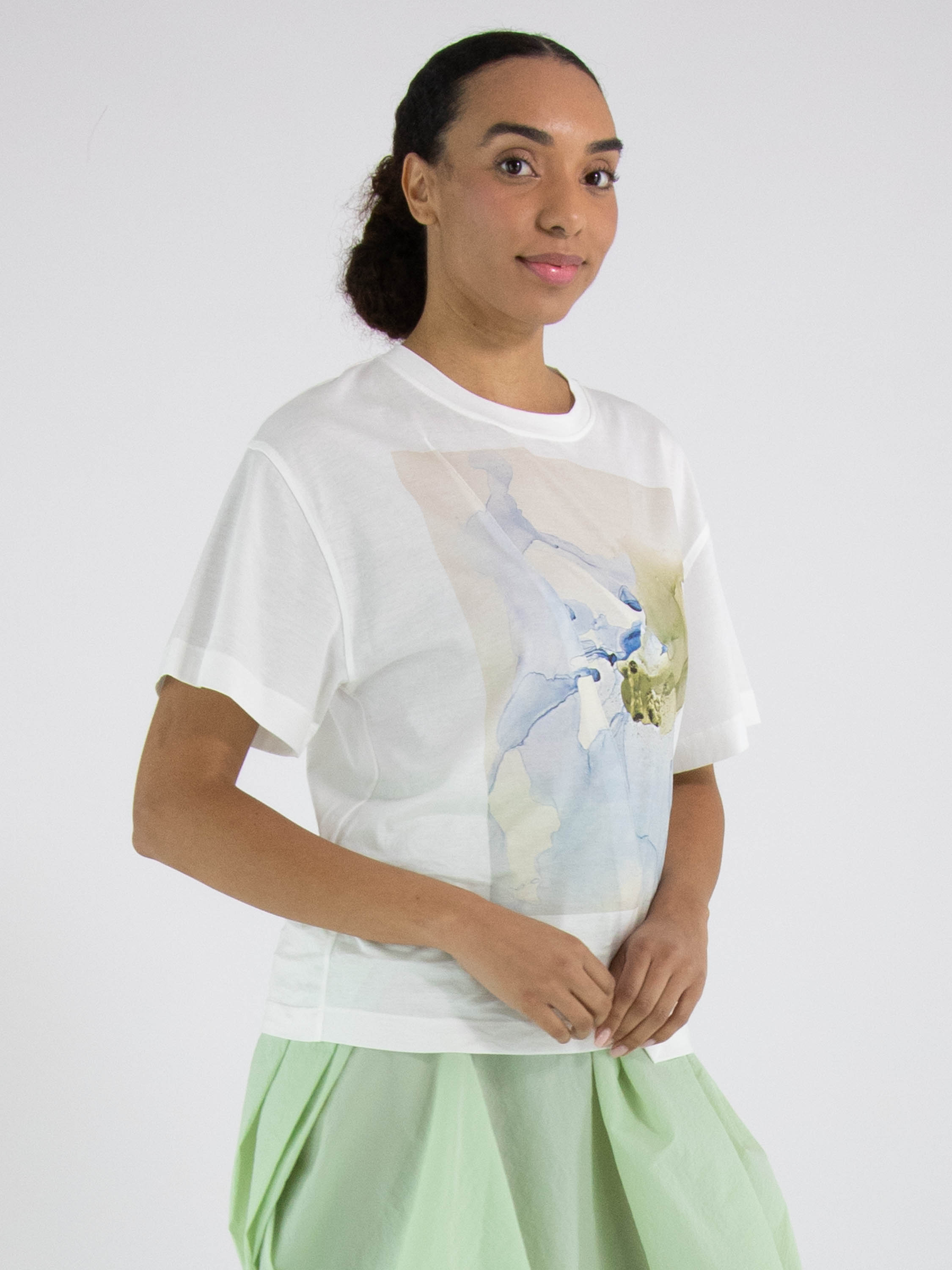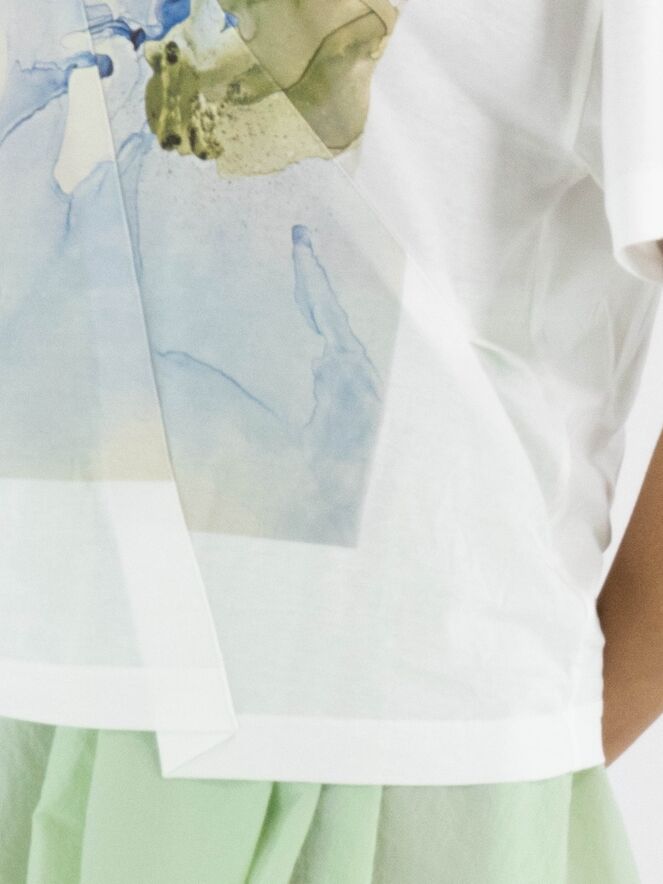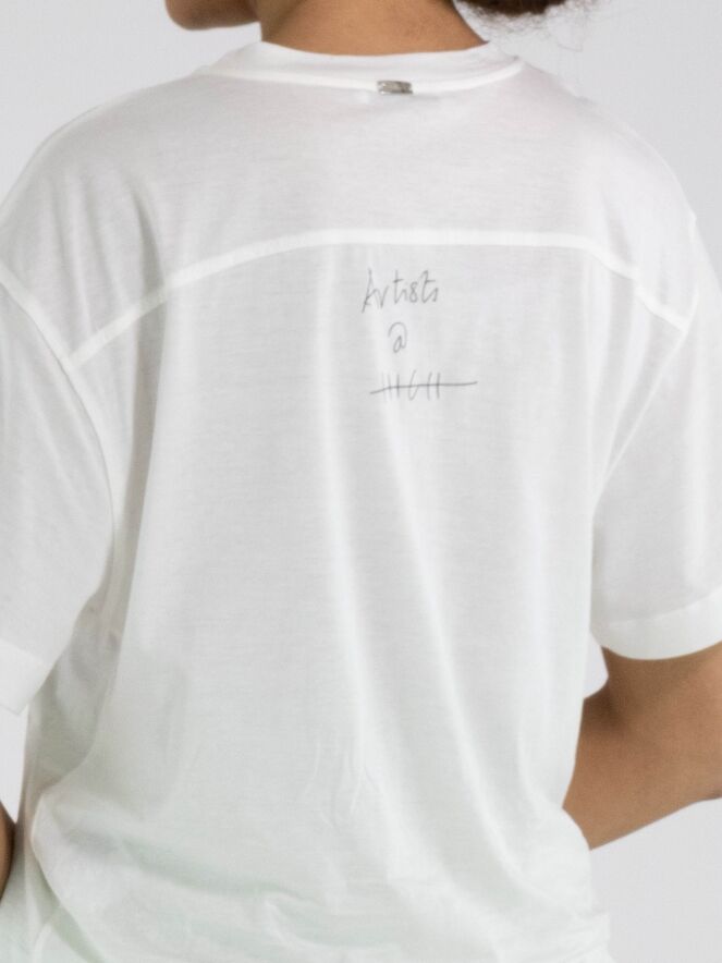 Een shirt van High in de kleur wit. Aan de voorzijde staat een grafische foto van fotograaf Manuela de la Vega Castro in de kleuren olijfgroen en blauw. Vanuit de rechterschouder lopen twee diagonale stiknaden naar beneden. Het shirt heeft korte mouwen en een ronde hals en mag op de hand worden gewassen.