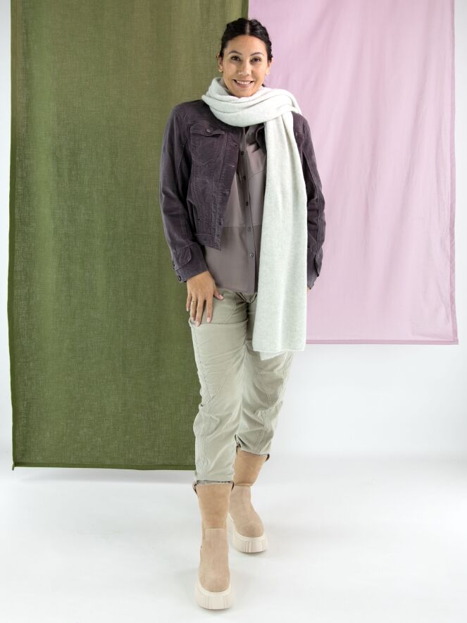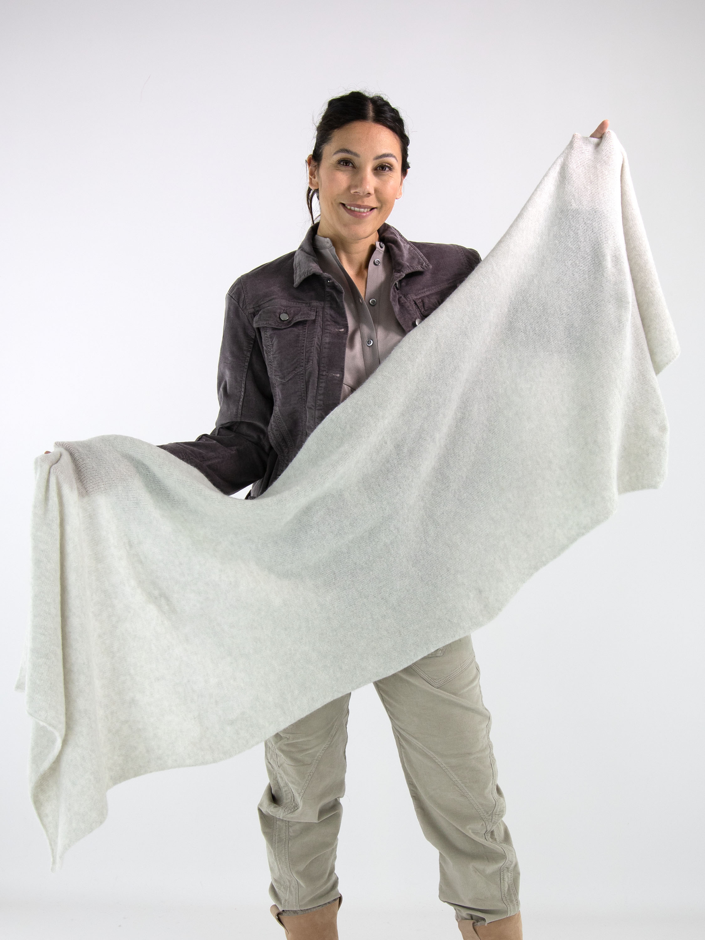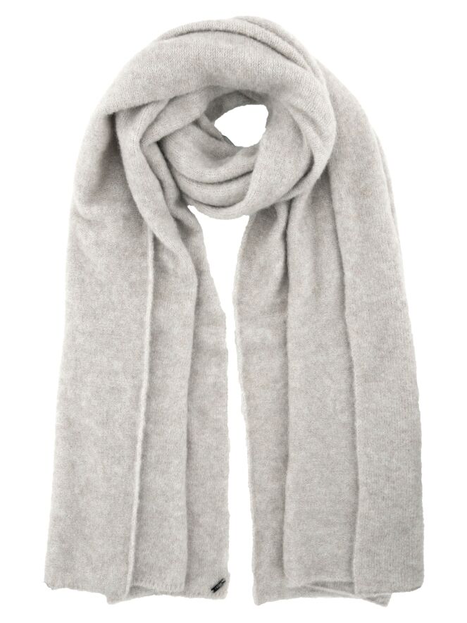 Een shawl van High in de kleur lichtgrijs. De shawl is fijn gebreid en mag met de hand worden gewassen.