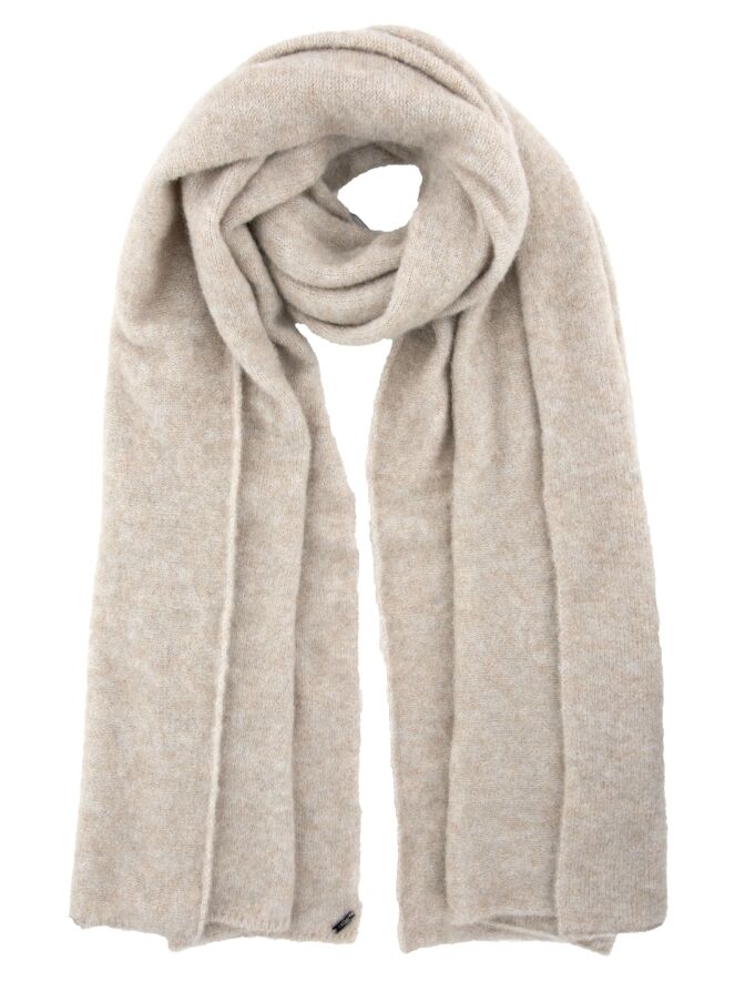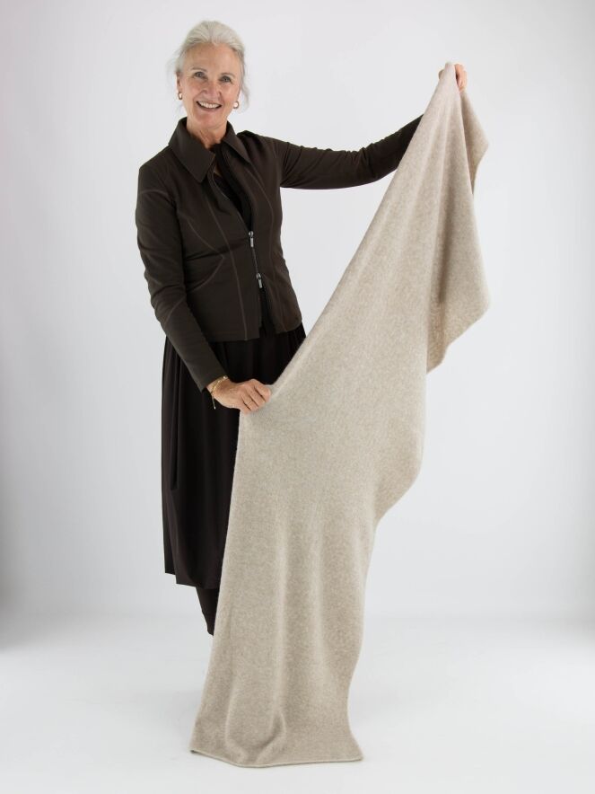Een shawl van High in de kleur beige. De shawl is fijn gebreid en mag met de hand worden gewassen.