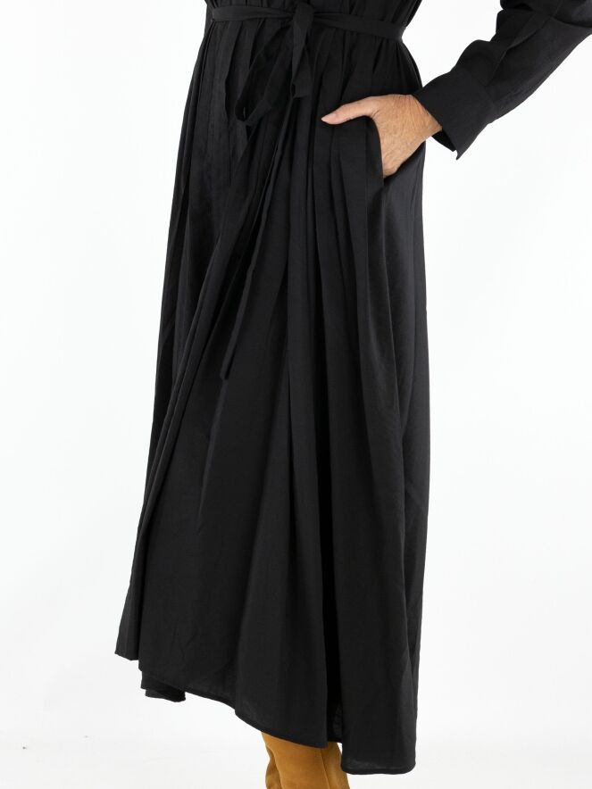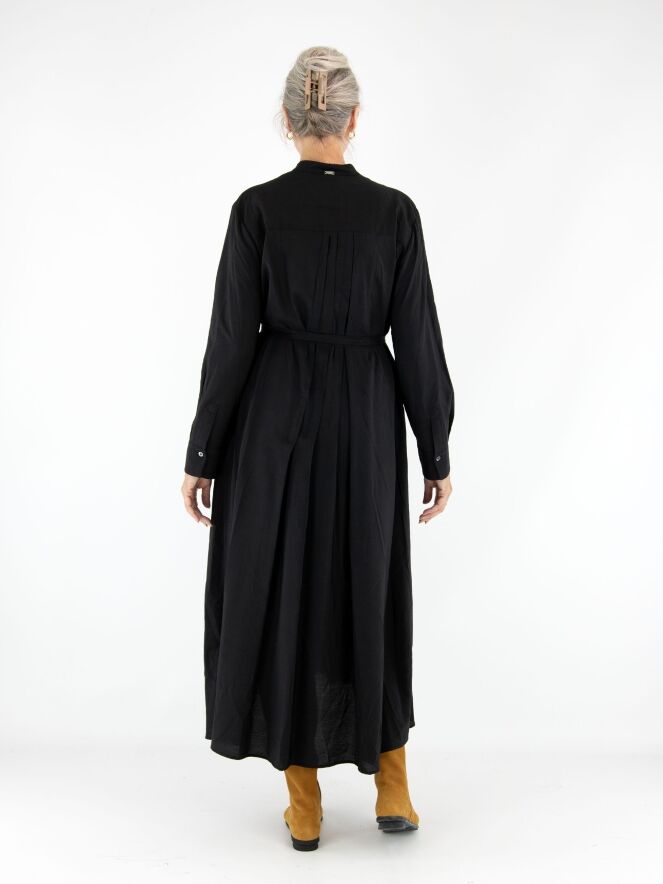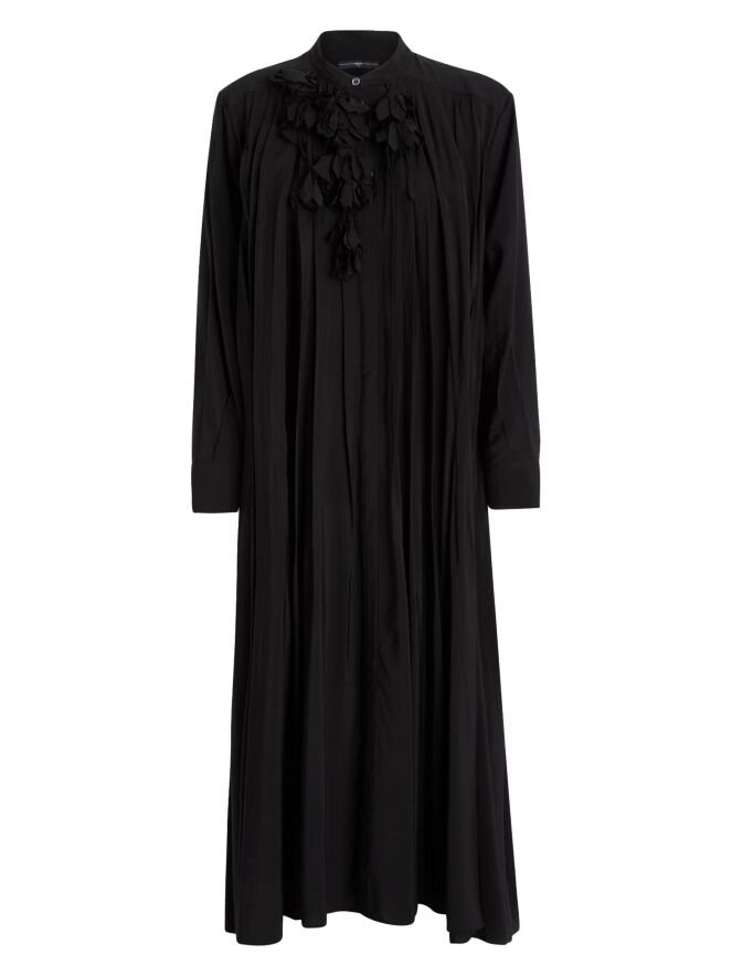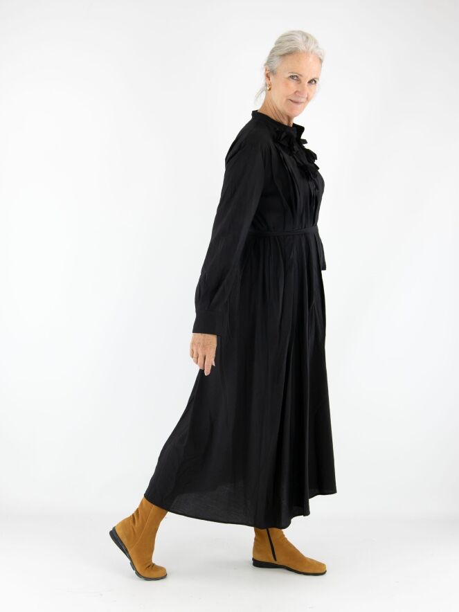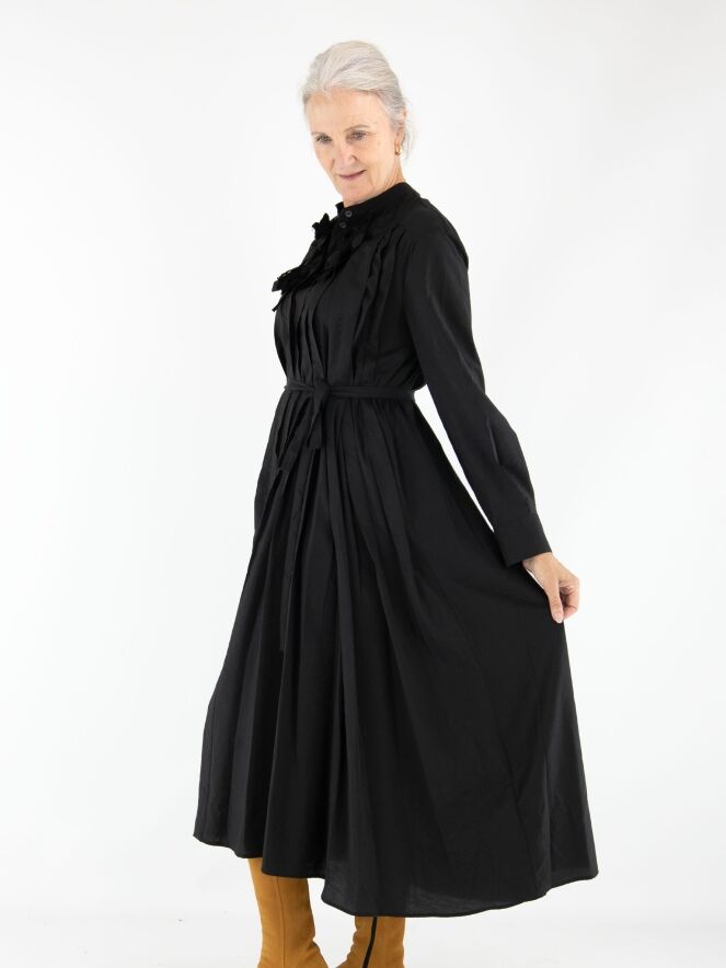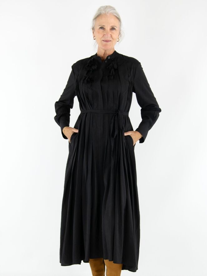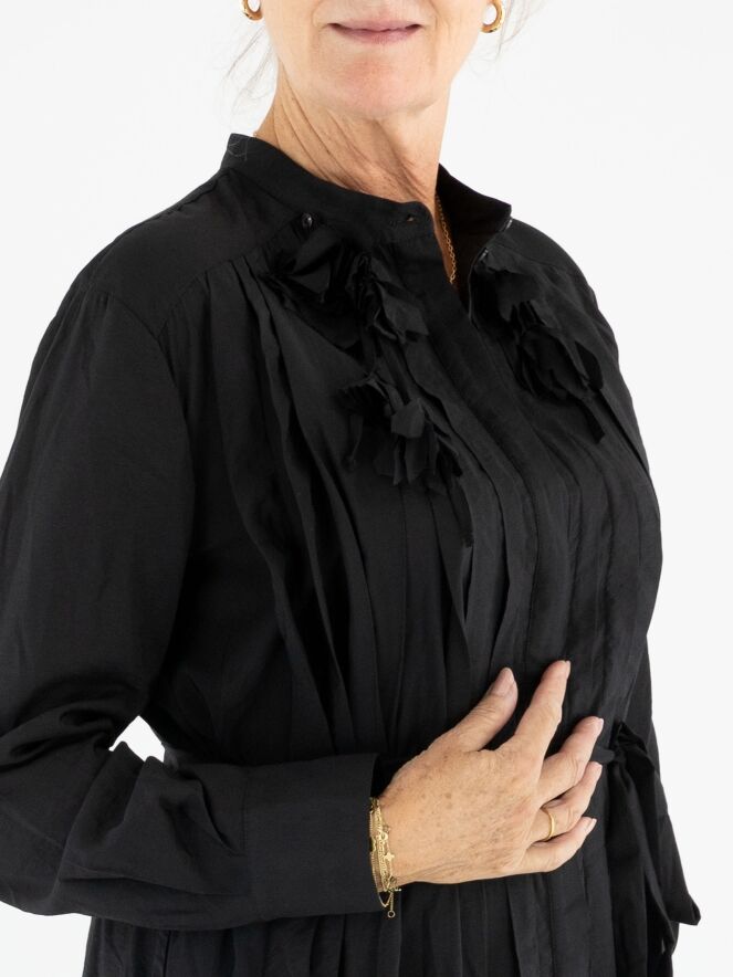 Een jurk van High in de kleur zwart. Vanuit de hooggesloten hals loopt een blinde knoopsluiting tot aan de taille. Aan de voorzijde is de stof vanuit de schouders geplisseerd, terwijl dit detail aan de achterzijde terugkomt in het vlak tussen de schouderbladen. Langs de rand van de hals zijn linten bevestigd waaraan stoffen bloemen hangen, wat de jurk een verfijnd en artistiek karakter geeft. Deze jurk kan met de hand worden gewassen.