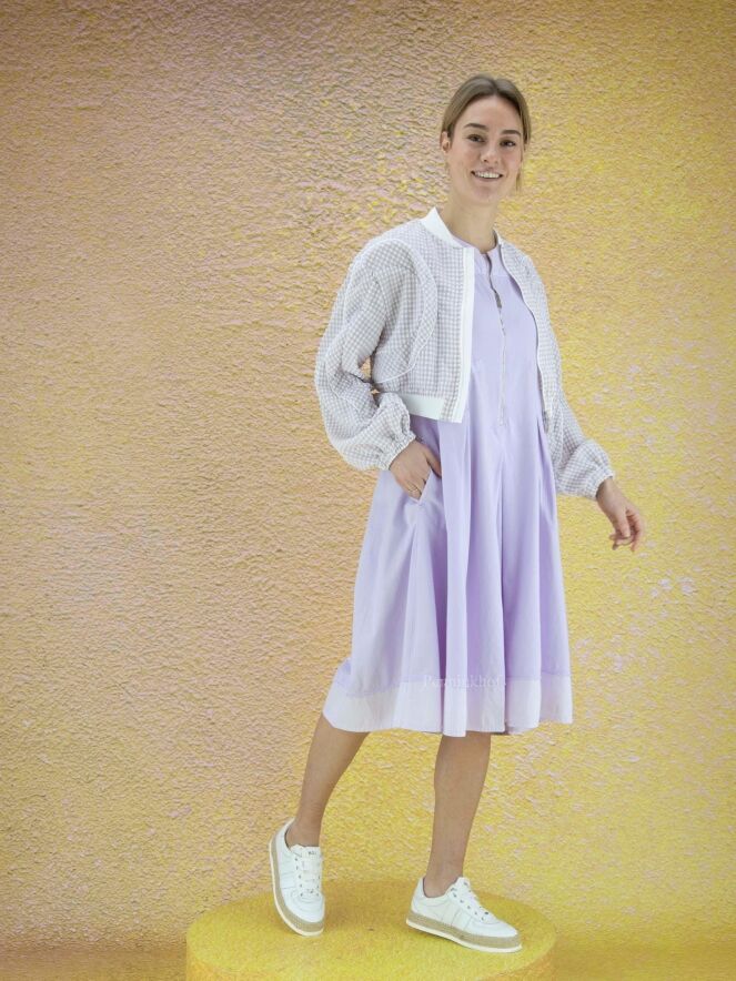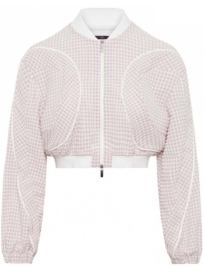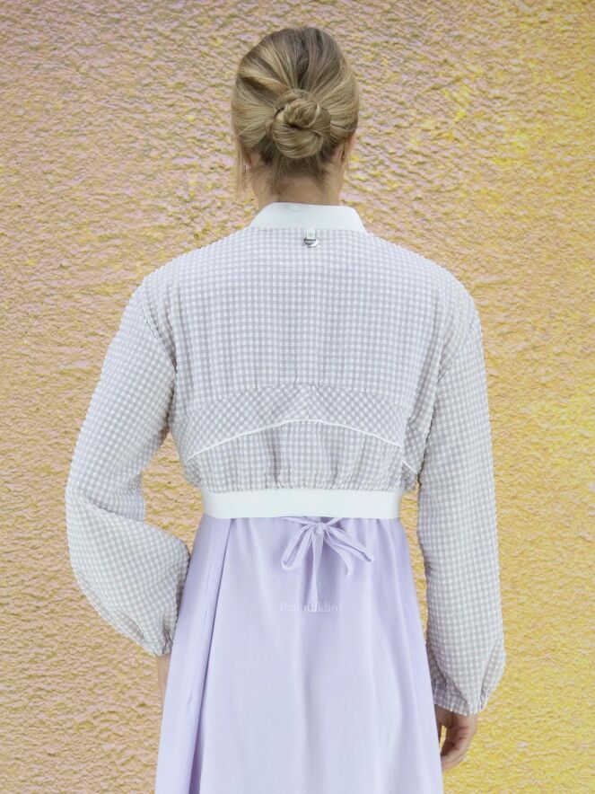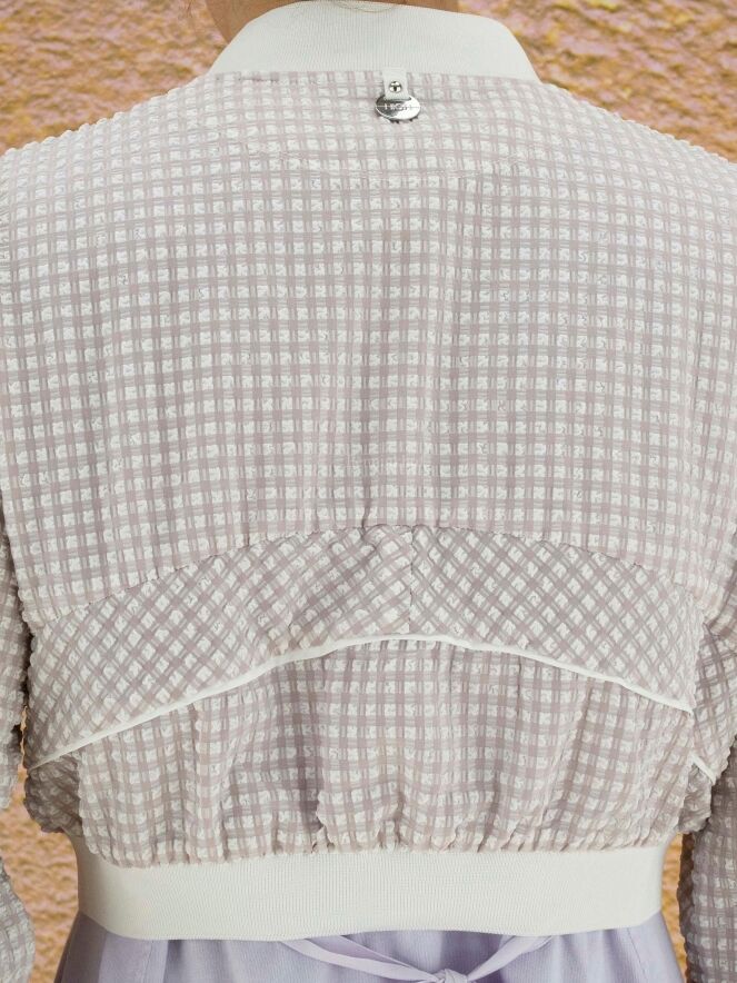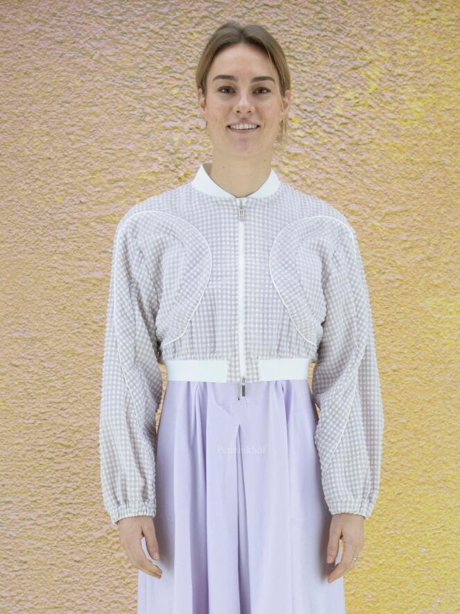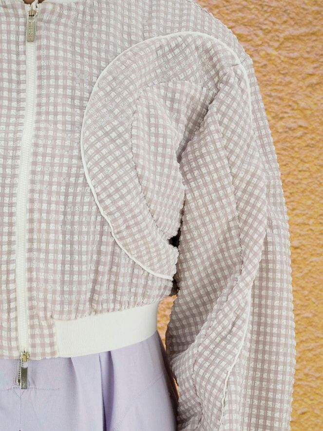 Een kort vest van High in een in een wafel patroon met reliëf met de kleuren lila en wit. Langs de rand van de boord en aan de onderkant van het vest is een fijn geribbelde tricot boord. In de rand van de lange mouwen is een elastieken bies. Het vest heeft een ritssluiting en mag op de hand worden gewassen.