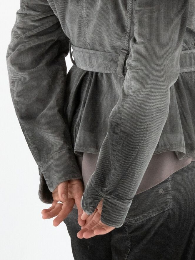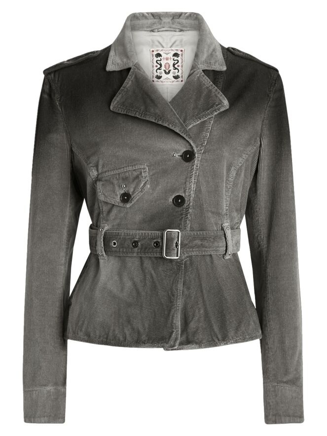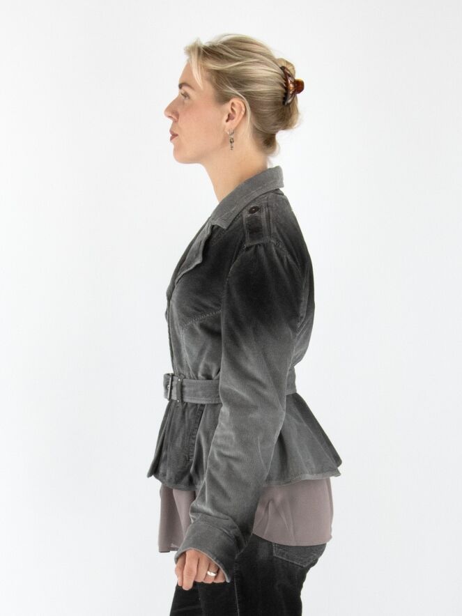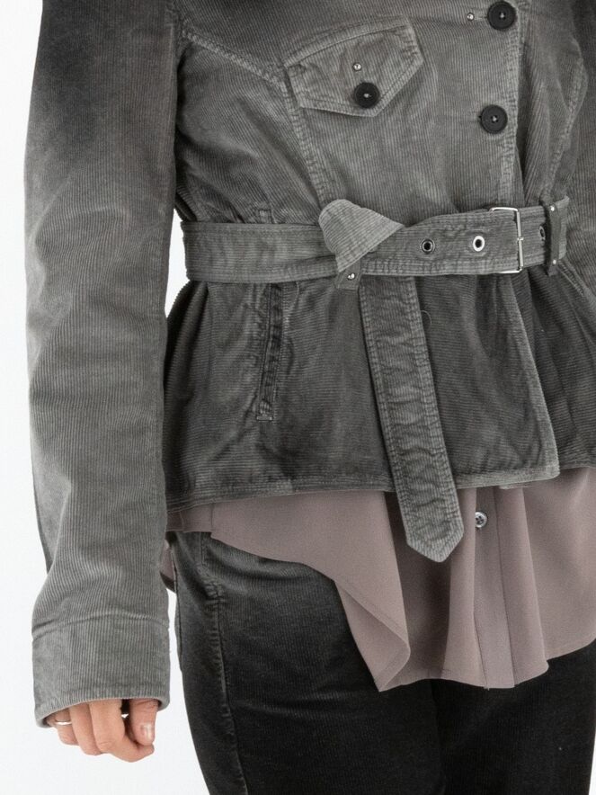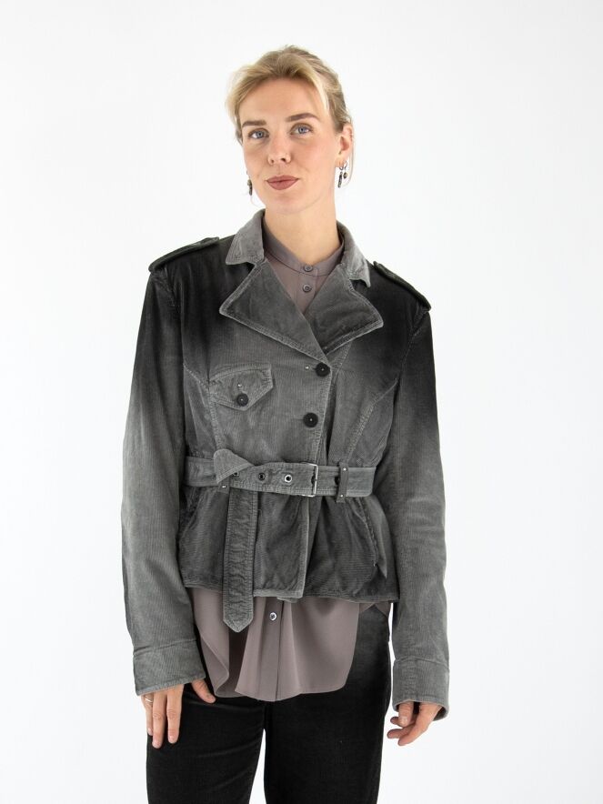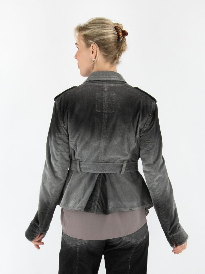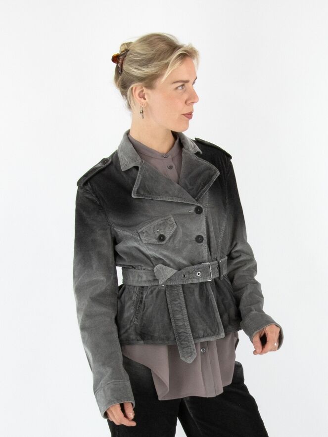 lichtgrijs in het midden. De blazer heeft een asymmetrische knoopsluiting en in de taille een ceintuur van dezelfde stof. Onder de taille bevinden zich steekzakken. Op de schouders zijn pailletten verwerkt. Deze blazer mag met de hand worden gewassen.