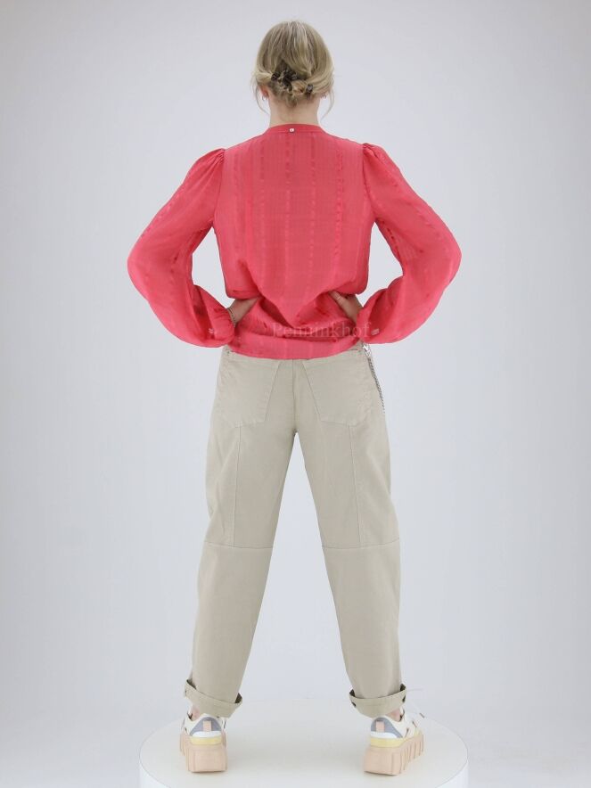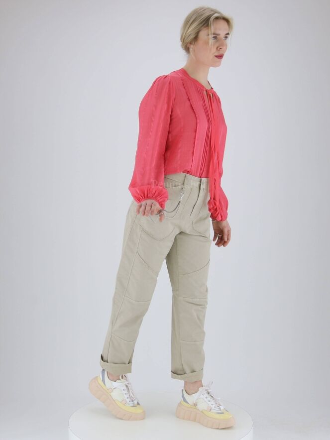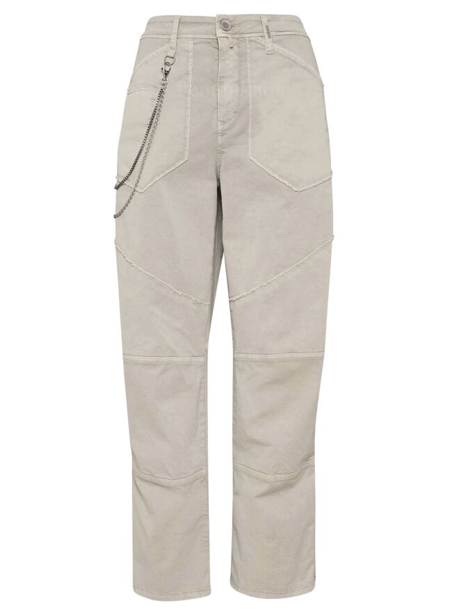 Een jeans van High in de kleur zand. Langs de randen van de steekzakken is een omgekeerde stiknaad. Dit detail komt terug bij de stiknaad op het bovenbeen. Vanuit de rechter ceintuurlus is een dubbele zilver kleurige ketting die naar de achterkant loopt. Deze jeans mag op 30 graden worden gewassen.