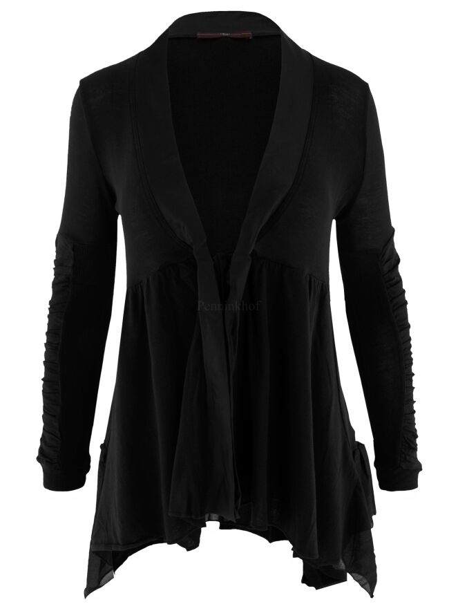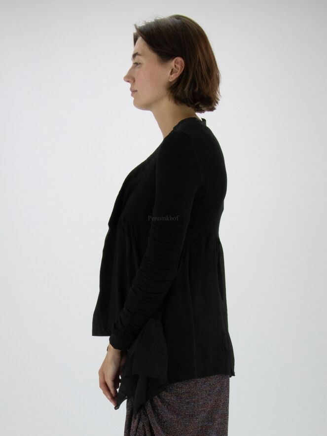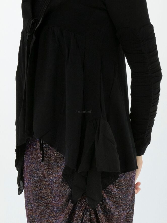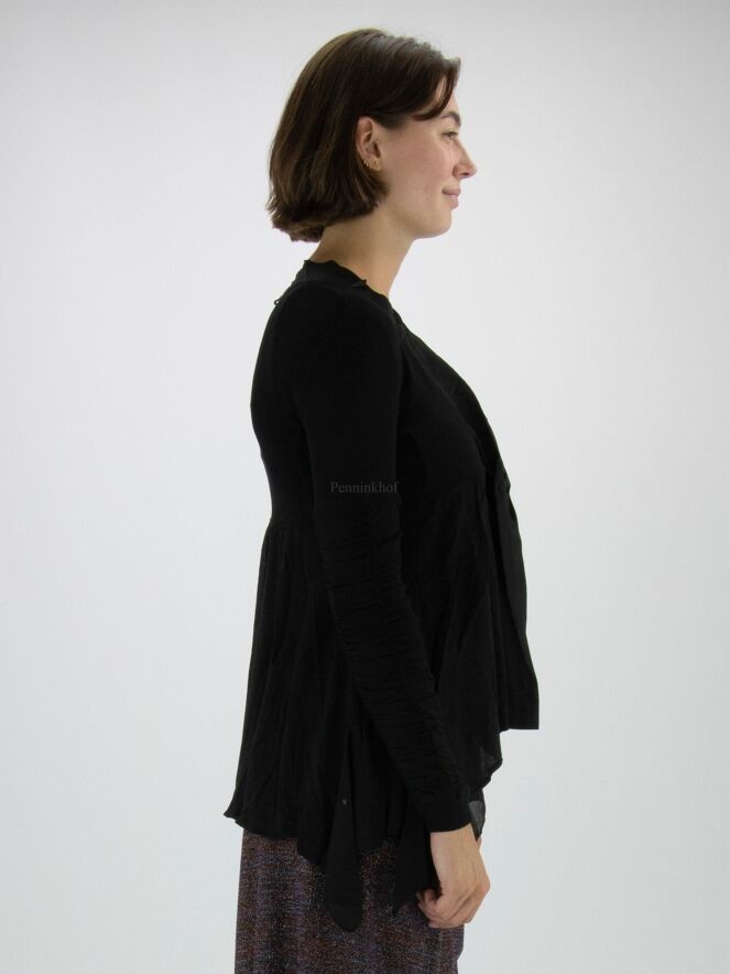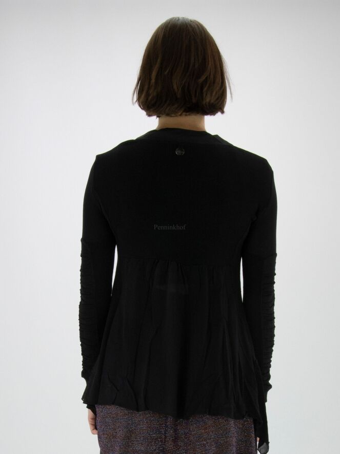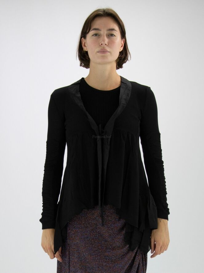 Een vest van High in een zeer fijn geribbelde stof in de kleur zwart. Langs de V - Hals is een mat satijnen bies. Onder de buste is een stiknaad waar vanuit de stof fijn geplooid is. De sluiting is met een koord. Aan de onderkant is een beide zijkanten een voile stof. De lange mouwen hebben vanaf de bovenarm 2 stoffen waarvan één stof fijn geribbeld is en de andere stof fij geplooid is. Dit vest mag op de hand worden gewassen.