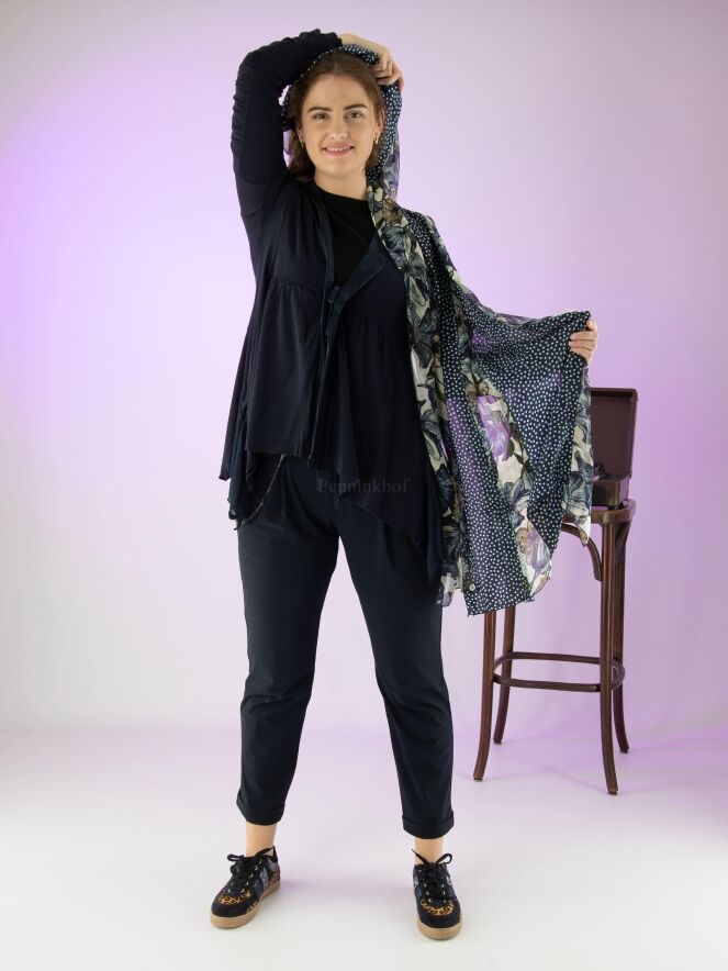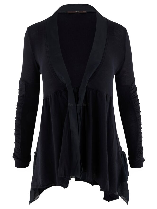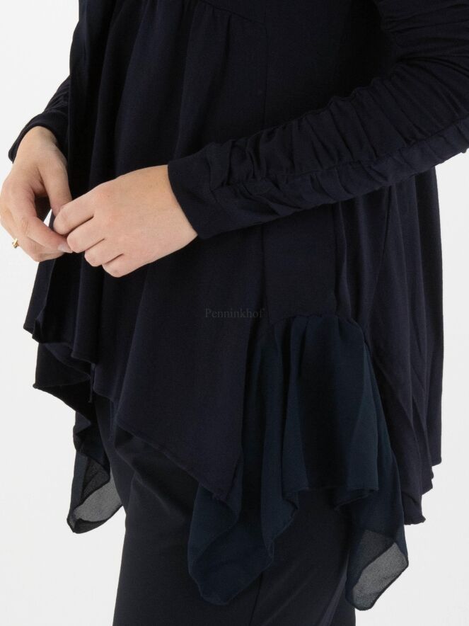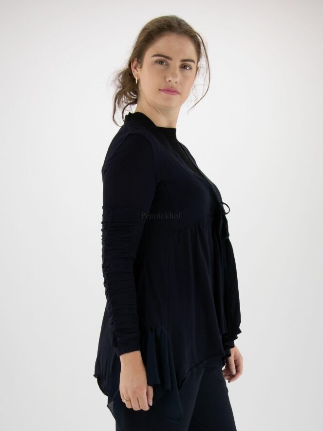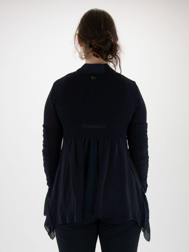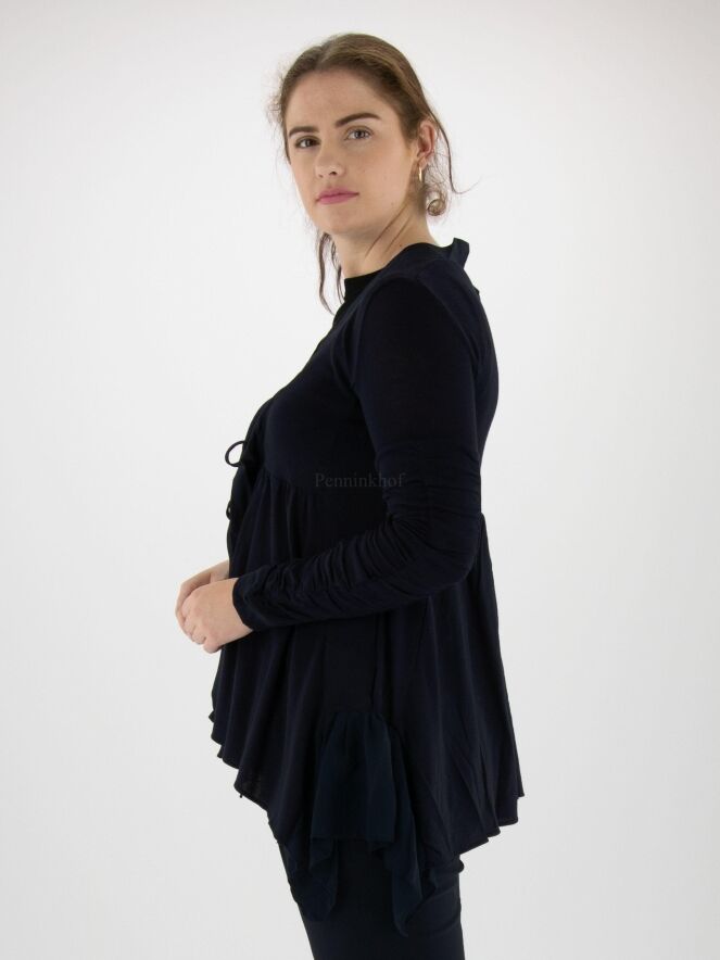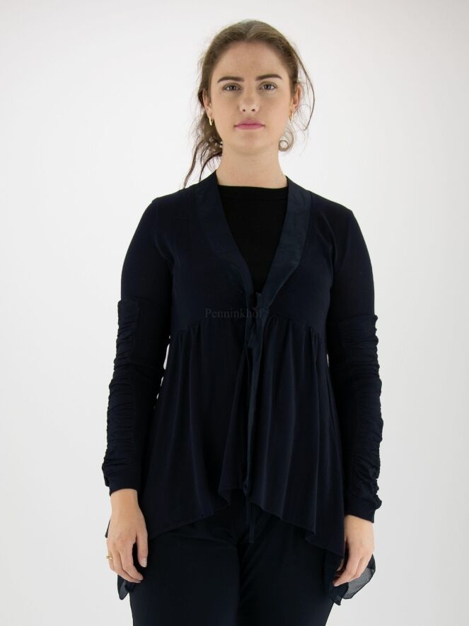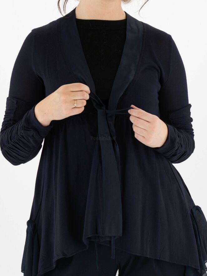 Een vest van High in een zeer fijn geribbelde stof in de kleur marineblauw. Langs de V - Hals is een mat satijnen bies. Onder de buste is een stiknaad waar vanuit de stof fijn geplooid is. De sluiting is met een koord. Aan de onderkant is een beide zijkanten een voile stof. De lange mouwen hebben vanaf de bovenarm 2 stoffen waarvan één stof fijn geribbeld is en de andere stof fij geplooid is. Dit vest mag op de hand worden gewassen.