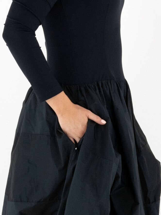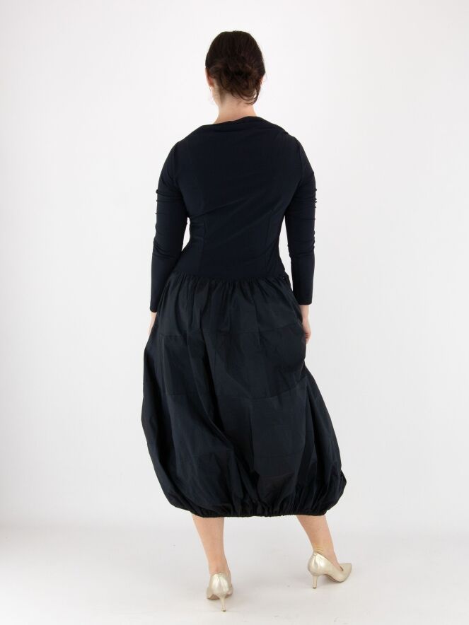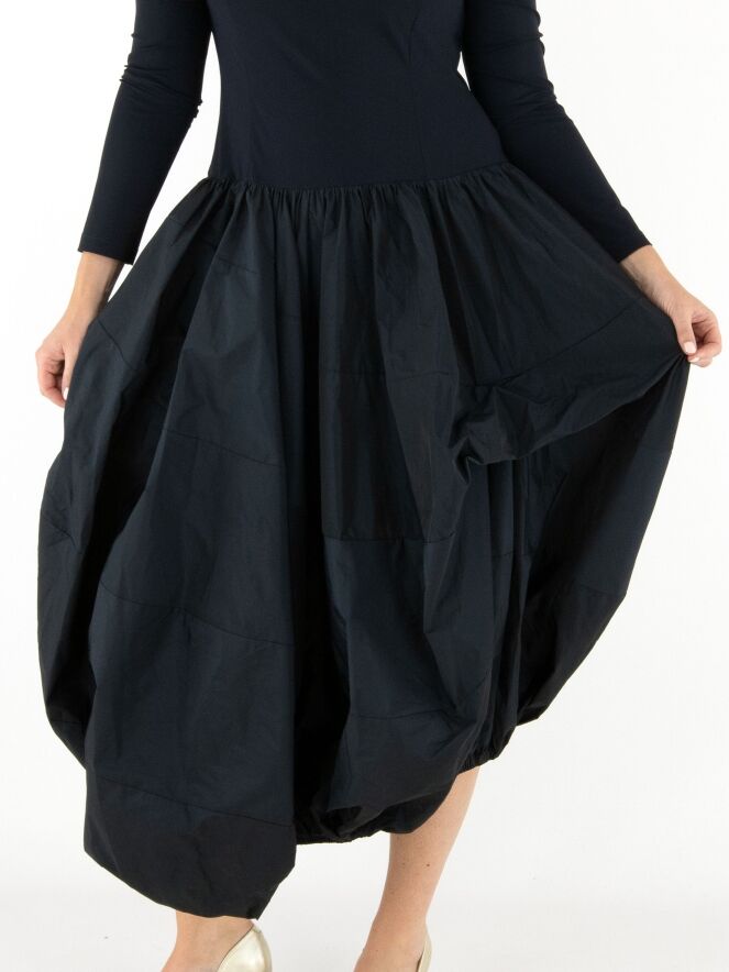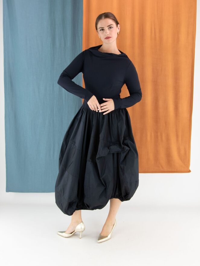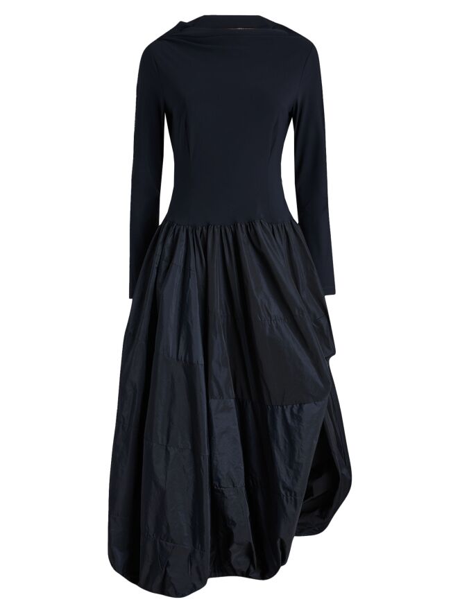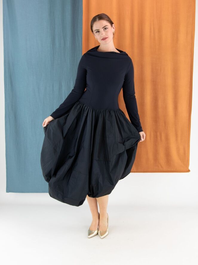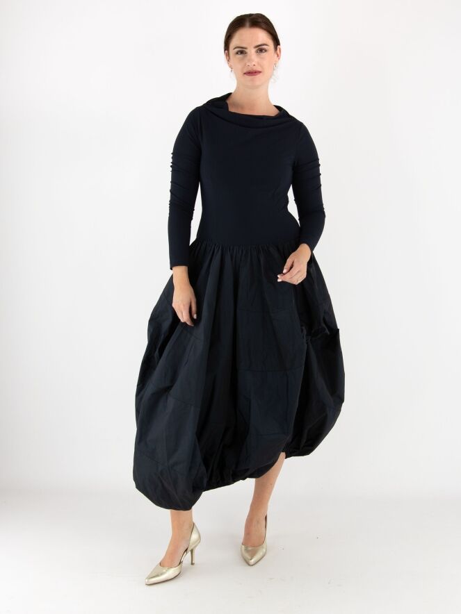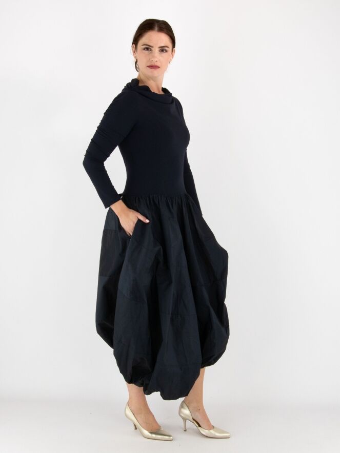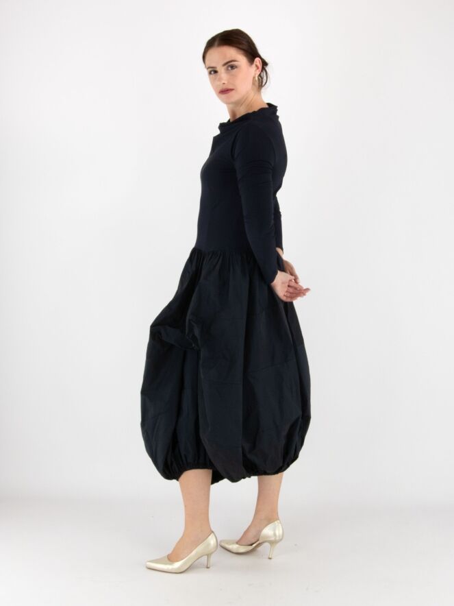 Een jurk van High in de kleur marineblauw. De jurk heeft een vallende hals. Vanaf de taille is een matte satijnen parachutestof in een ballonvorm verwerkt, met aan de onderkant een elastische bies in een tunnelverwerking. Langs de taille is de parachutestof fijn geplooid. Deze jurk mag niet worden gewassen.