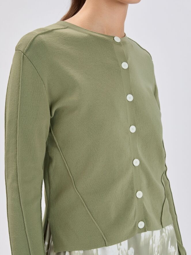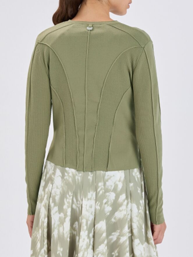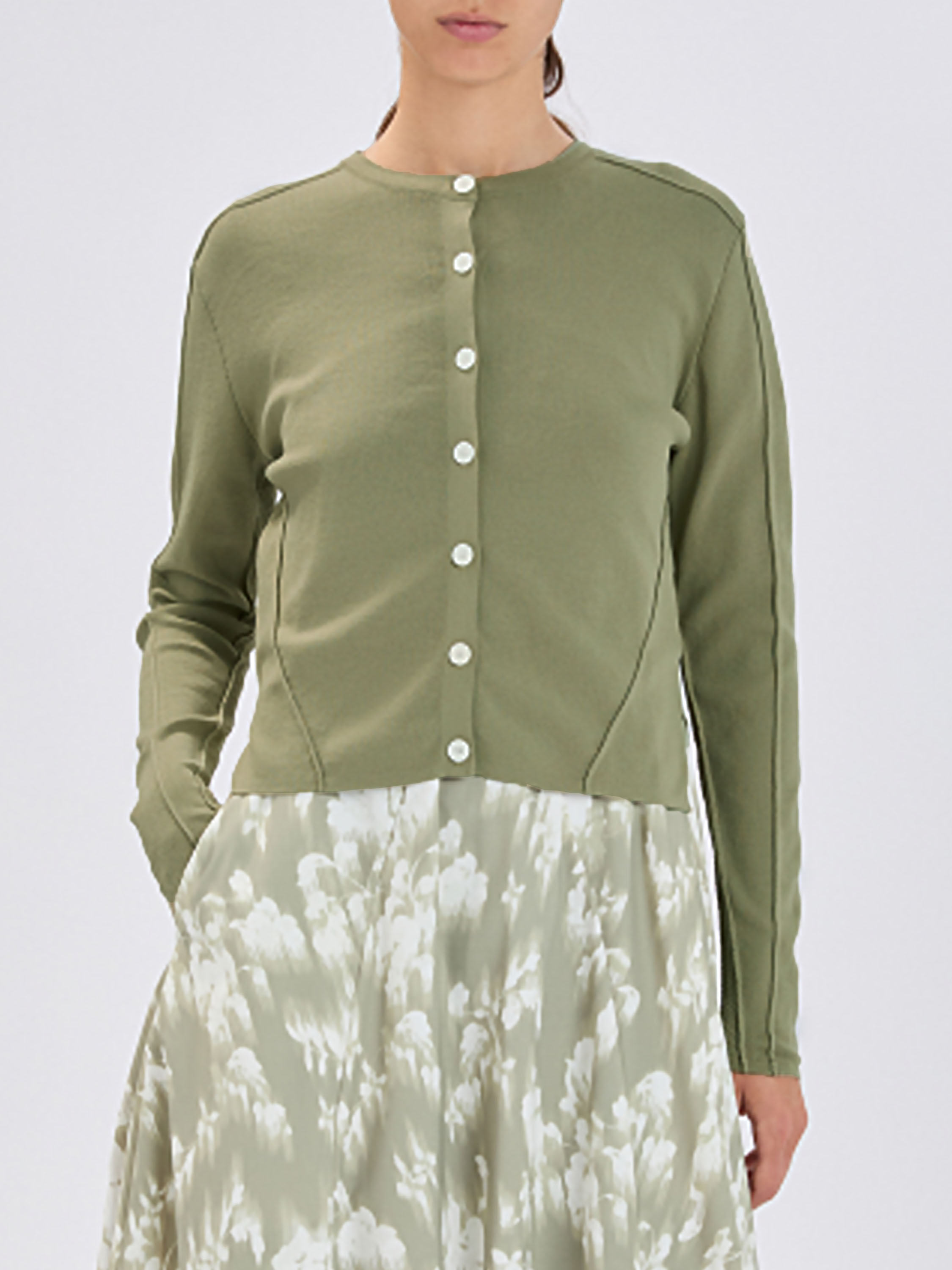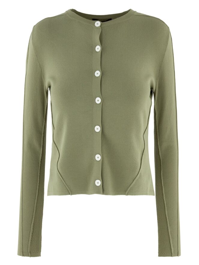 Een kort vest van High in de kleur olijfgroen. De stof is uitgevoerd in een fijn geribbelde structuur. Het vest heeft een knoopsluiting met zeven roomwitte knopen. De onderkant van de lange mouwen is uitgevoerd in een geperforeerde stof. Deze structuur loopt door in een brede band aan de achterkant. Dit vest mag op de hand worden gewassen.