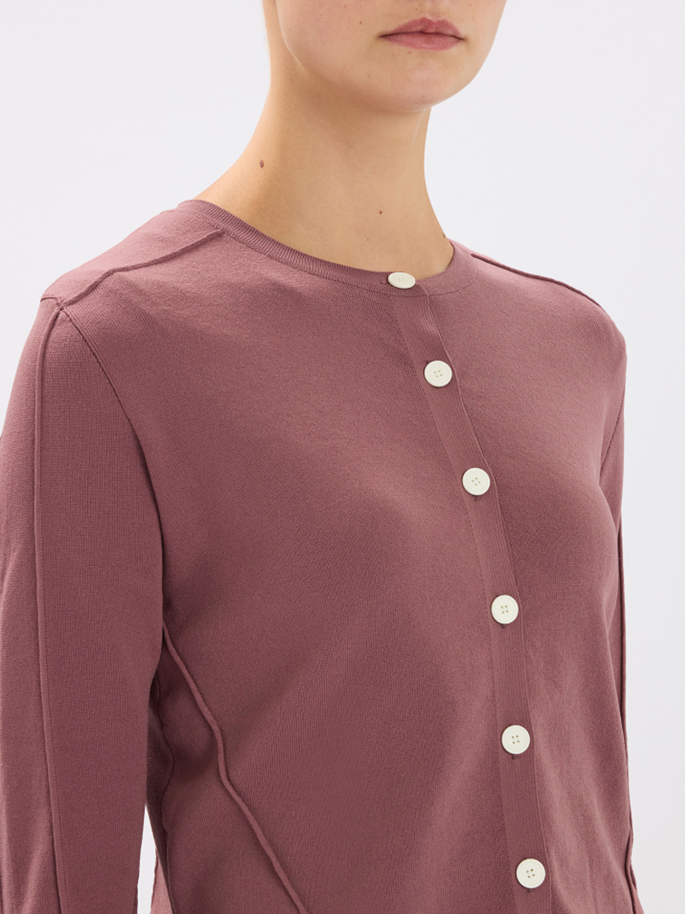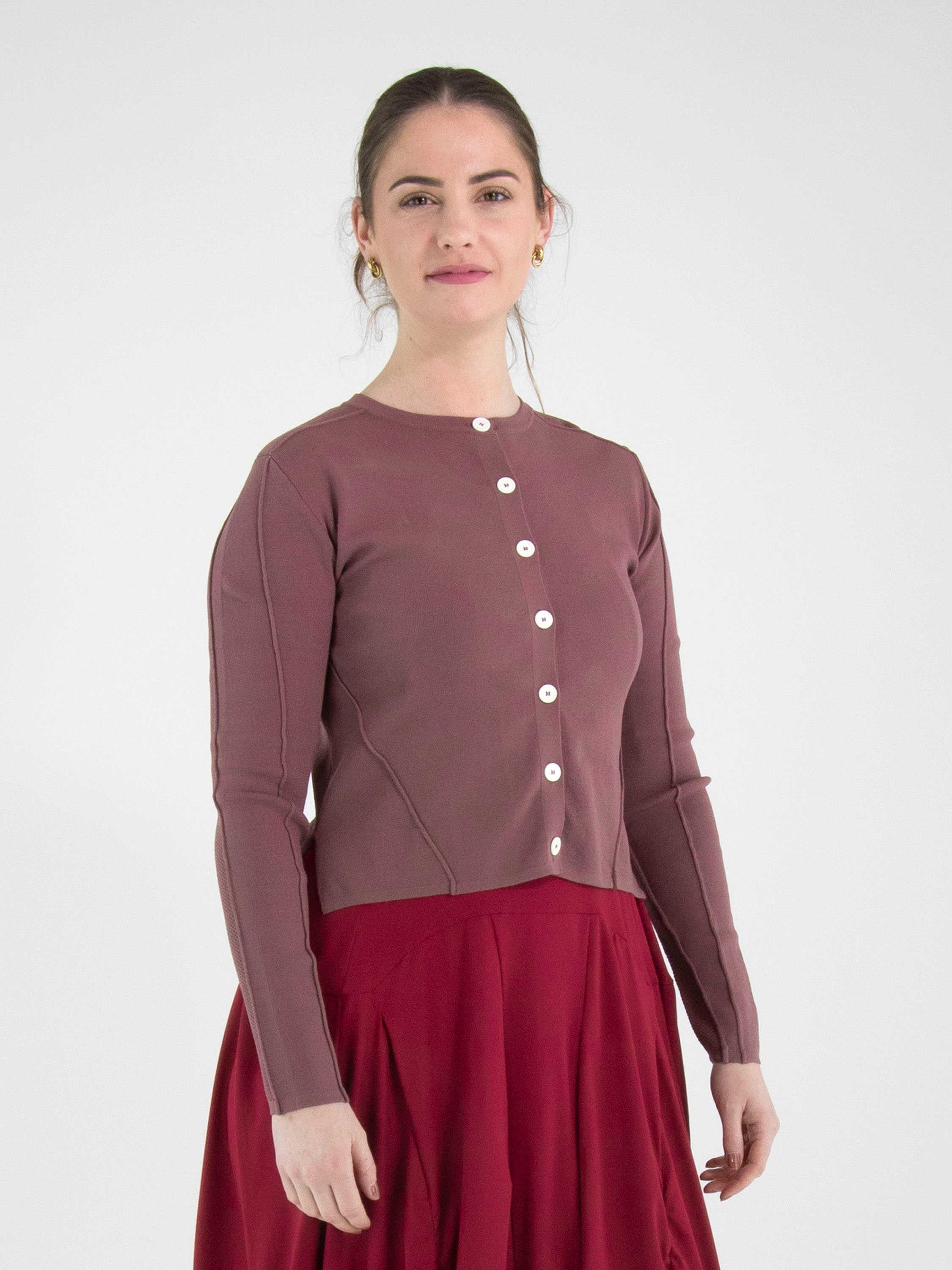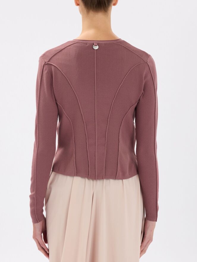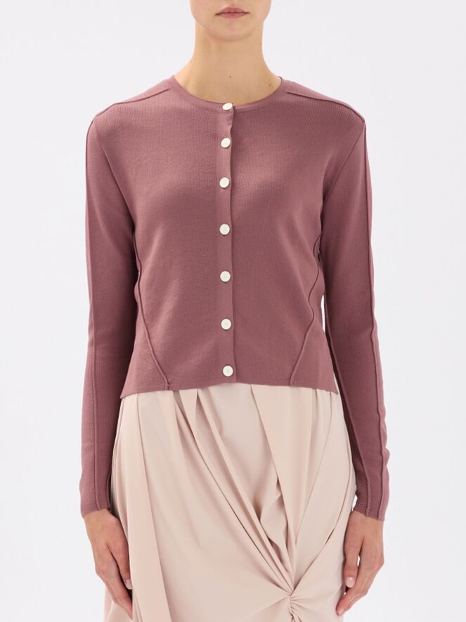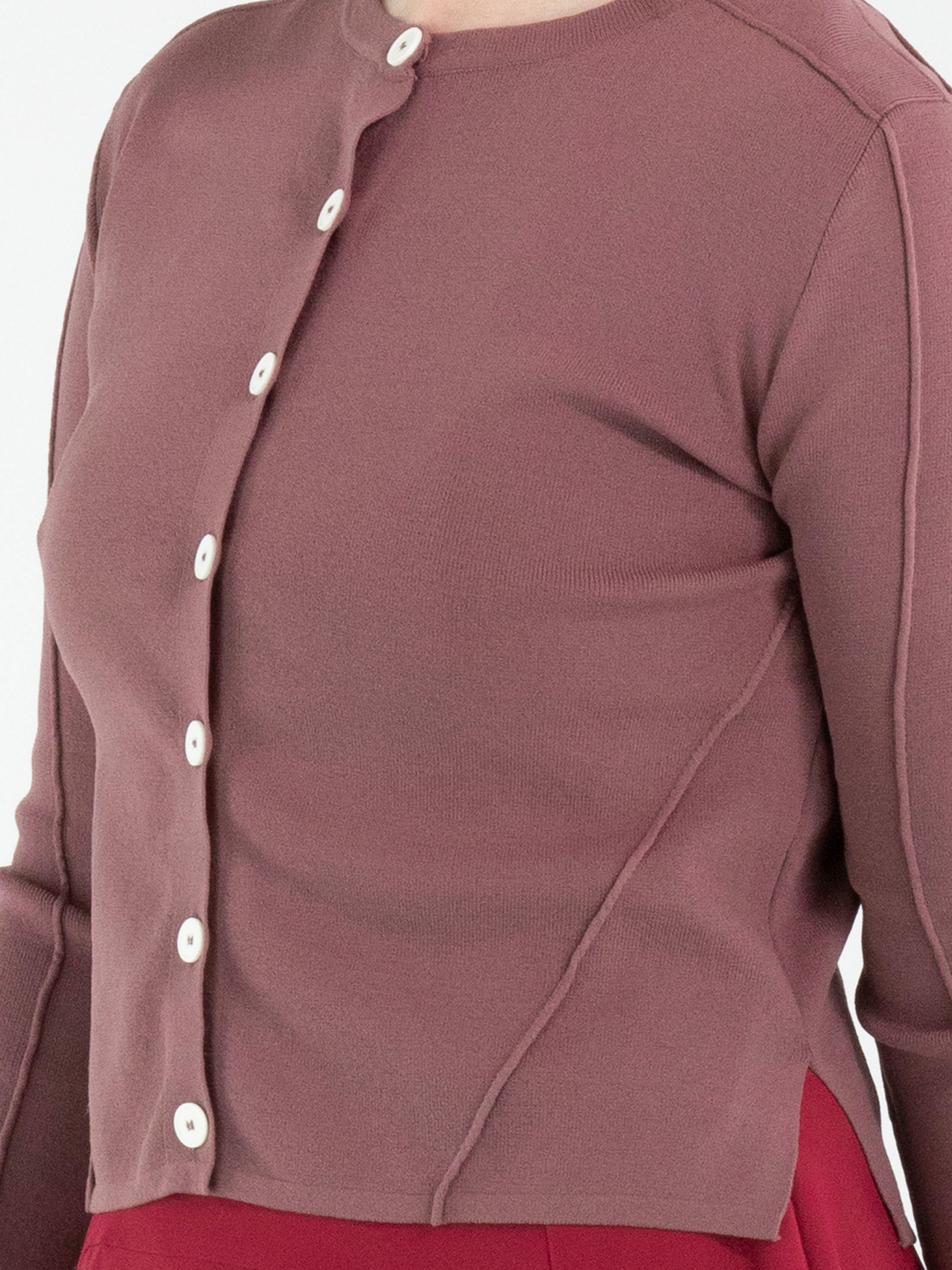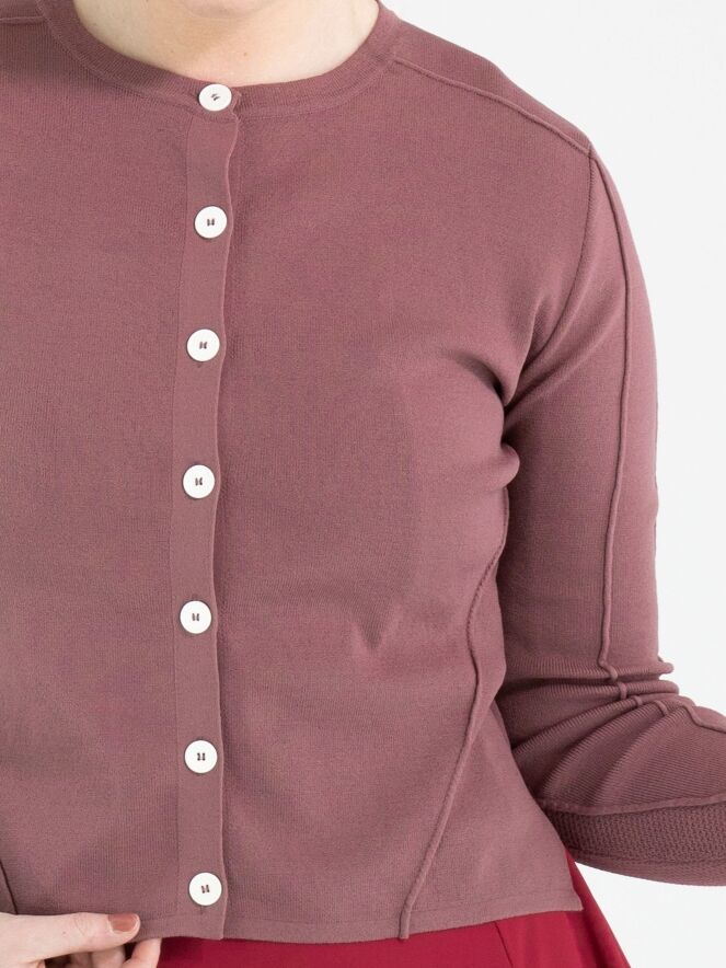 Een kort vest van High in de kleur framboosrood. De stof heeft een fijn geribbelde structuur. Het vest heeft een knoopsluiting met zeven roomwitte knopen. De onderkant van de lange mouwen is uitgevoerd in een geperforeerde stof. Deze structuur loopt in een brede band door naar de achterkant. Dit vest mag op de hand worden gewassen.