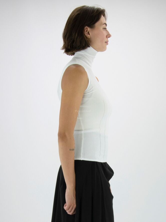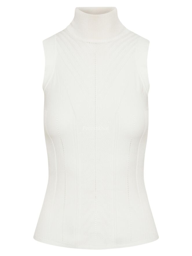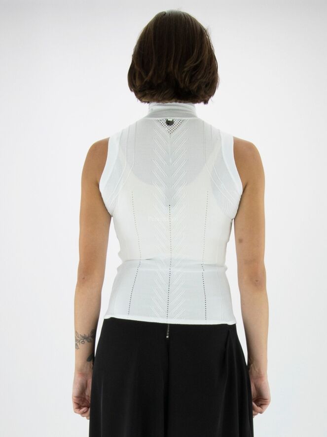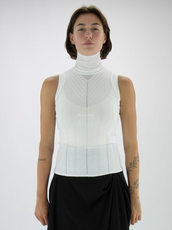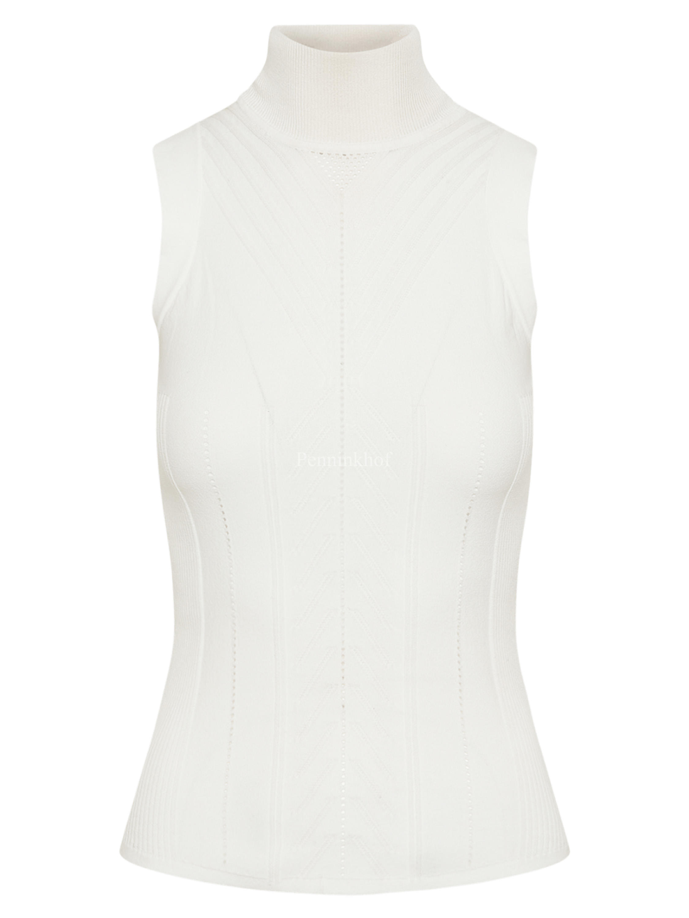 Een top van High in een roomwitte kleur. De top heeft meerdere structuren in een V vorm en enkele verticale ajour perforaties. Aan de zijkanten is de stof geribbeld. De top heeft een col en mag op de hand worden gewassen.