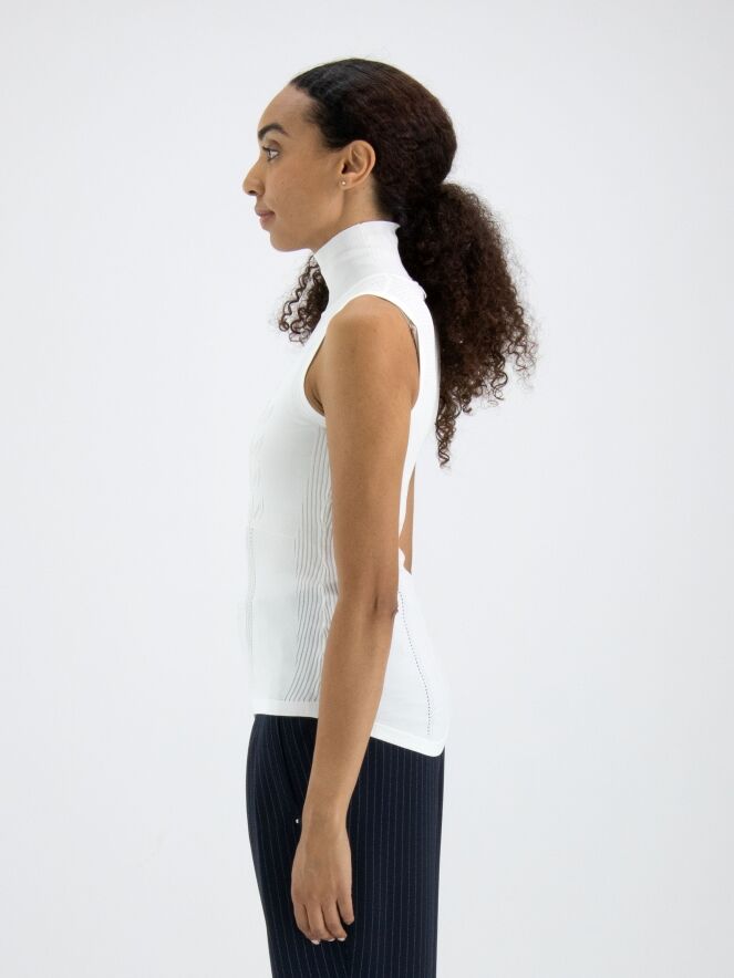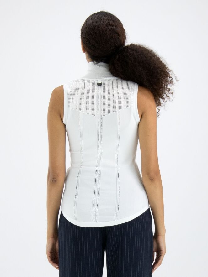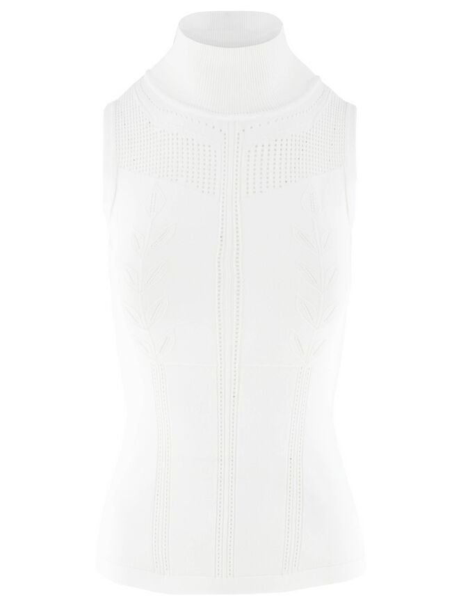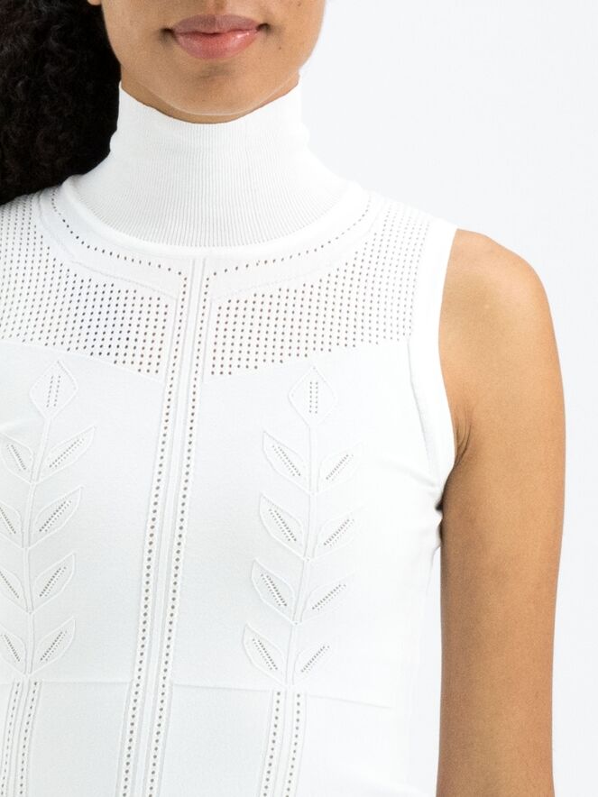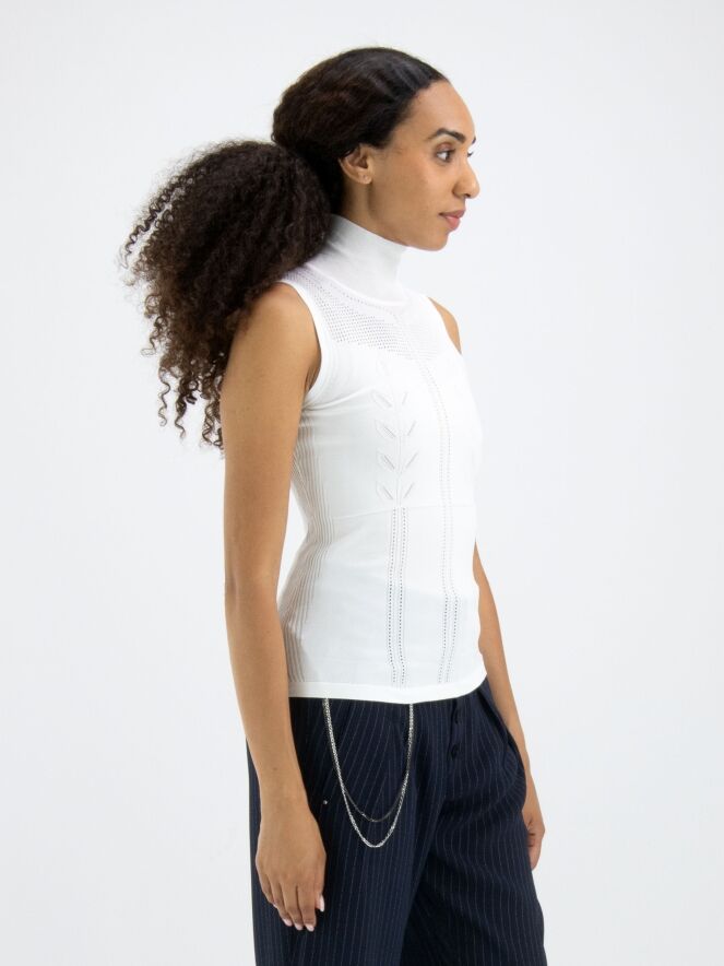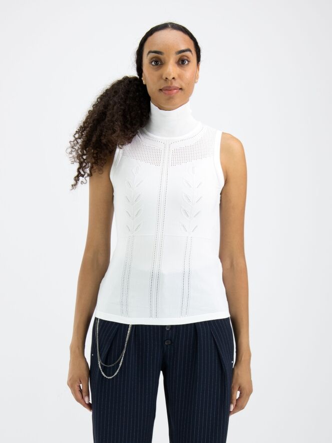 Een top van High in de kleur roomwit. De top heeft een turtle hals met een fijn geribbelde tricot boord. Vanuit de hals tot de buste is de stof geperforeerd. Vanaf de buste tot de taille heeft de stof een bladeren patroon met diagonale ajourlijnen. Vanaf de taille zijn er enkele verticale ajourlijnen in de stof. Aan de achterkant zijn vanaf de geperforeerde stof direct de verticale ajourlijnen. Deze top mag op de hand worden gewassen.