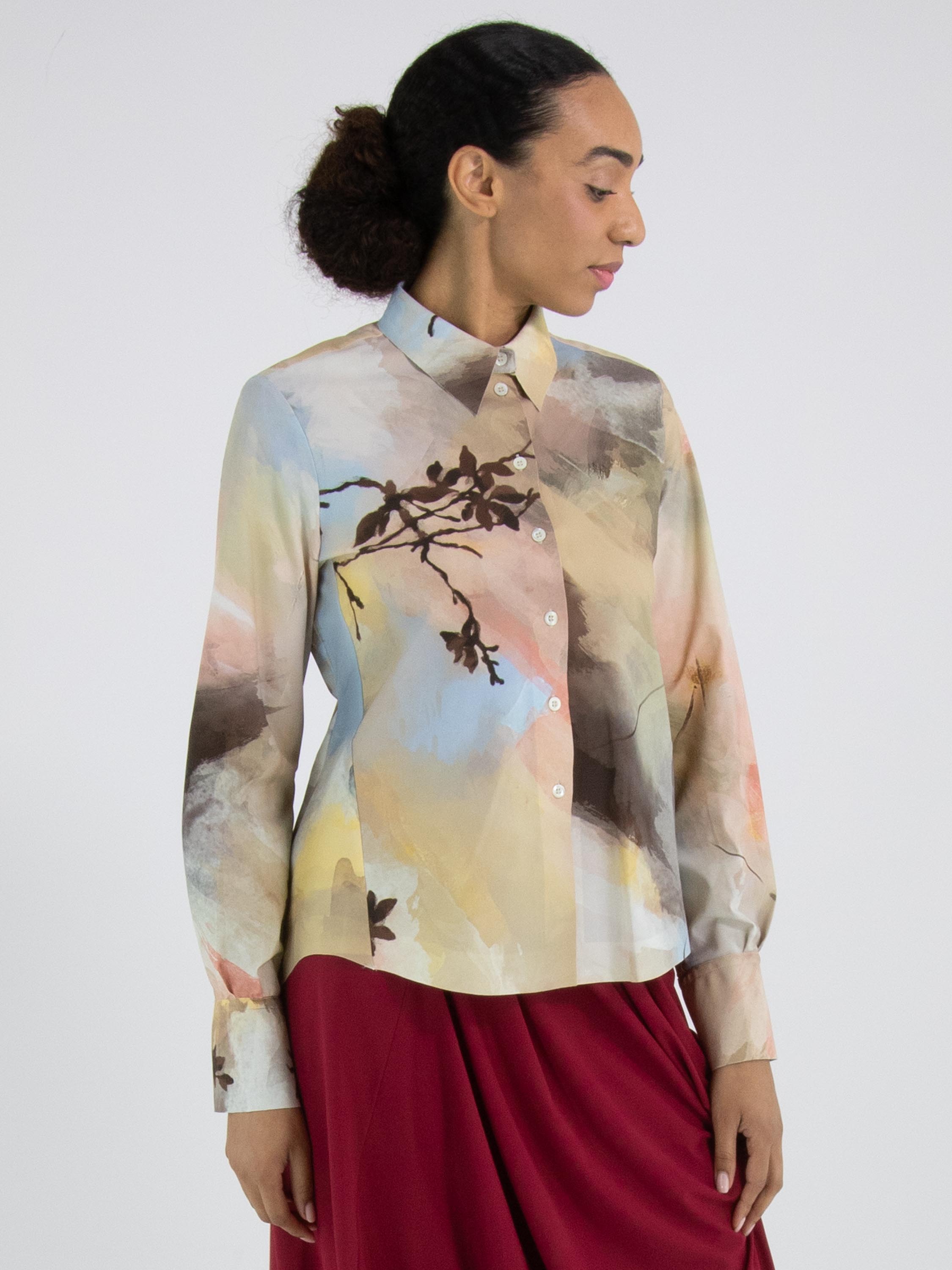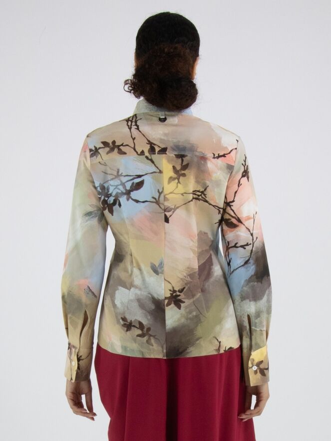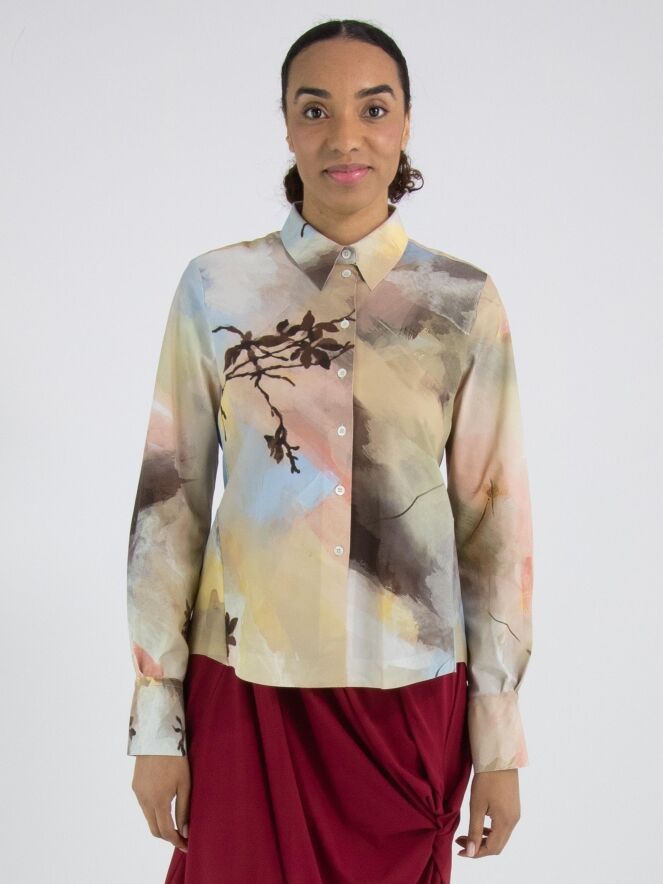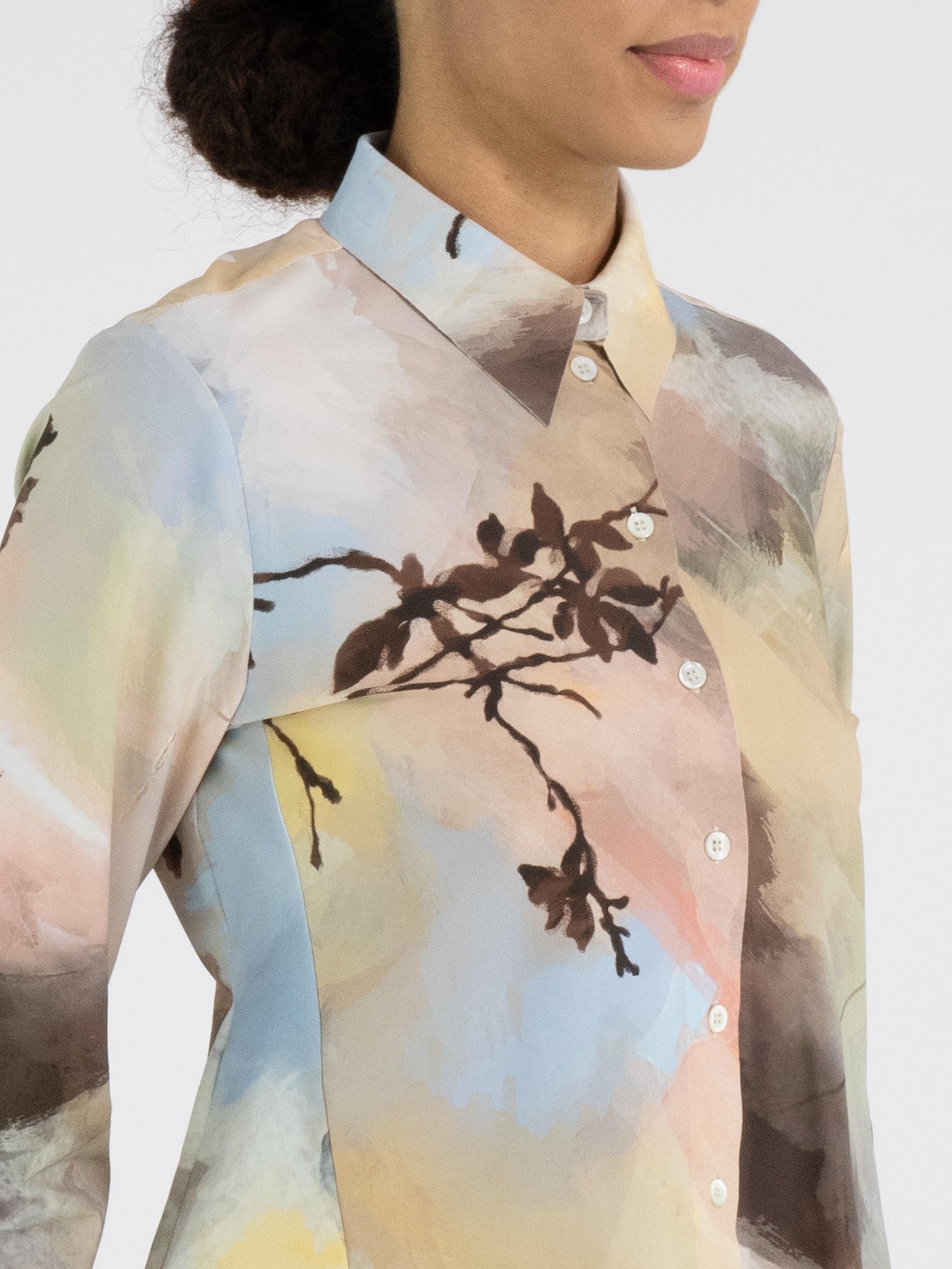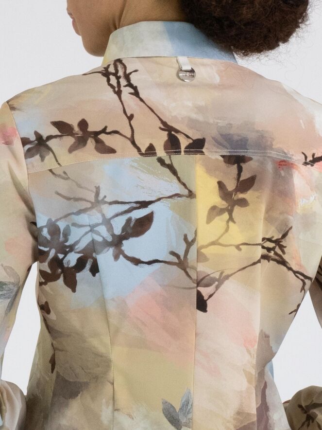 Een blouse van High Tech in een grafische multicolor aquarelprint met als hoofdkleuren meerdere tinten taupe, pastelblauw en zalmtinten. Langs de rand van de manchetten is de stof op enkele plaatsen geplooid. Deze blouse mag op de hand worden gewassen.