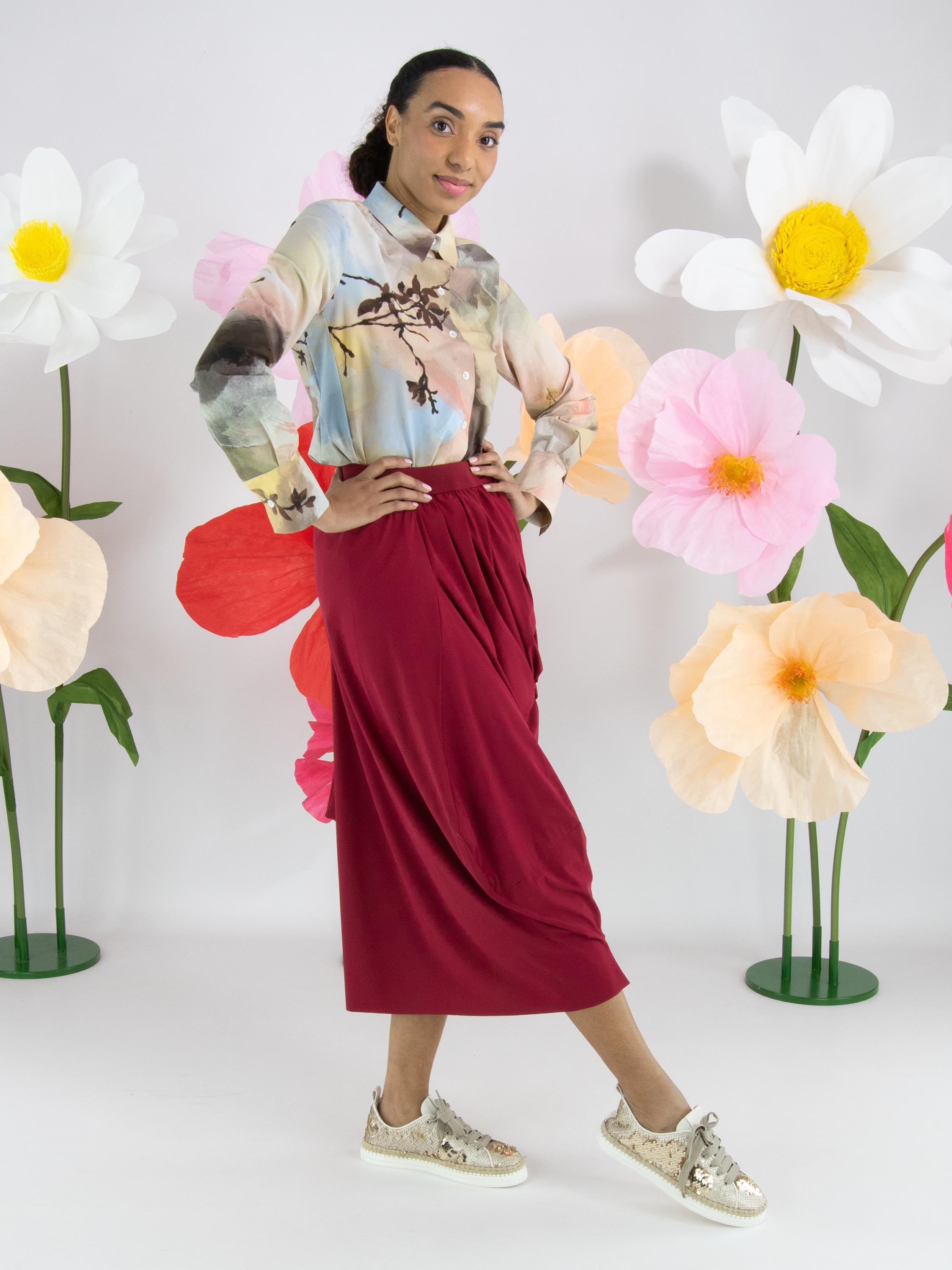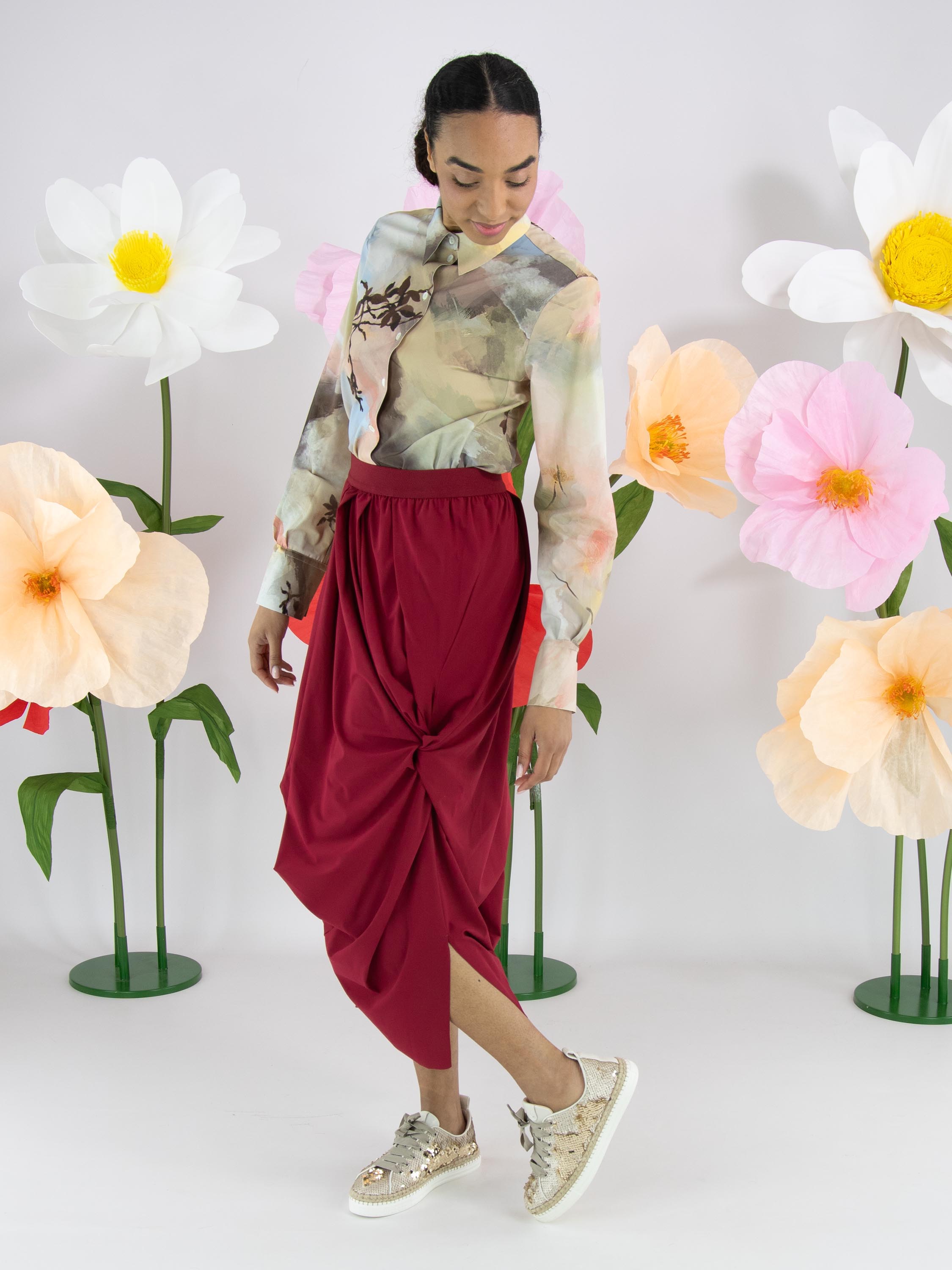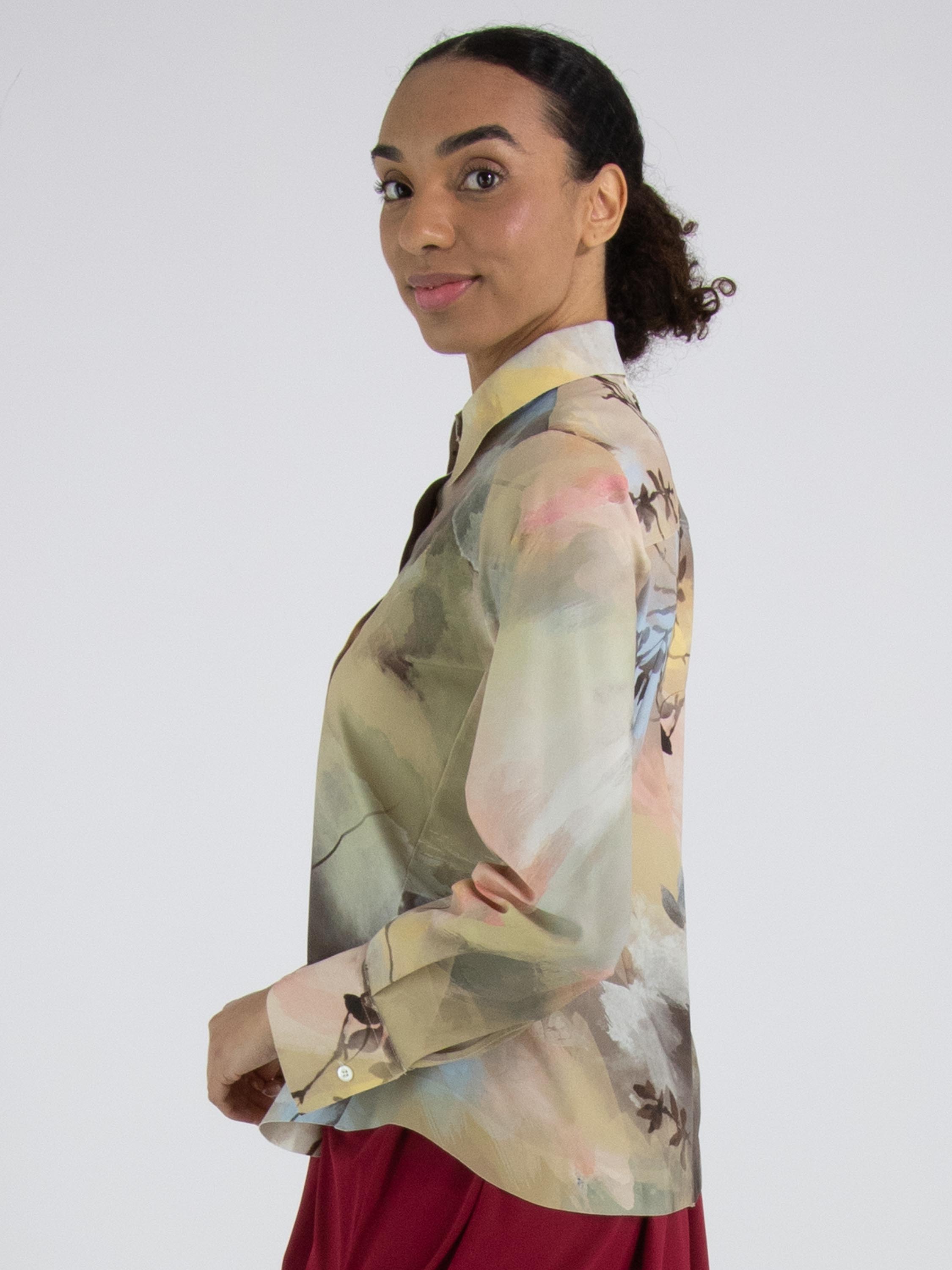 Een blouse van High Tech in een grafische multicolor aquarelprint met als hoofdkleuren meerdere tinten taupe, pastelblauw en zalmtinten. Langs de rand van de manchetten is de stof op enkele plaatsen geplooid. Deze blouse mag op de hand worden gewassen.