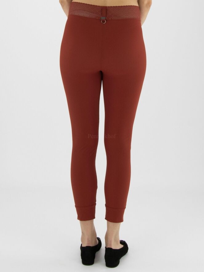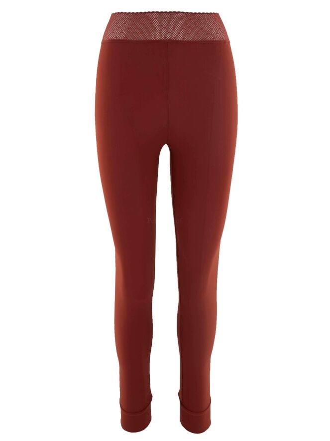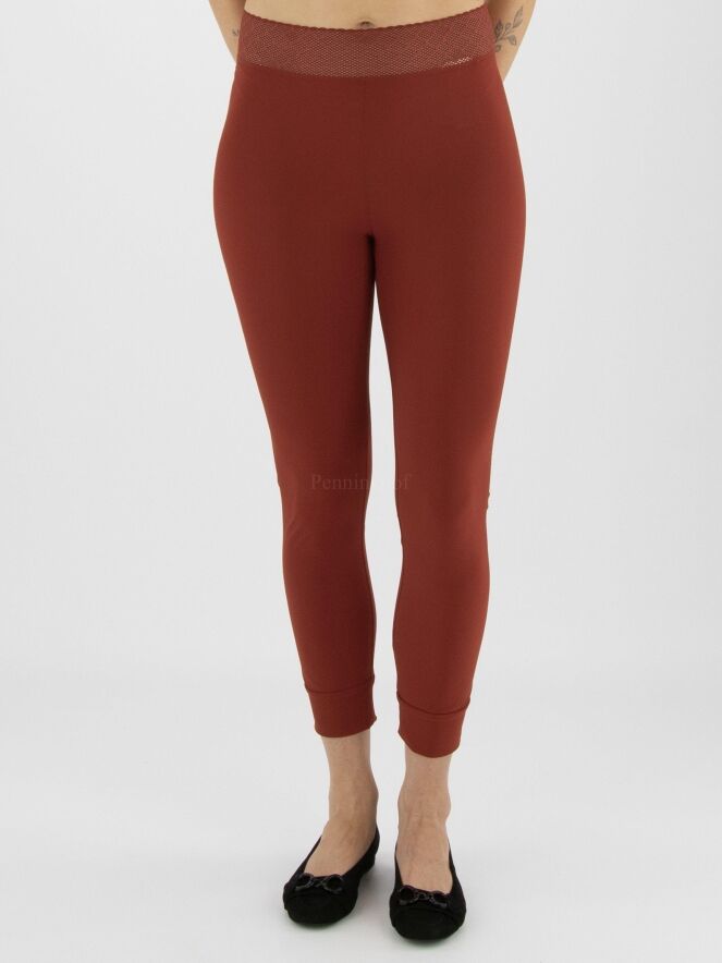 Een legging van High in de kleur roest. In de taille is een brede elastieken band in een net structuur. Deze legging mag op 30 graden worden gewassen.