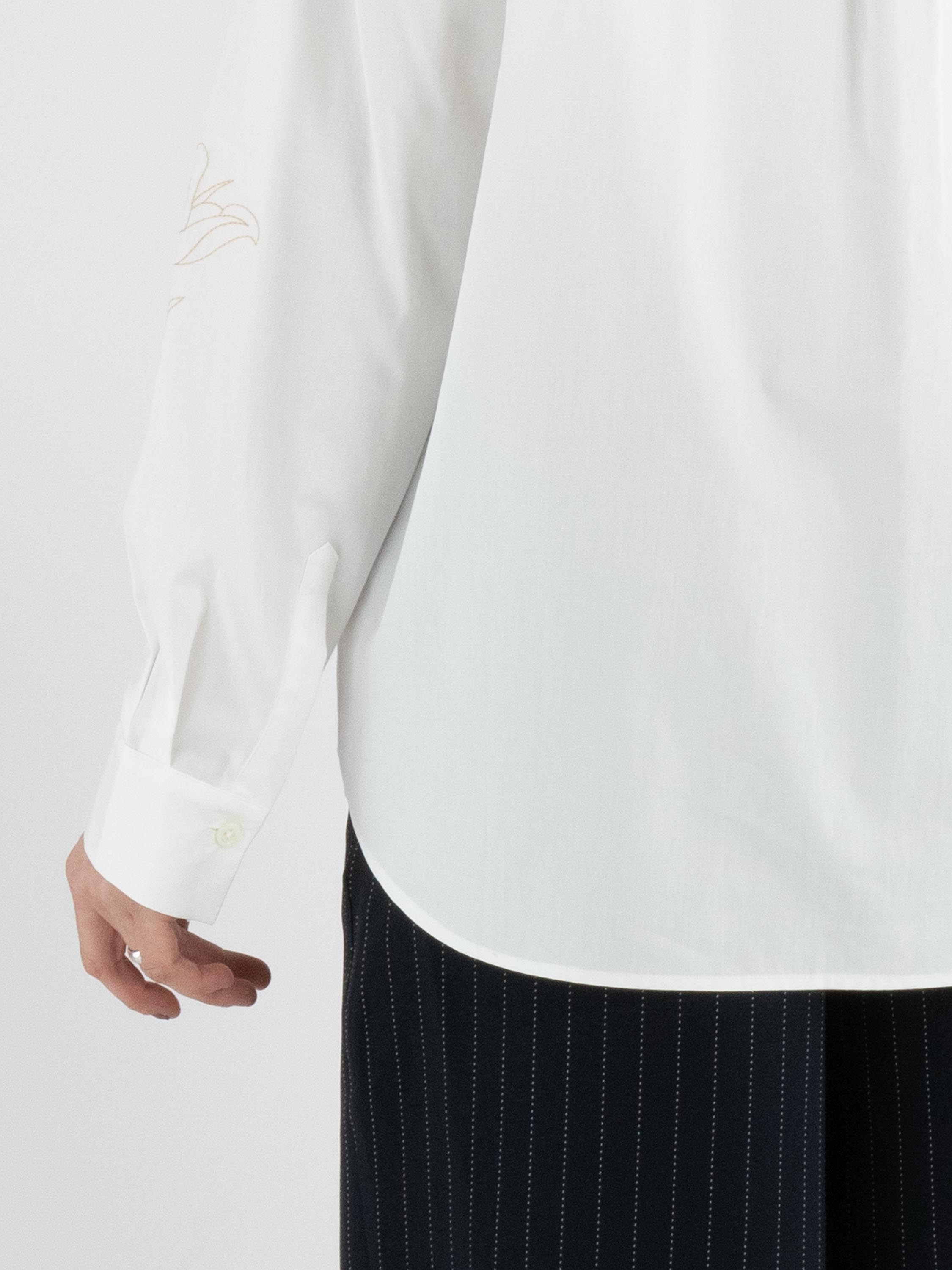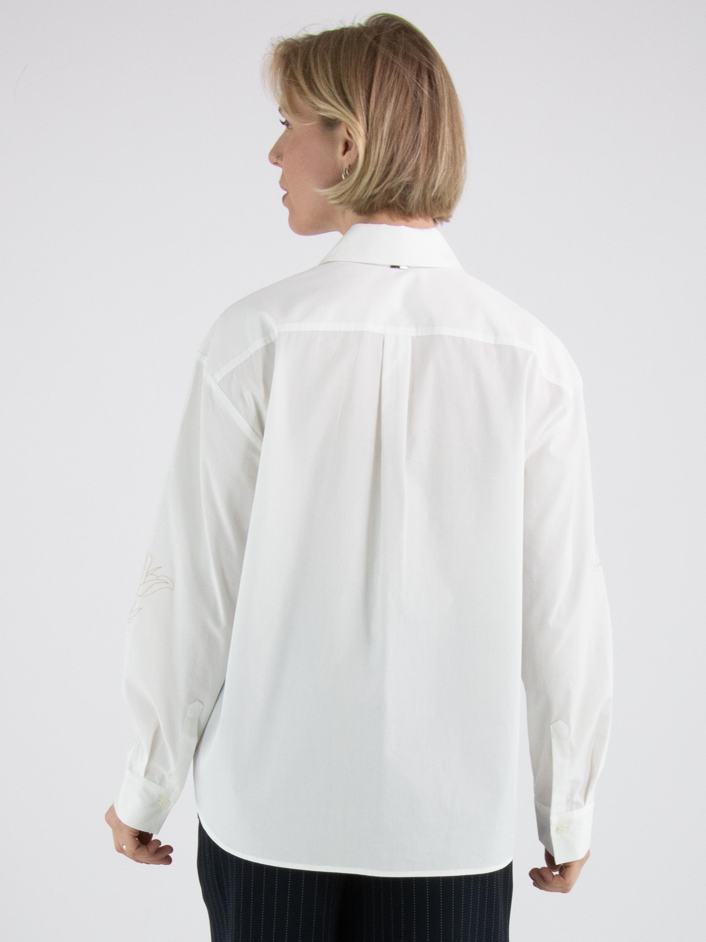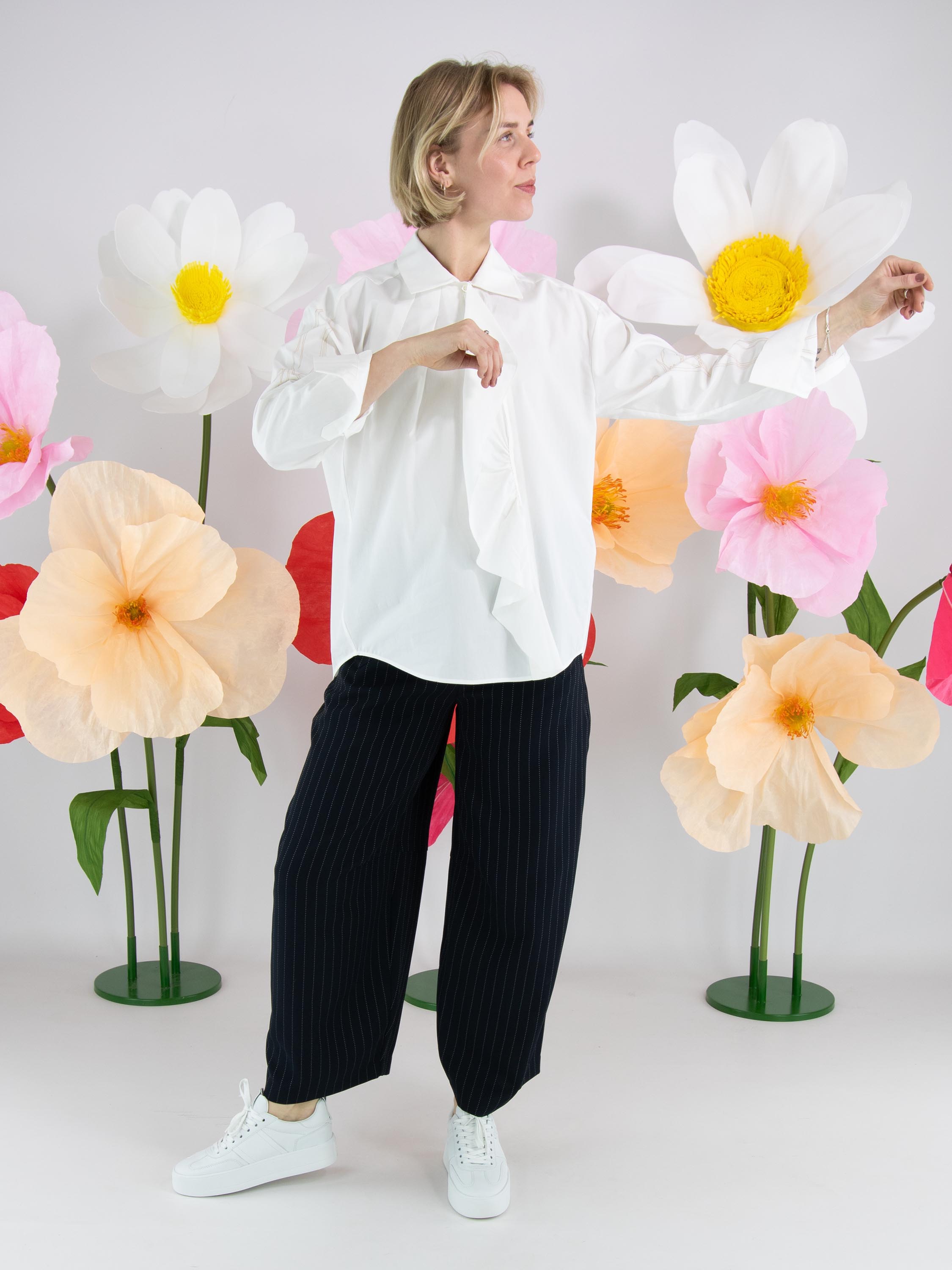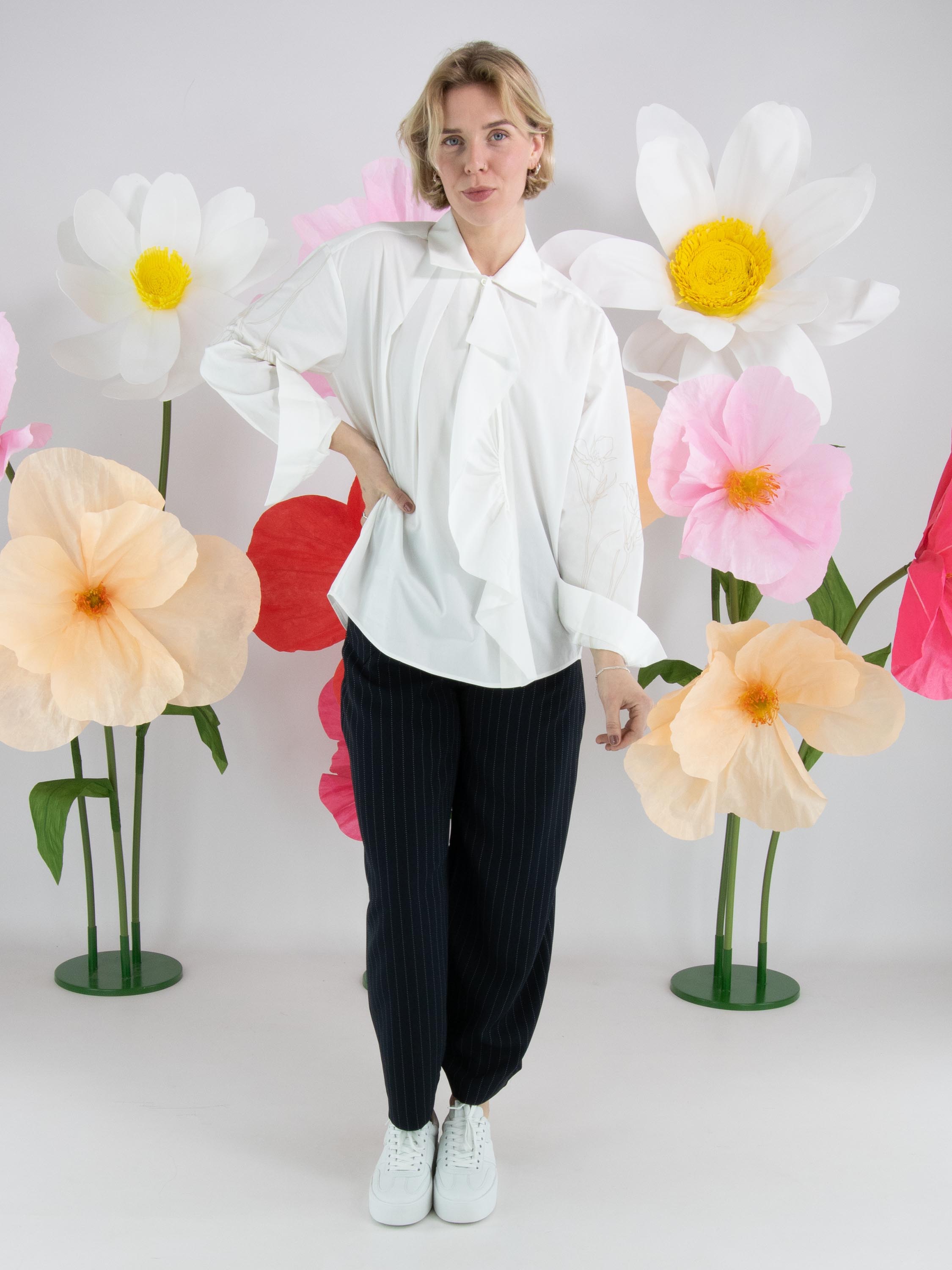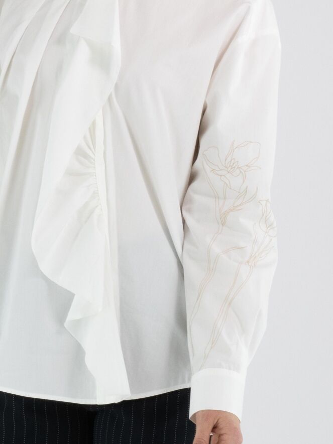 Een blouse van High in de kleur wit. Vanuit de achterkant van de hals lopen twee plisséplooien diagonaal naar beneden en vormen een volant langs de knoopsluiting. Op de lange mouwen zijn met zandkleurig stikdraad decoratieve bloemen gestikt. Deze blouse mag op de hand worden gewassen.