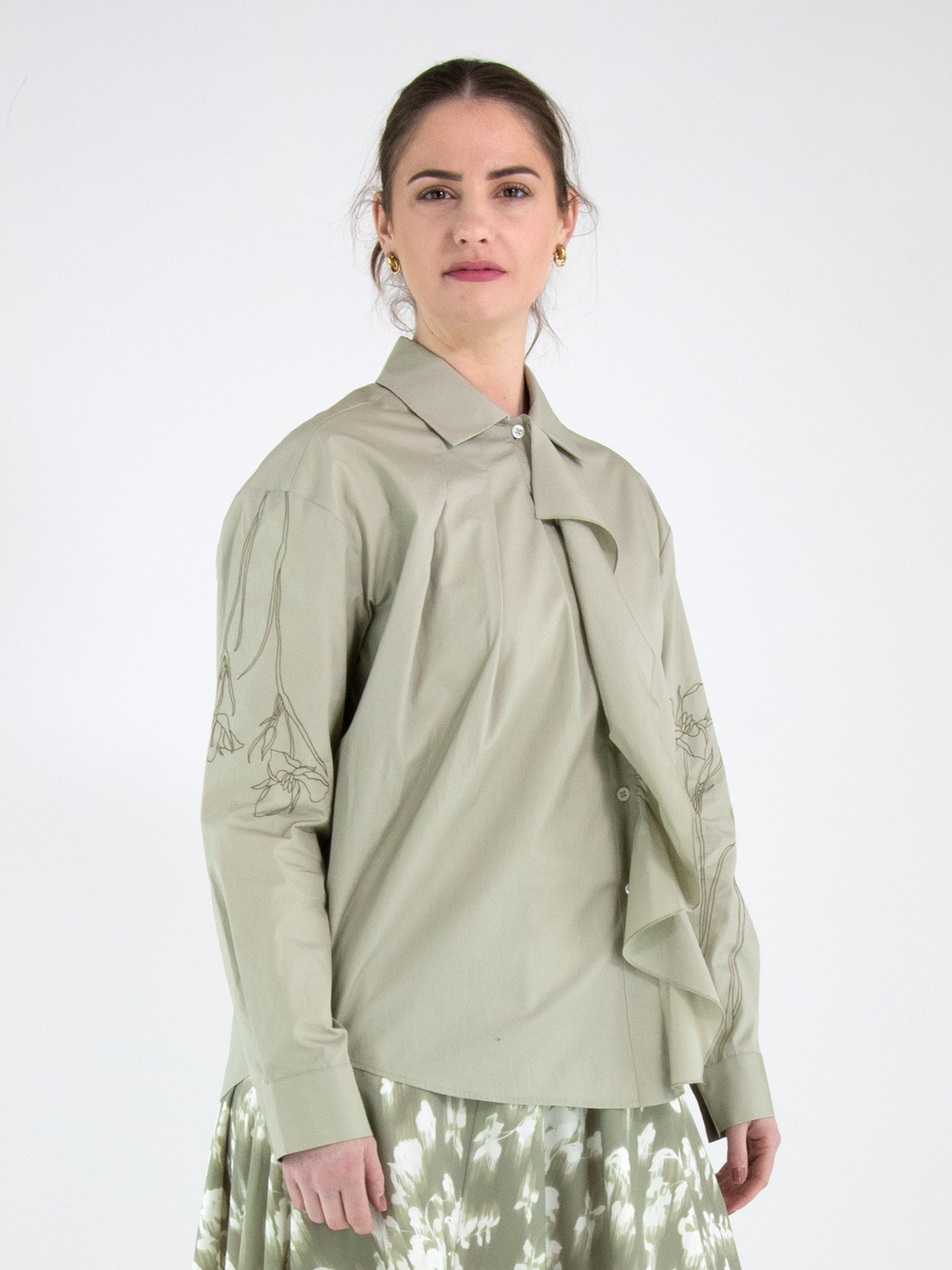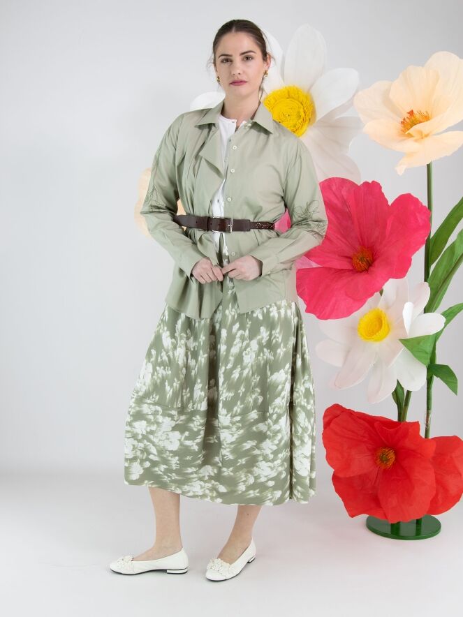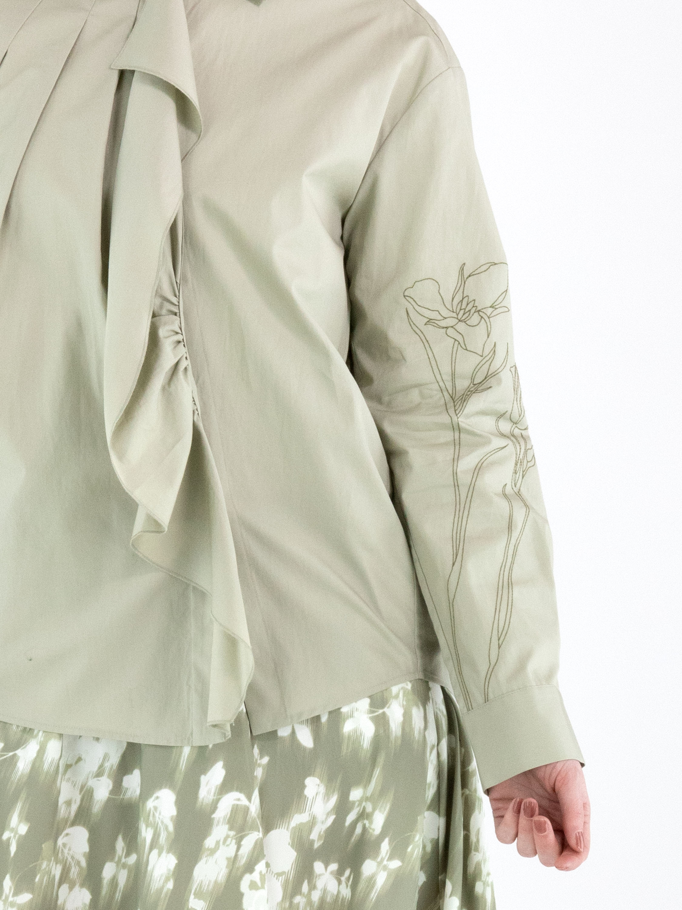 Een blouse van High in een pastel olijfgroene kleur. Vanuit de achterkant van de hals lopen twee plisséplooien diagonaal naar beneden en een volant langs de knoopsluiting. Op de lange mouwen zijn met zandkleurig stikdraad decoratieve bloemen gestikt. Deze blouse mag op de hand worden gewassen.