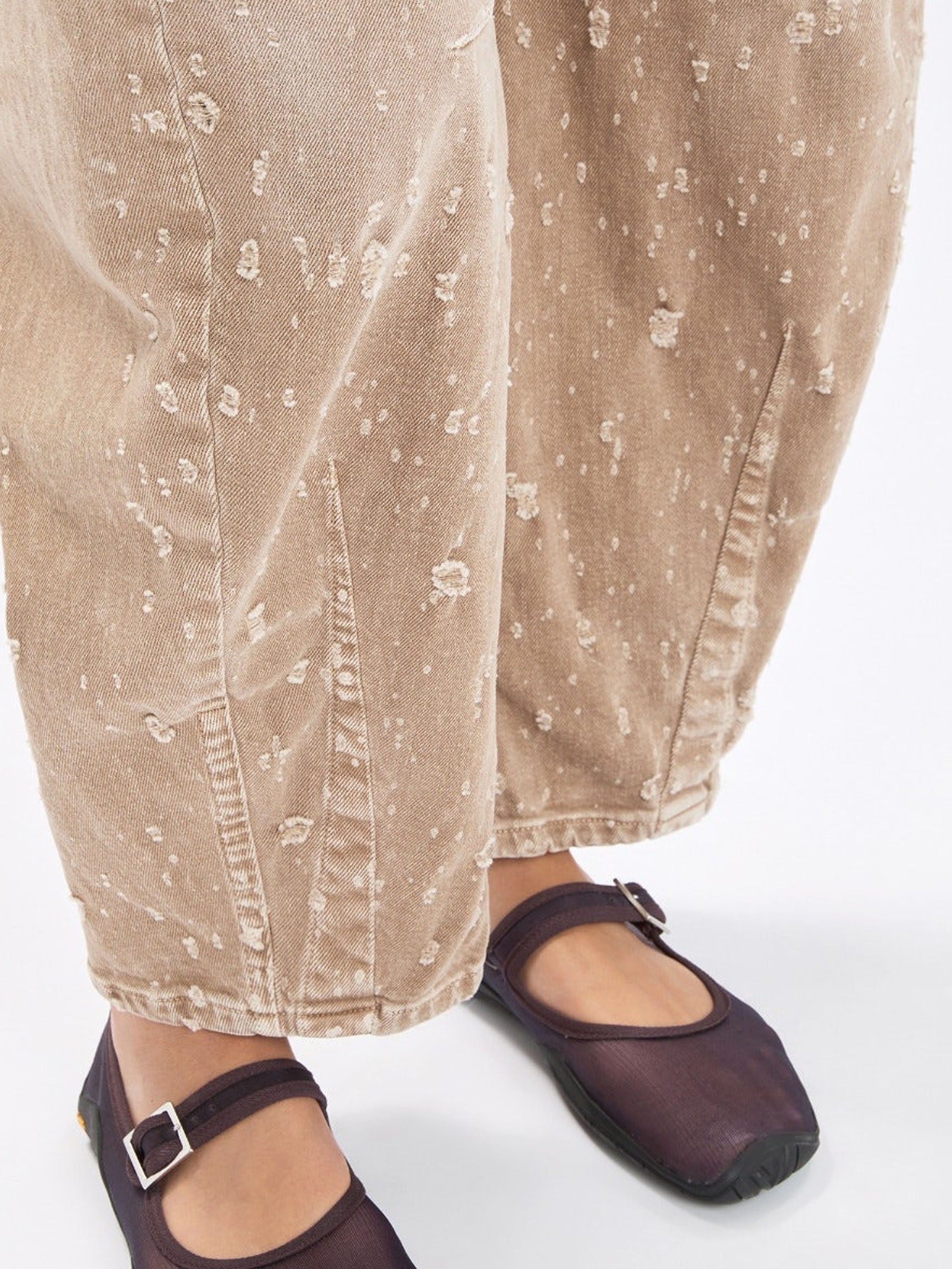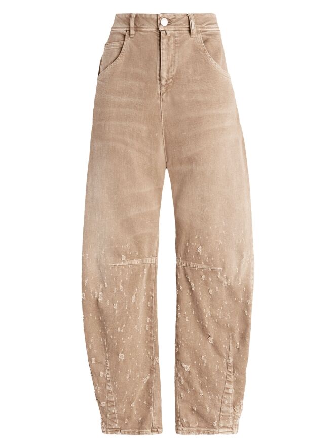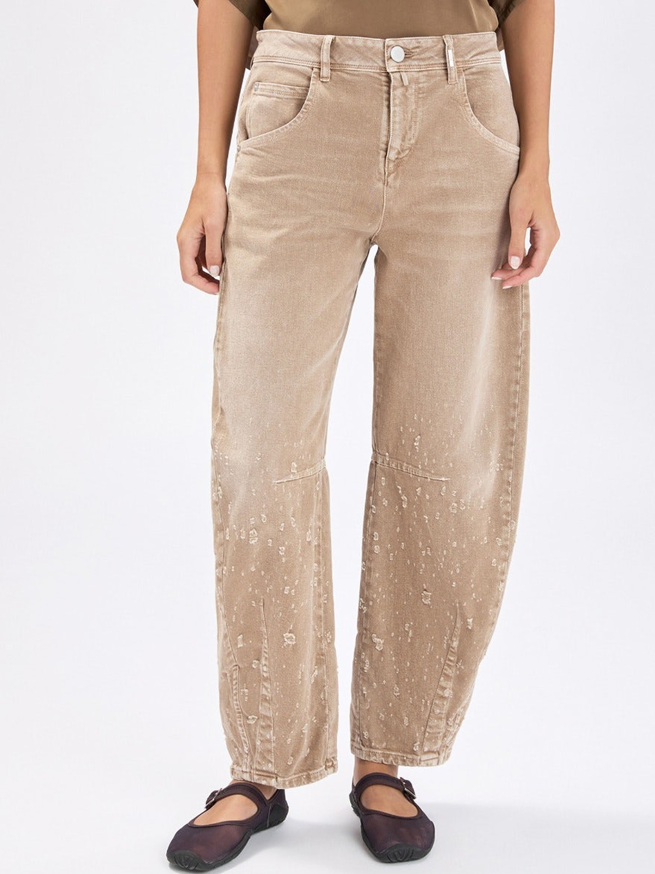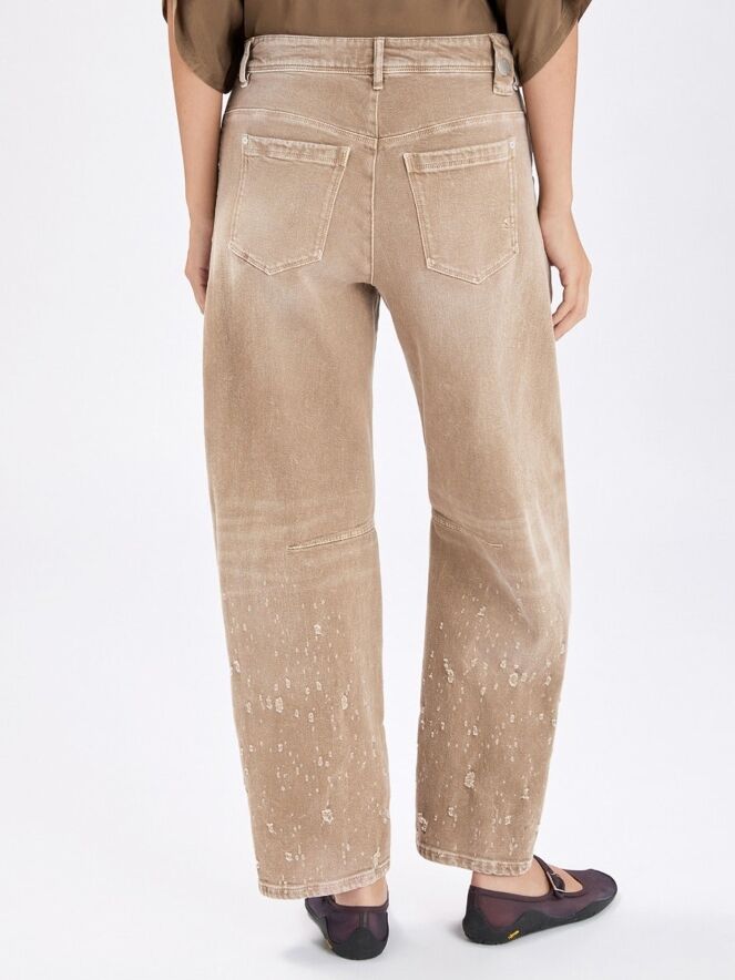 Jeans van High in een zachte bruine tint. De jeans is uitgevoerd in een klassiek 5-pocket model. Vanaf kniehoogte is de stof naar beneden toe handmatig opgehaald, wat zorgt voor een subtiel gedragen en eigentijds effect. Deze jeans kan op 30 graden worden gewassen.