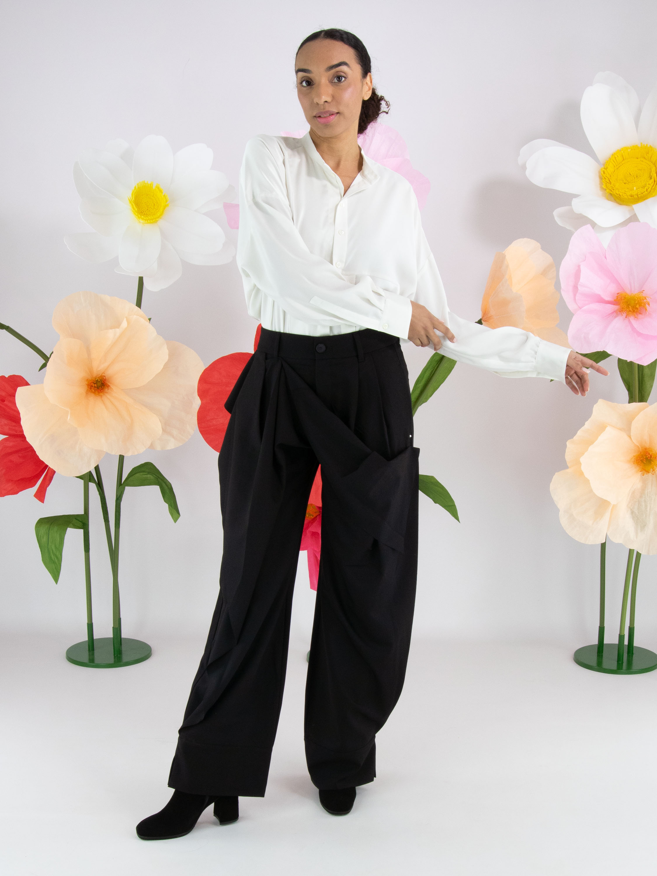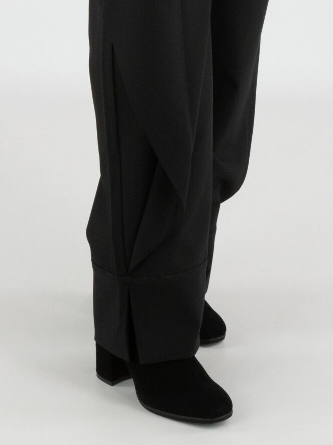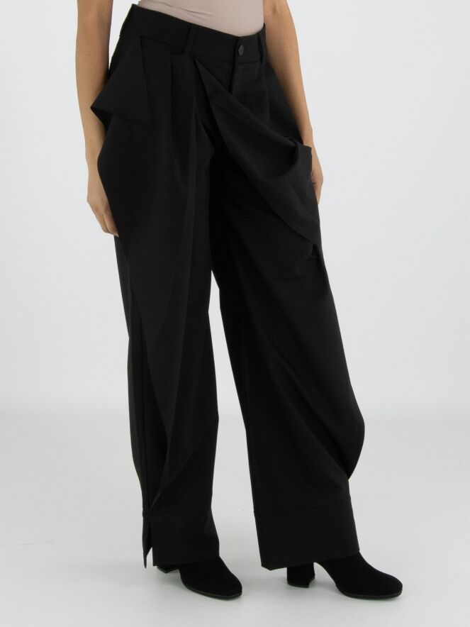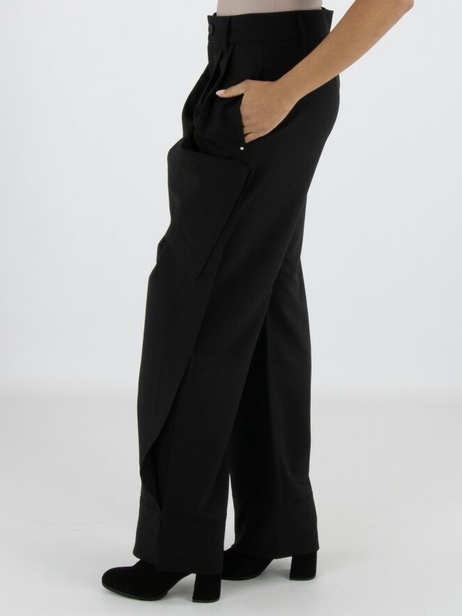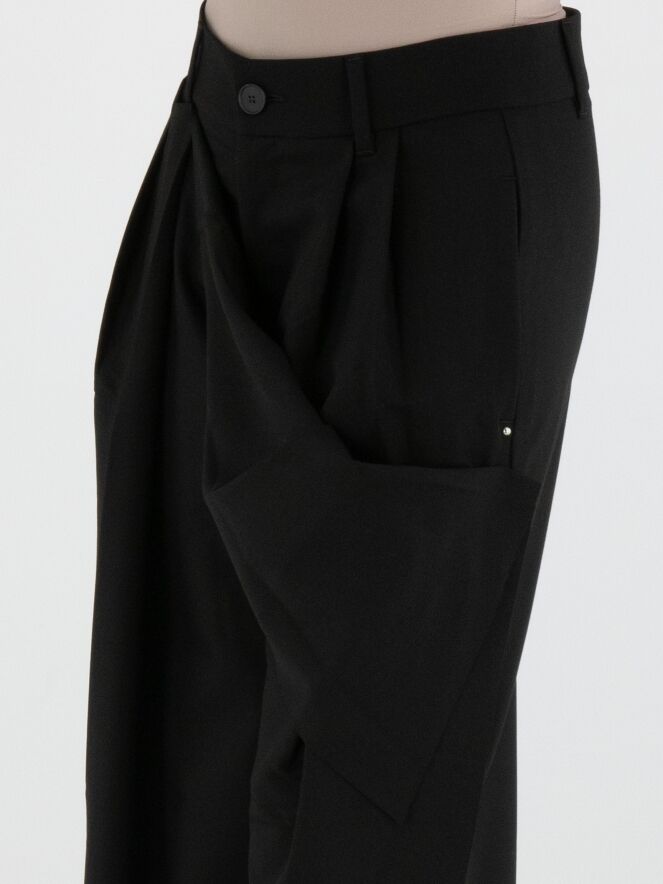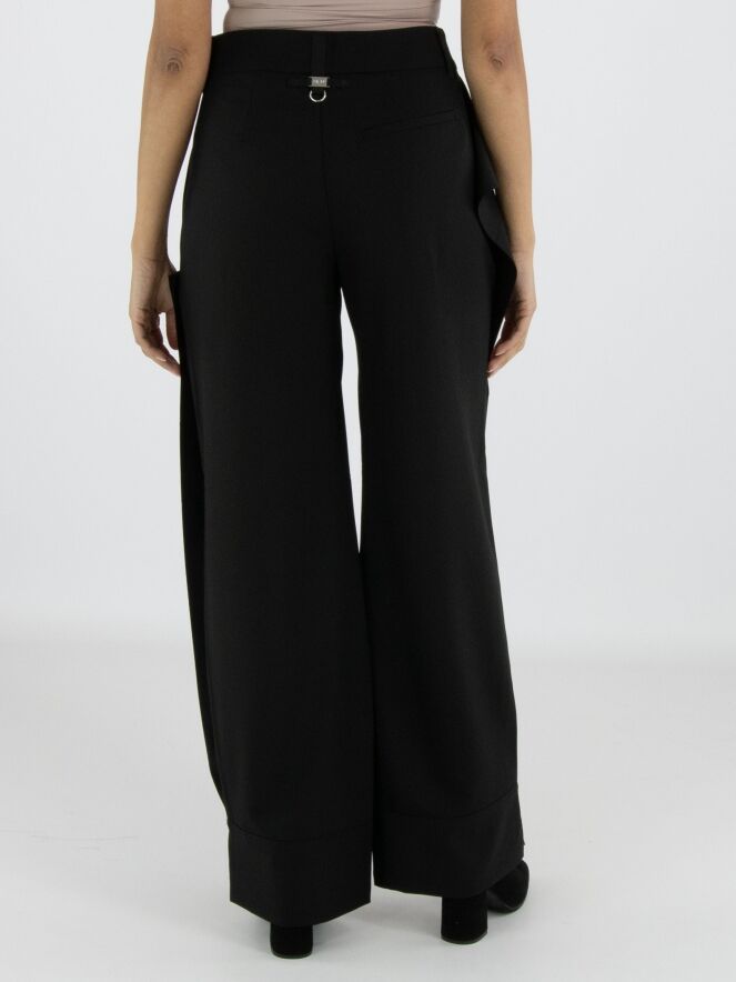 Een design pantalon van High in de kleur zwart. Aan de voorzijde loopt vanuit de onderkant van de pijpen een dubbele stof, die aan de linkerkant is vastgezet tot net onder de steekzakken en aan de rechterkant op twee posities net onder de tailleband. Hierdoor ontstaat aan de voorkant ter hoogte van de heup een overslageffect. De dubbele stof is aan de zijkanten van de pijpen niet vastgezet, wat het gelaagde effect extra accentueert. Deze broek mag niet worden gewassen.