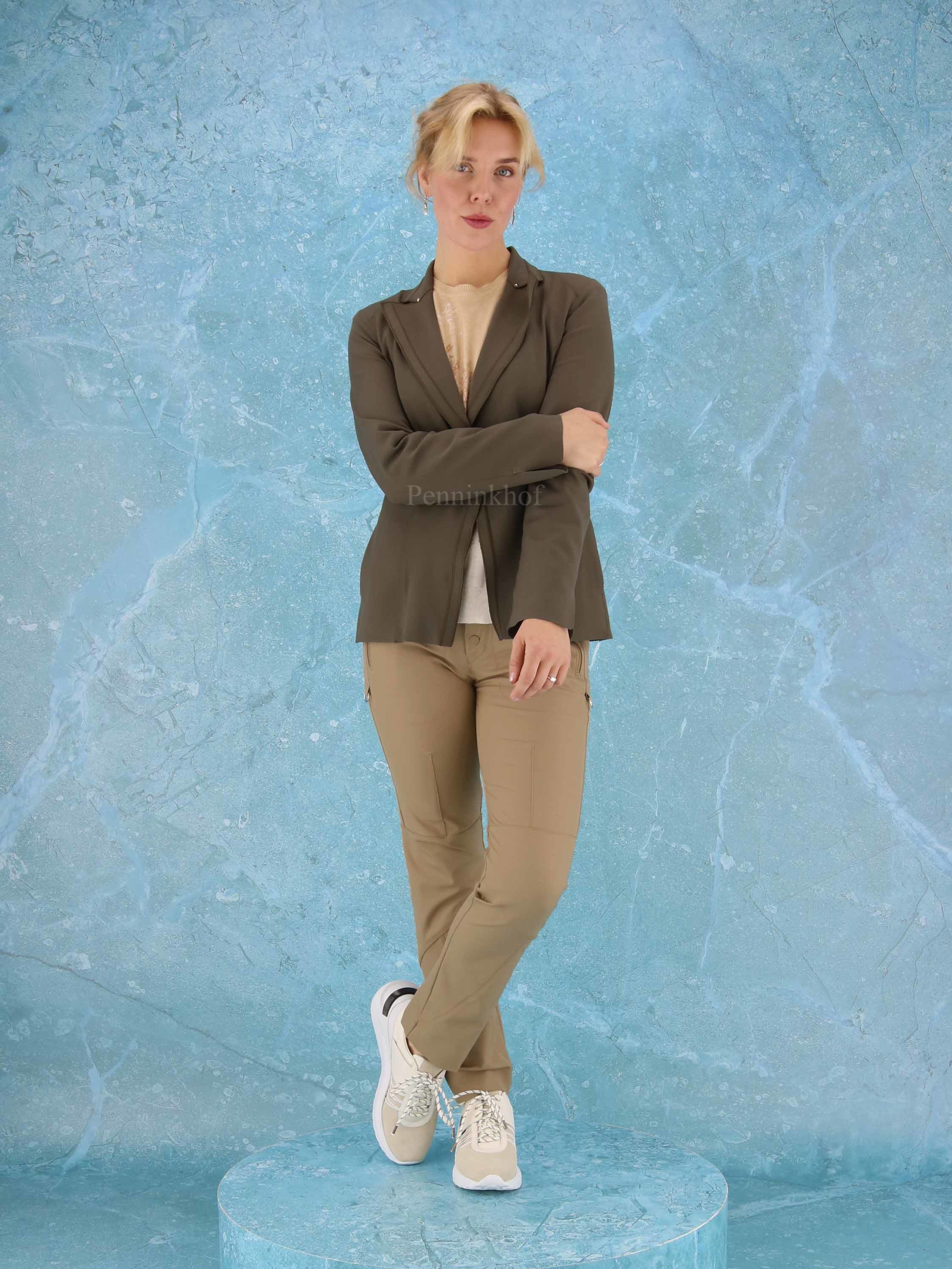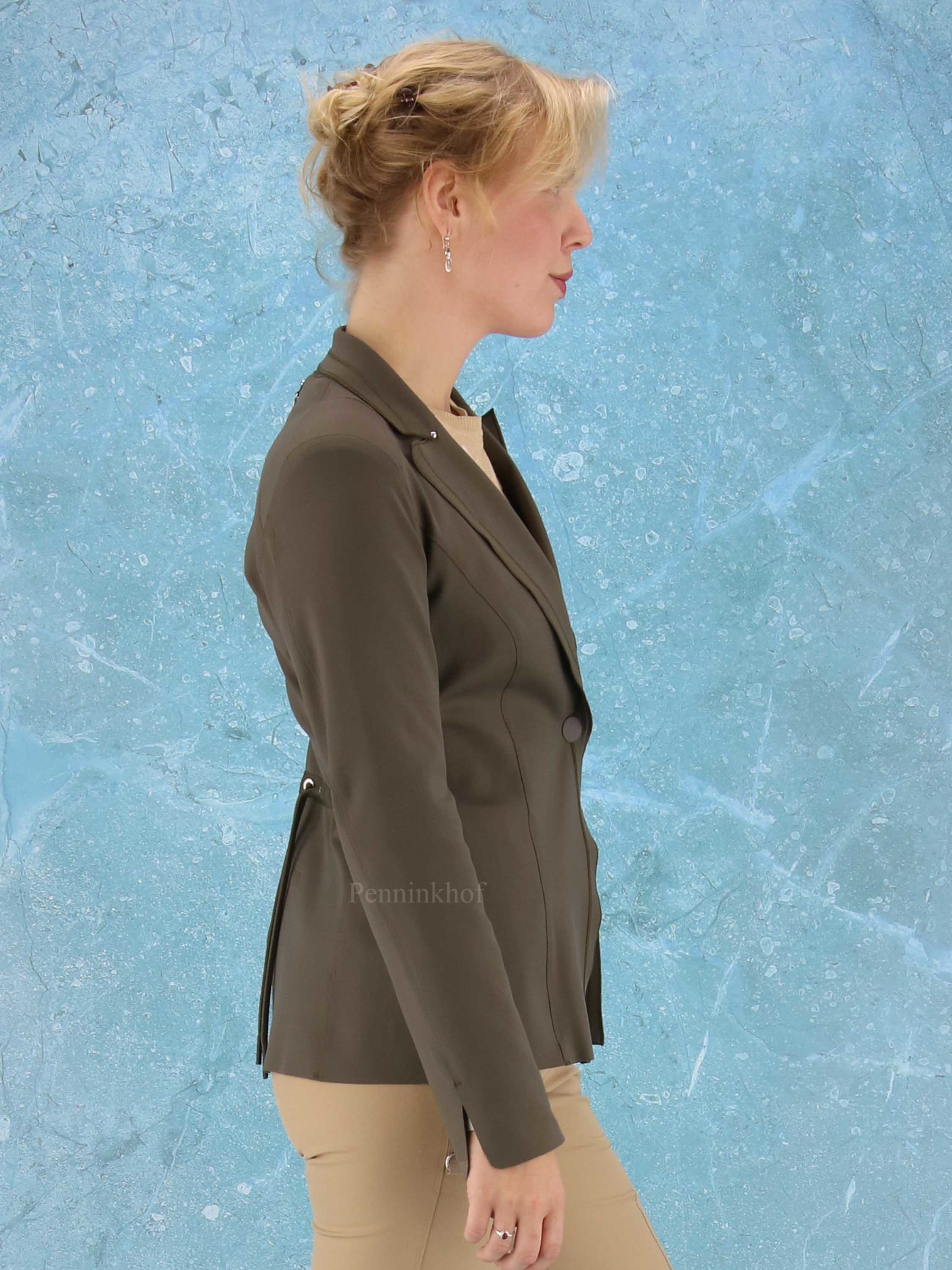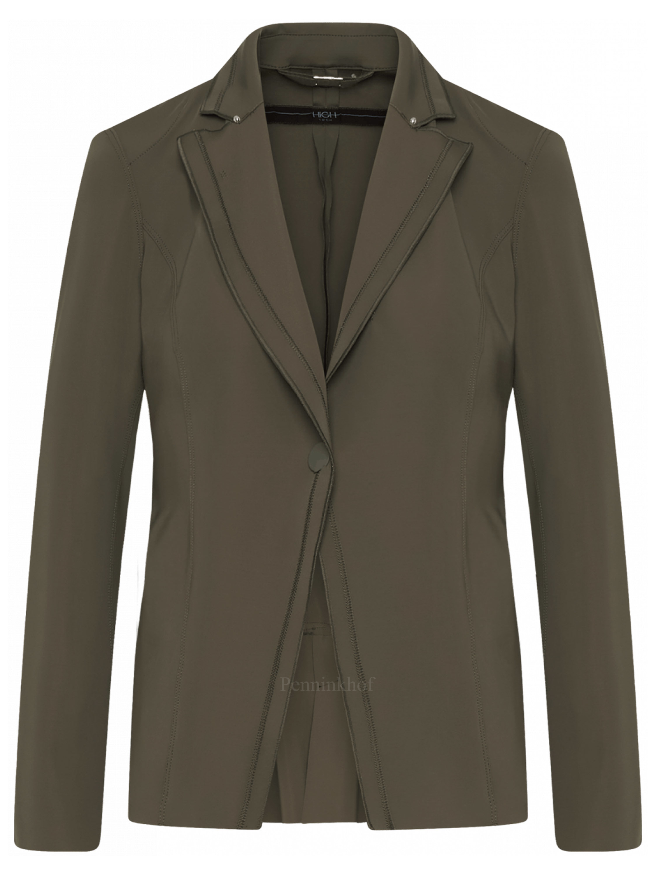 Een blazer van High in de kleur olijfgroen. In de rever zijn ter hoogte van de hals 2 decoratieve zilver kleurige studs. Aan de achterkant is ter hoogte van de taille een mat satijnen bies met in het midden een koord waarmee een getailleerd effect kan worden gecreëerd. De blazer heeft een sluiting met één drukknoop en is ongevoerd. Deze blazer mag op de hand worden gewassen.