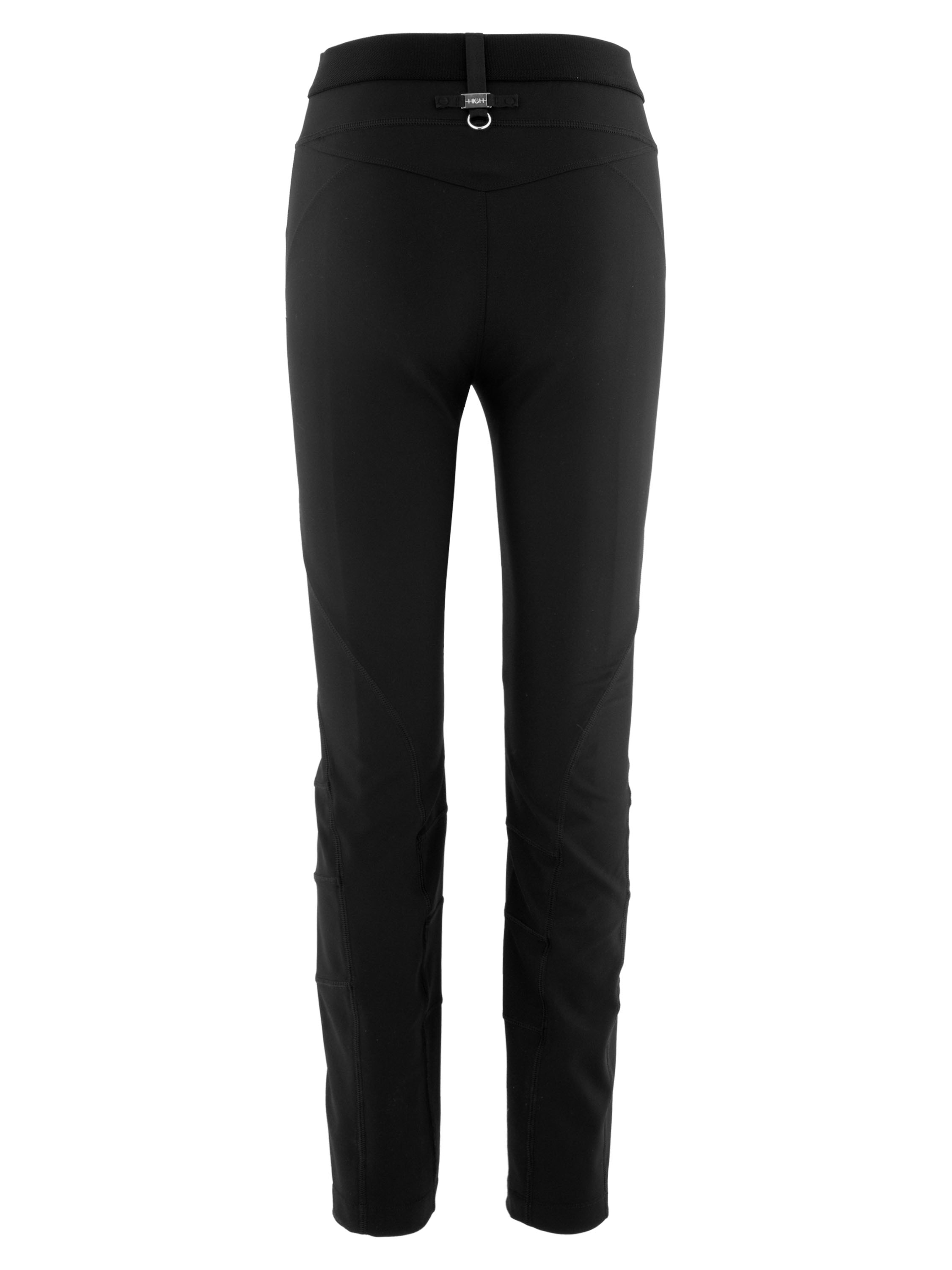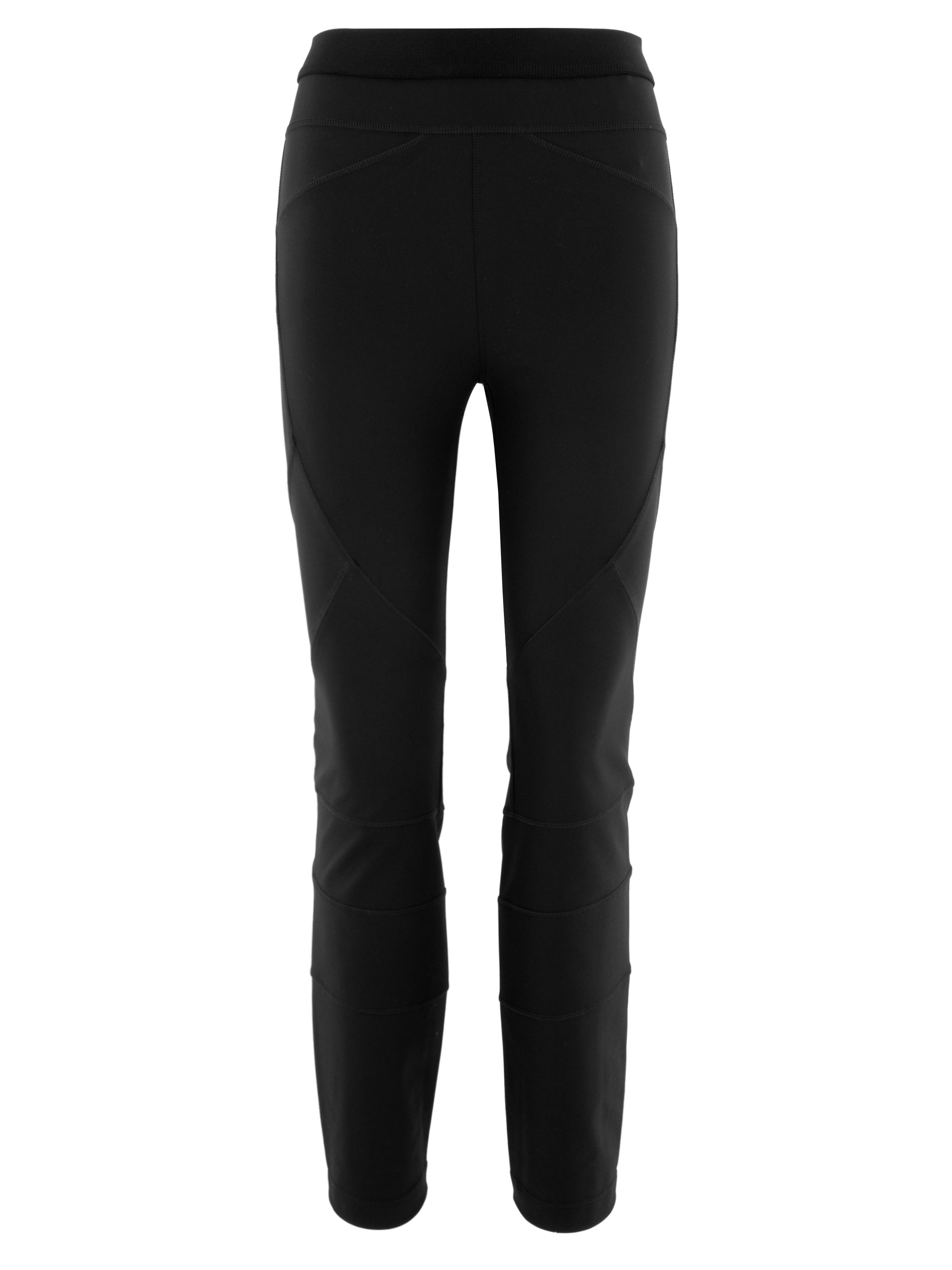 Een broek van High in de kleur zwart. In de taille is een elastieken band. De broek heeft meerdere decoratieve diagonale en horizontale stiknaden. Deze broek mag op de hand worden gewassen.
