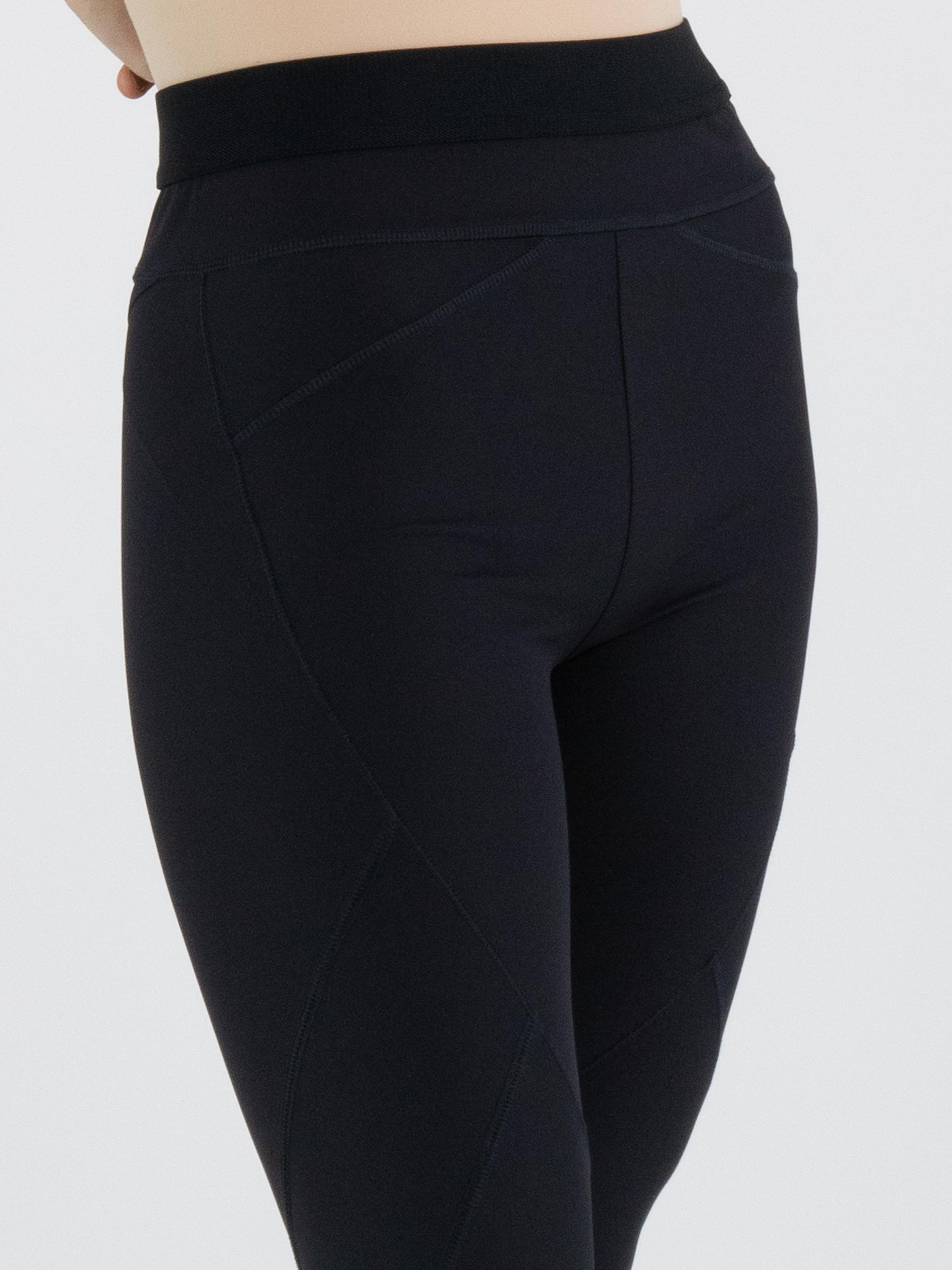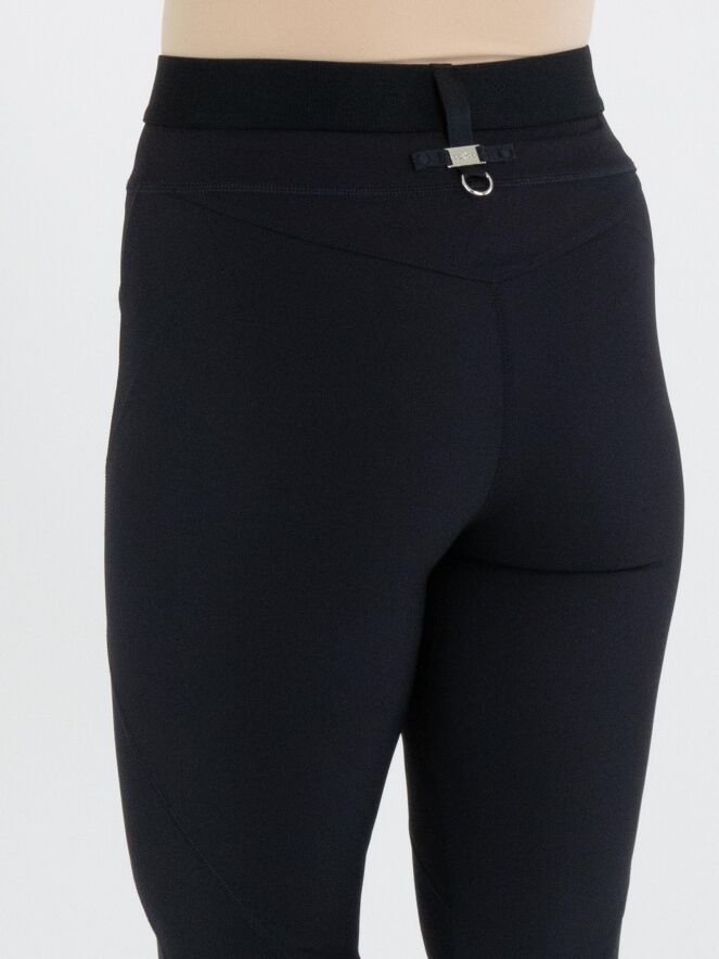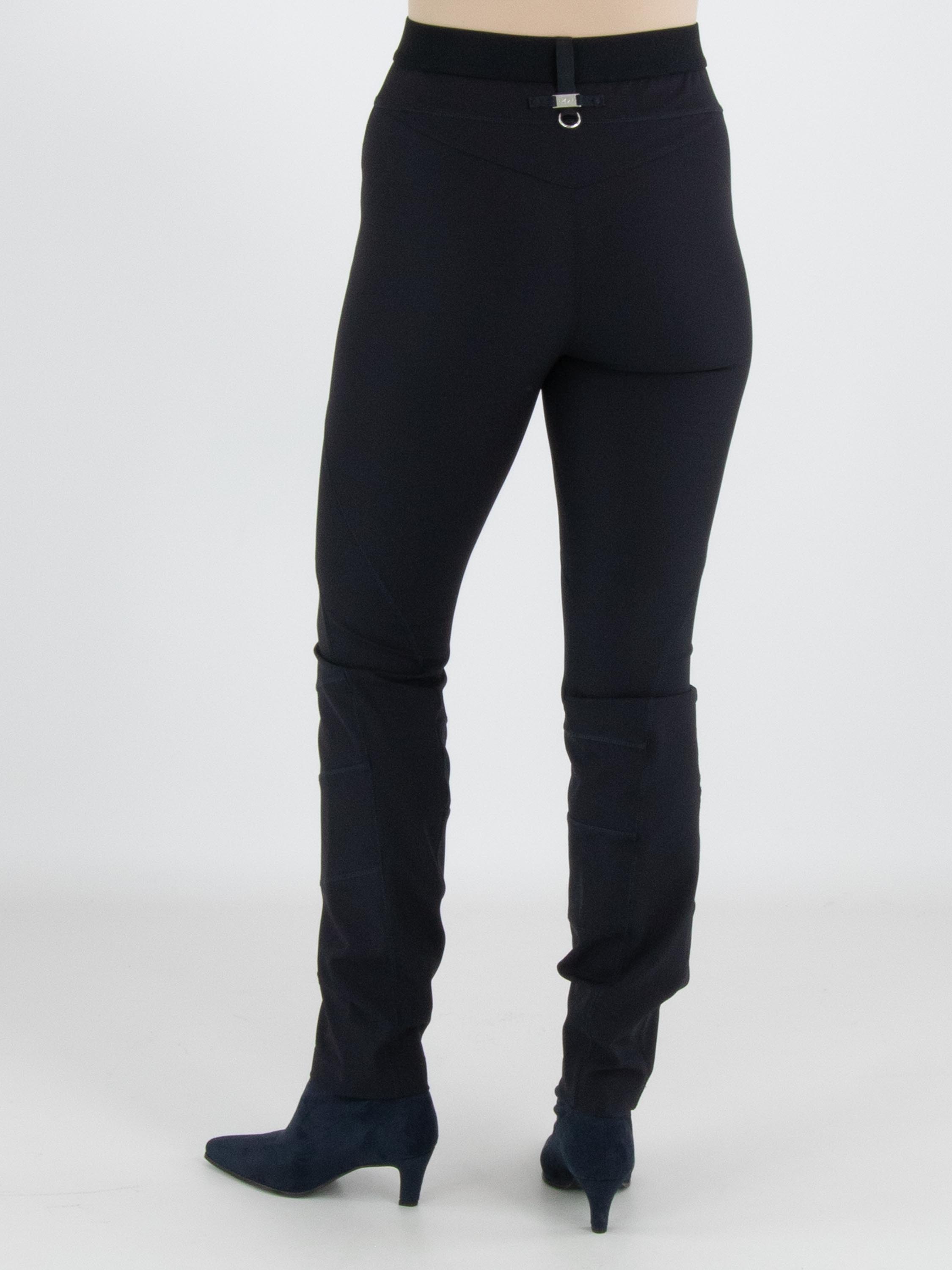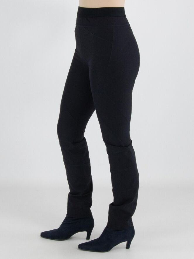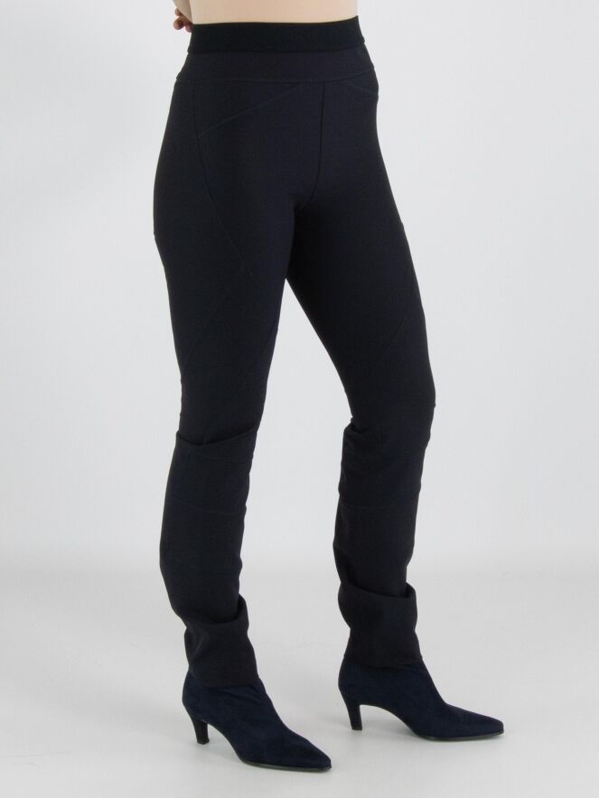 Een broek van High in de kleur marineblauw. In de taille is een elastieken band. De broek heeft meerdere decoratieve diagonale en horizontale stiknaden. Deze broek mag op de hand worden gewassen.