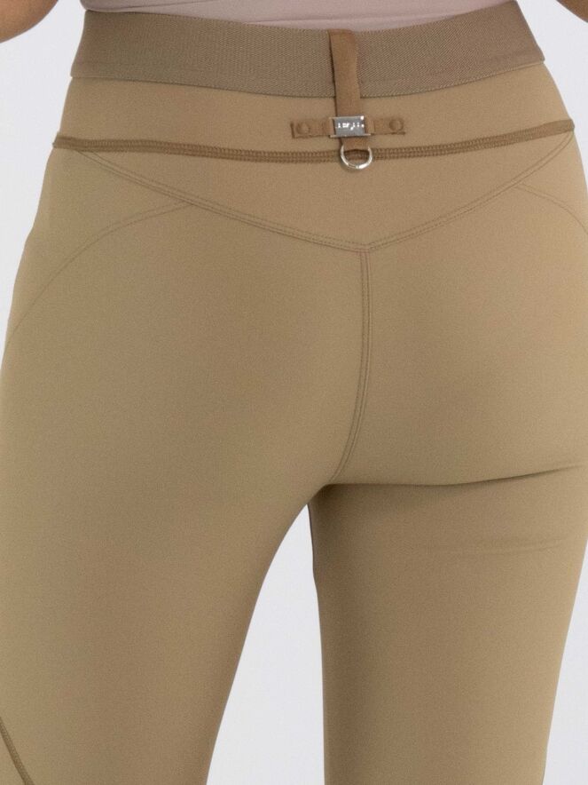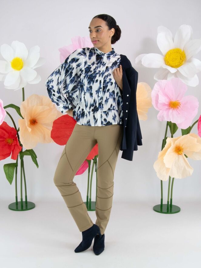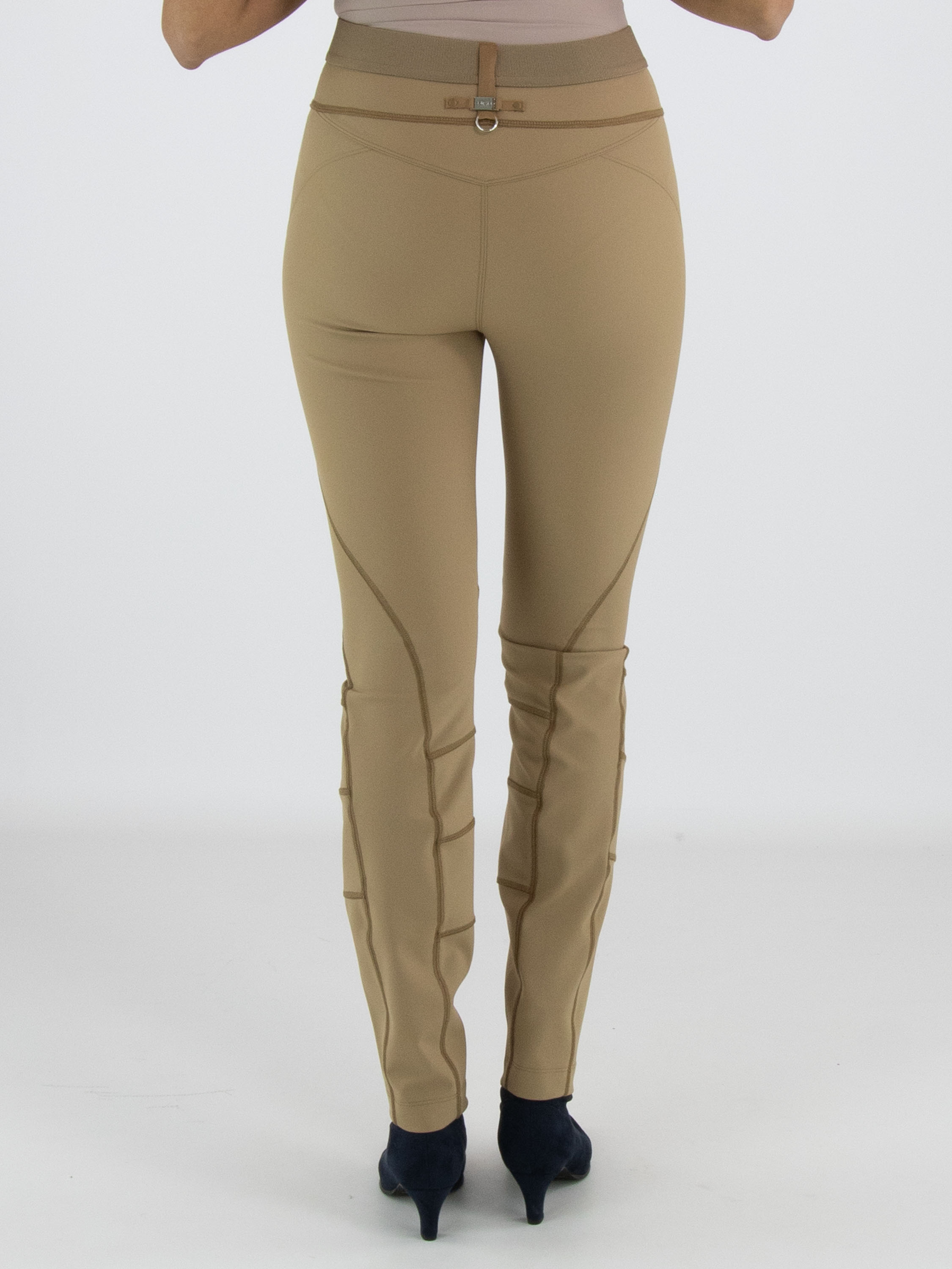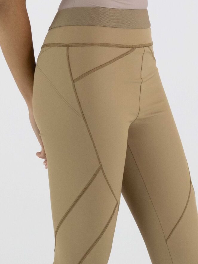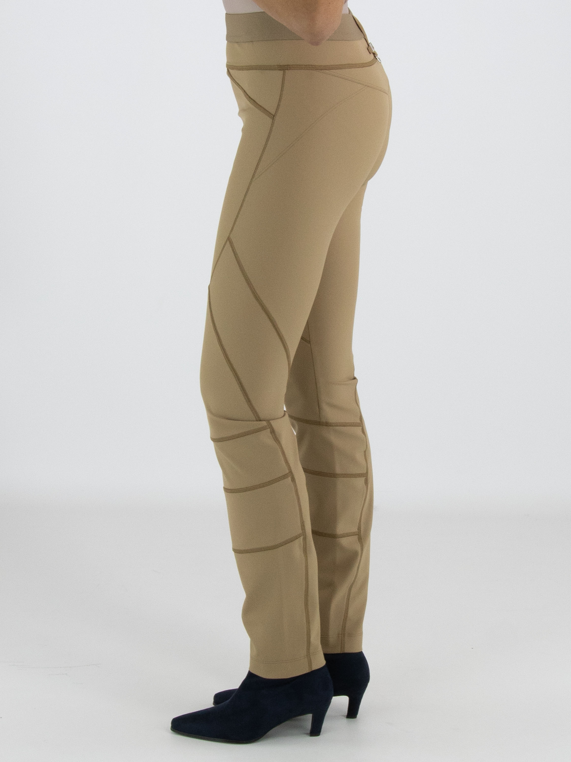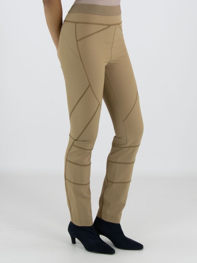 Een broek van High in de kleur camel of mosterd. In de taille is een elastieken band. De broek heeft meerdere decoratieve diagonale en horizontale stiknaden. Deze broek mag op de hand worden gewassen.