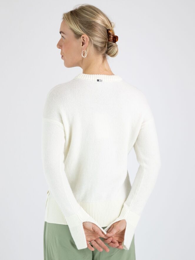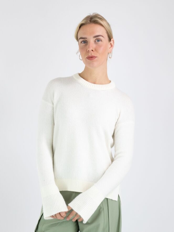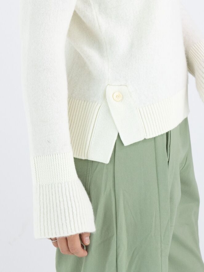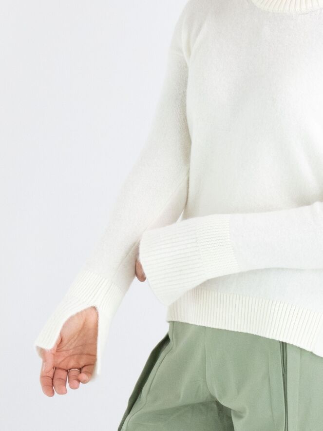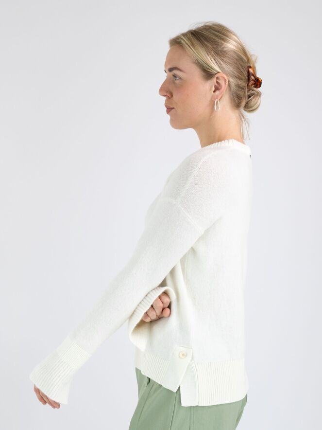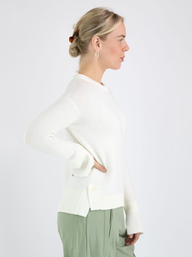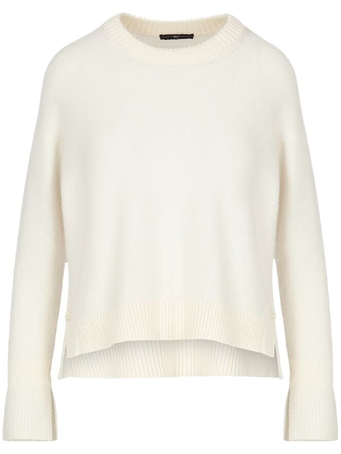 Een pullover van High in een roomwitte kleur. De pullover heeft een hoge ronde hals en lange mouwen. Aan de onderkant is een geribbelde tricotboord met aan de zijkanten een split met een knoopsluiting. Deze pullover mag met de hand worden gewassen.