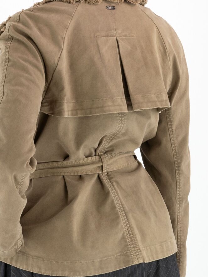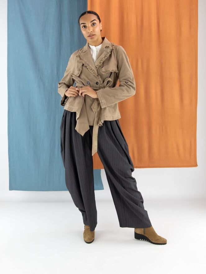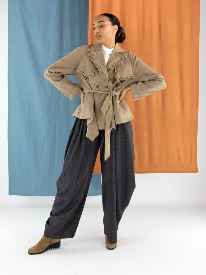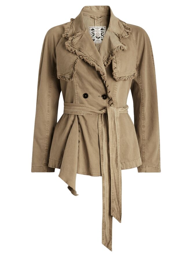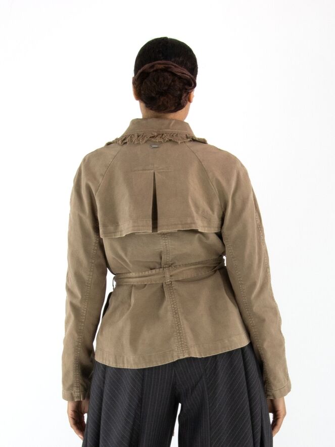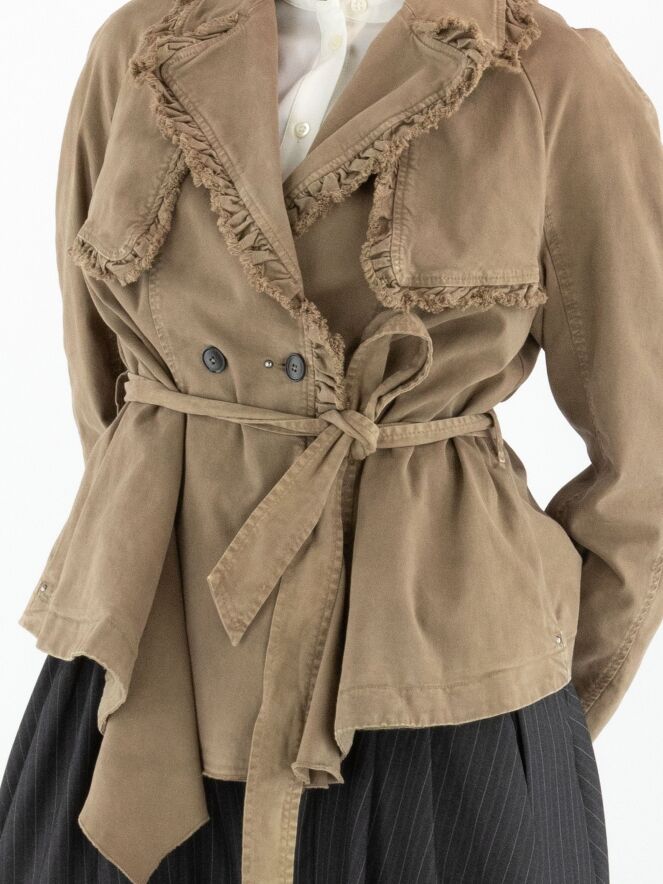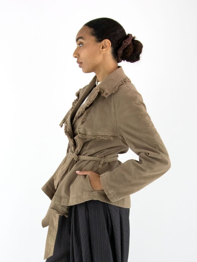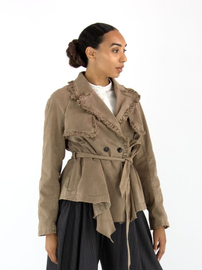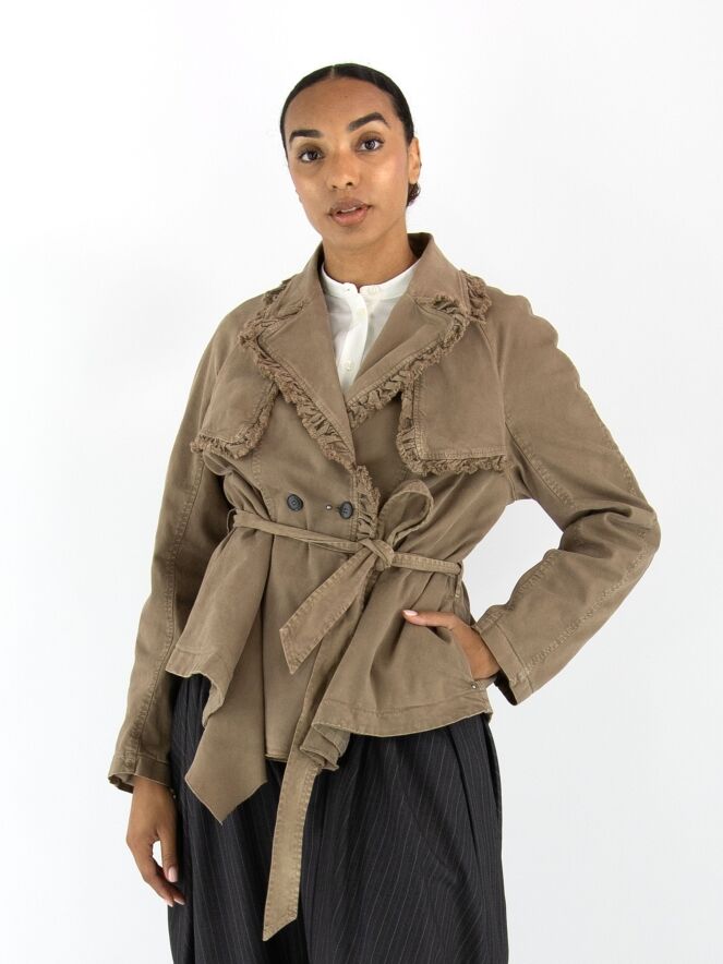 Een double-breasted blazer van High in de kleur olijfgroen. De randen van de kraag en hals zijn langs de stiknaden fijn geplooid en aan de buitenzijde subtiel gerafeld. In de taille bevindt zich een ceintuur in dezelfde stof als de blazer. De blazer heeft steekzakken en mag niet worden gewassen.