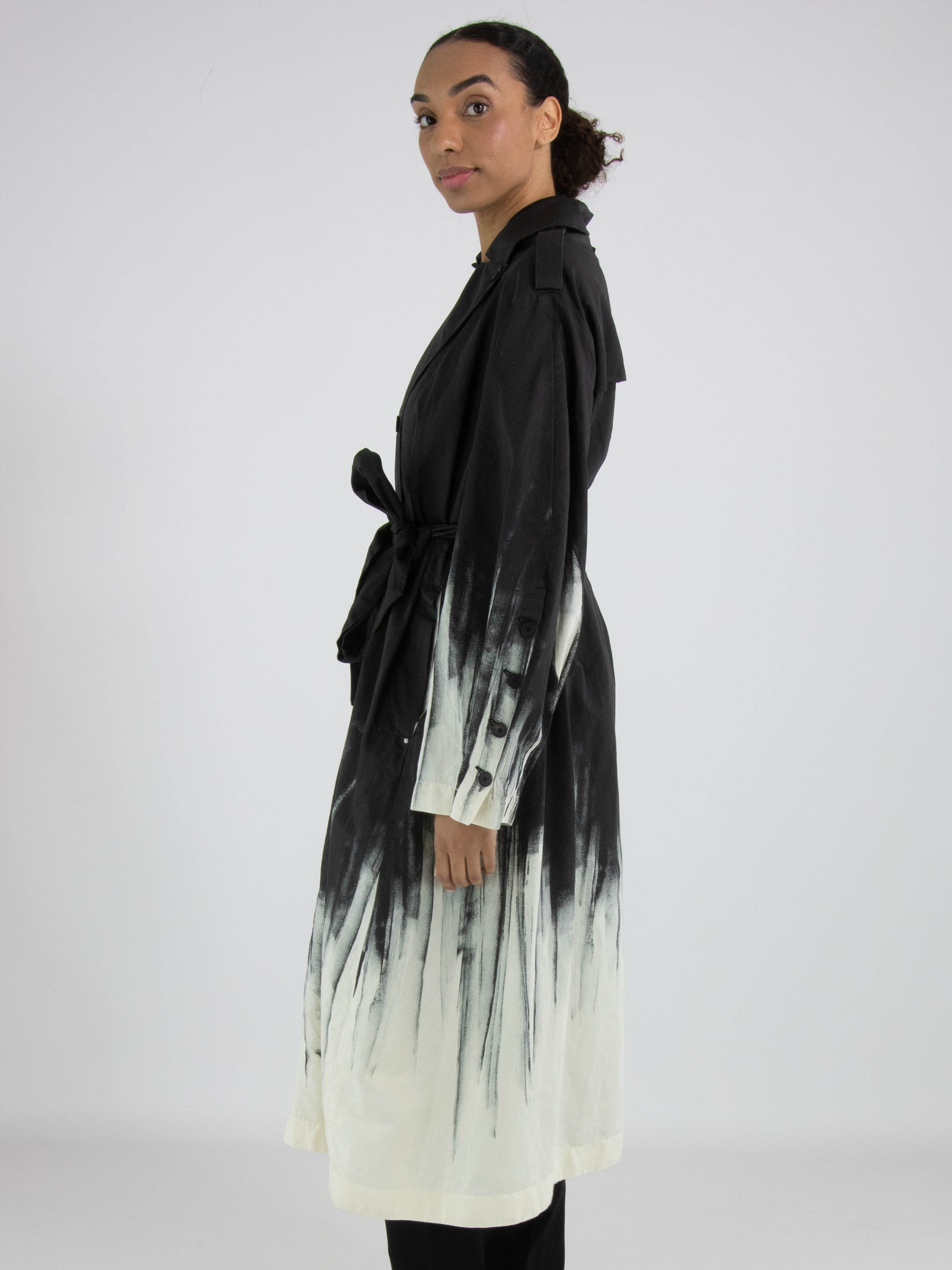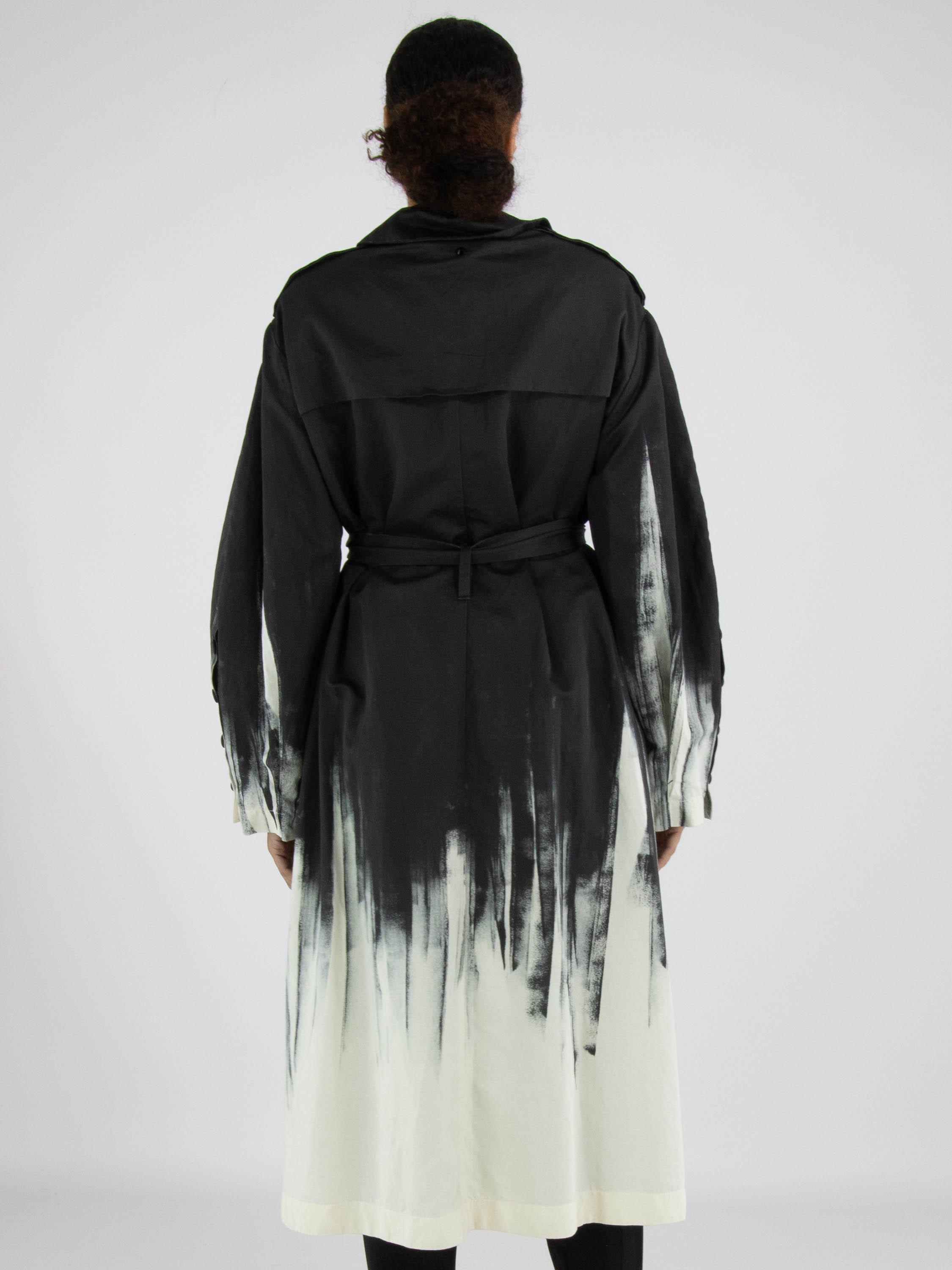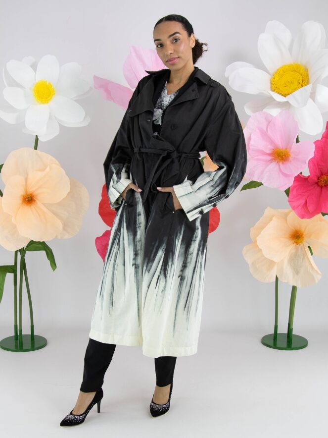Een gabardine van High in een paint look met een kleurverloop van Italiaans zwart aan de bovenkant naar roomwit aan de onderkant. De jas is licht getailleerd en heeft in de taille een ceintuur van dezelfde stof als de gabardine. Aan het uiteinde van de lange mouwen zit een ingestikte plooi met een diepe split, gesloten met vier knopen. Op de schouders zijn epauletten met een knoopsluiting. De gabardine is ongevoerd en mag niet worden gewassen.