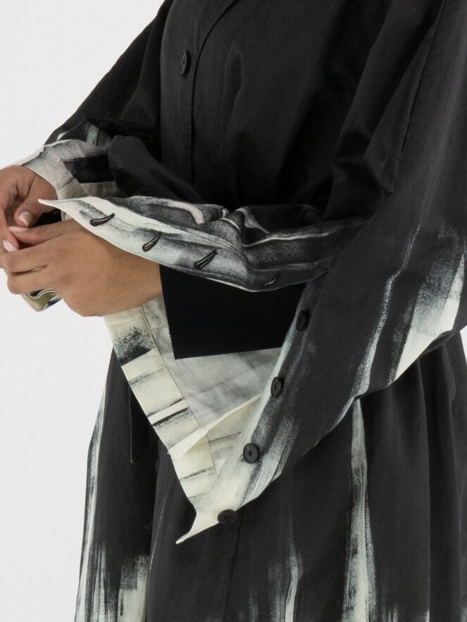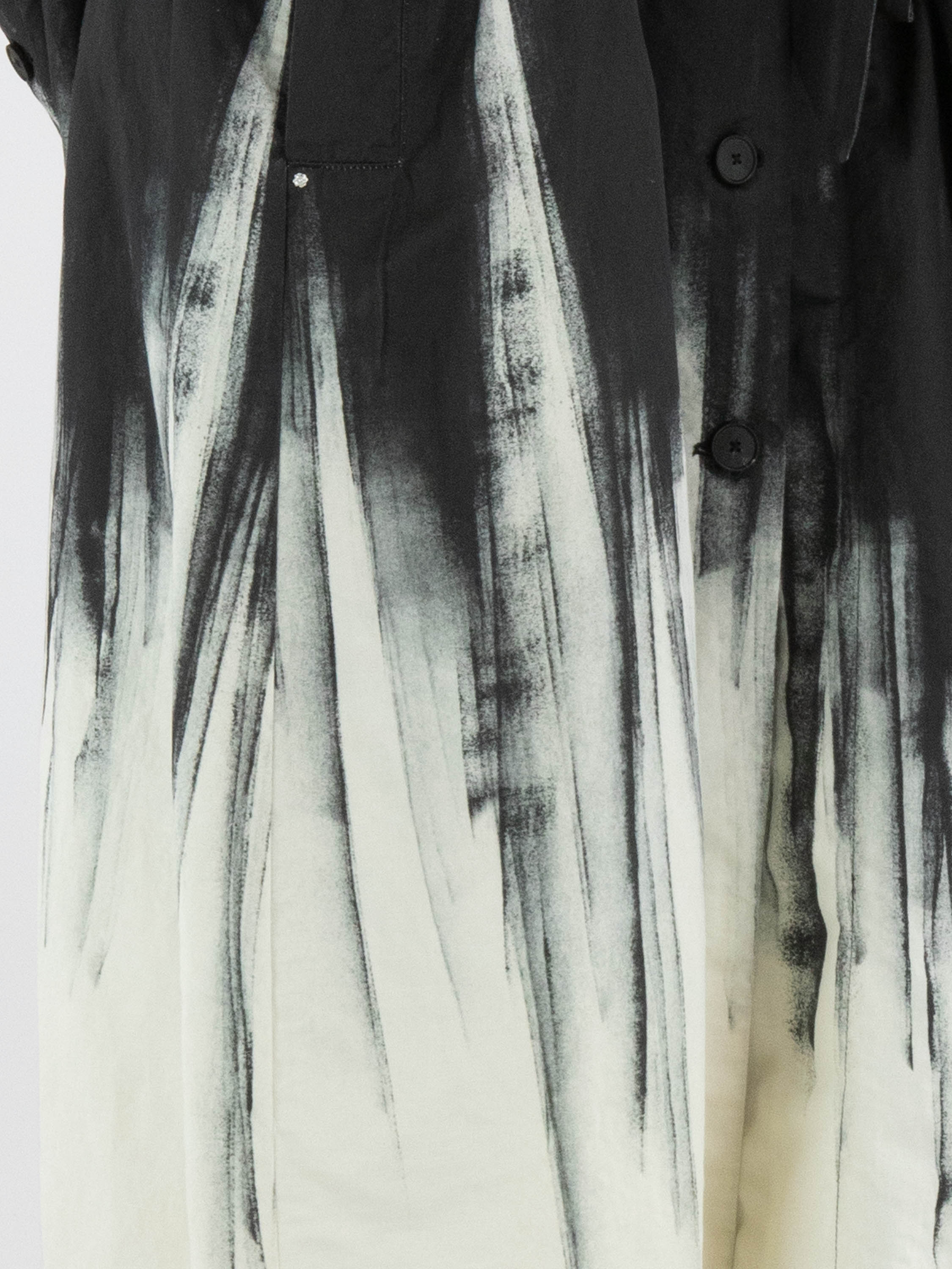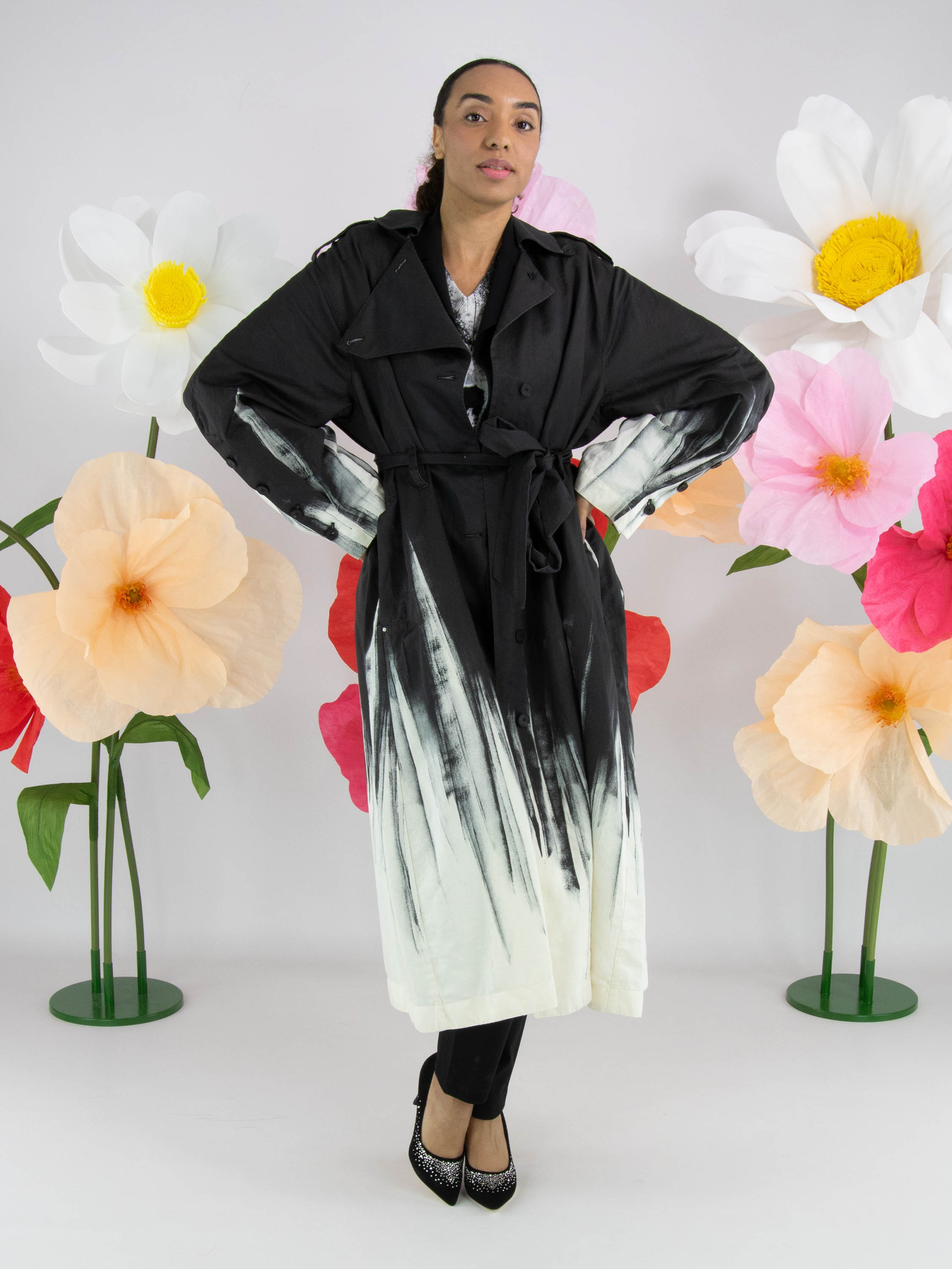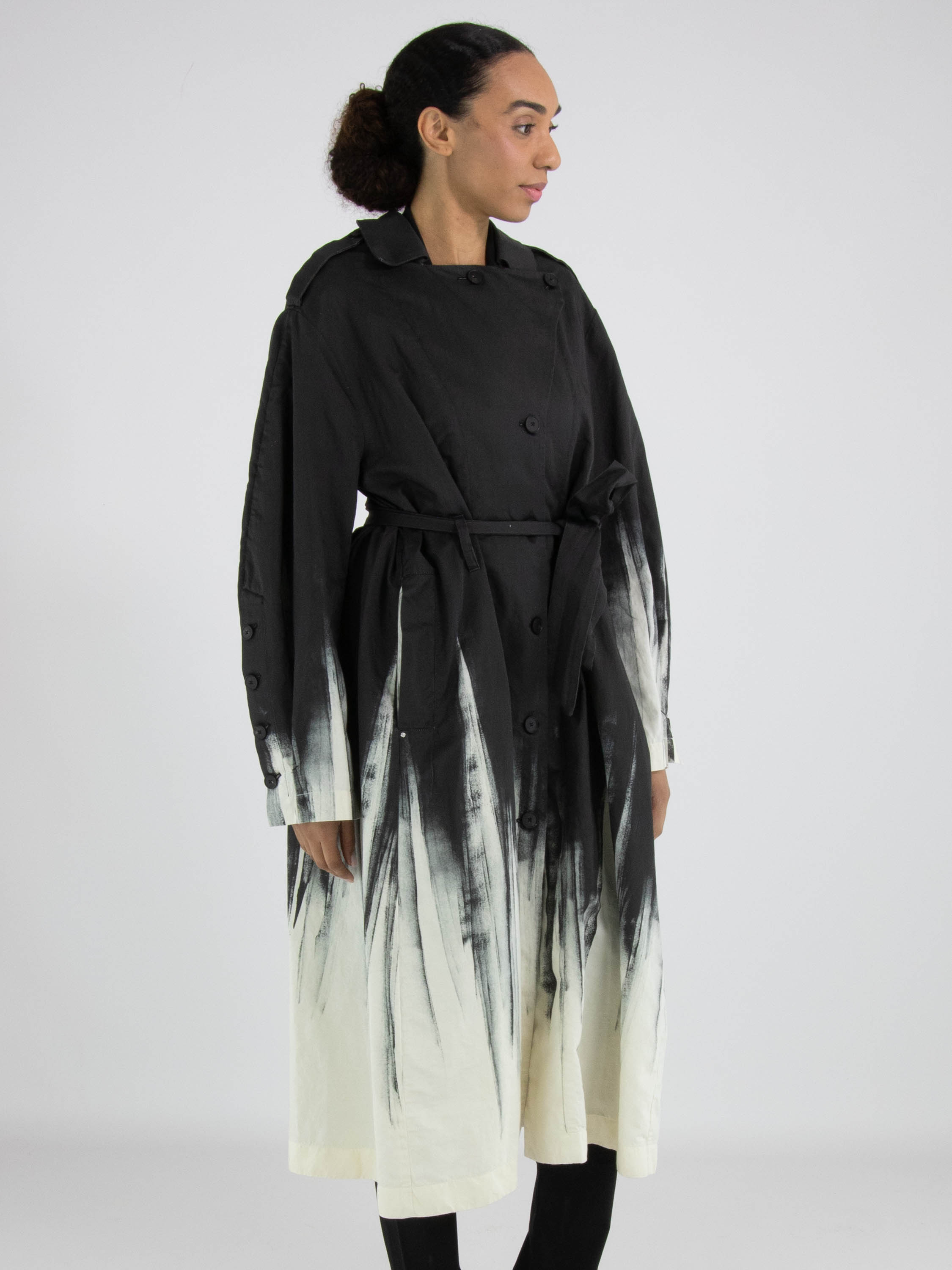 Een gabardine van High in een paint look met een kleurverloop van Italiaans zwart aan de bovenkant naar roomwit aan de onderkant. De jas is licht getailleerd en heeft in de taille een ceintuur van dezelfde stof als de gabardine. Aan het uiteinde van de lange mouwen zit een ingestikte plooi met een diepe split, gesloten met vier knopen. Op de schouders zijn epauletten met een knoopsluiting. De gabardine is ongevoerd en mag niet worden gewassen.