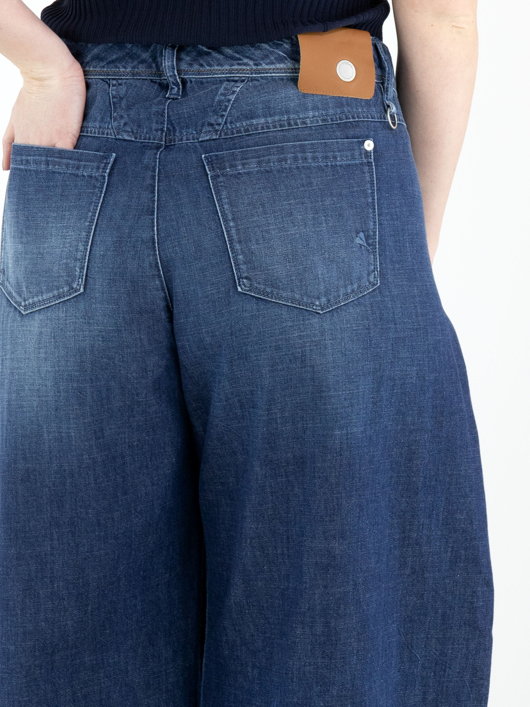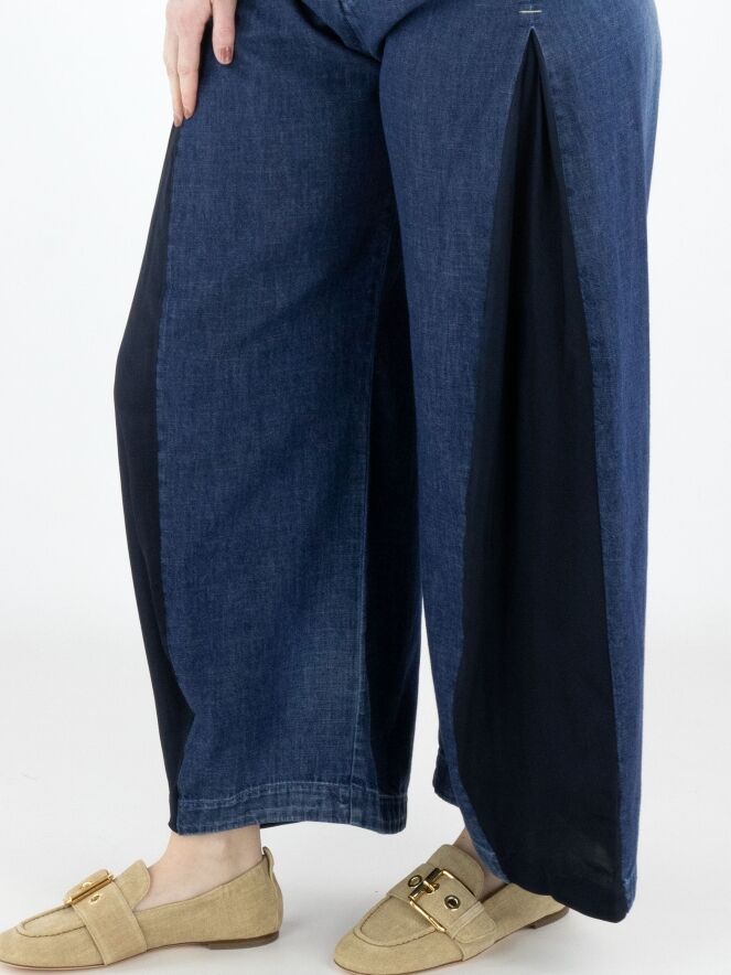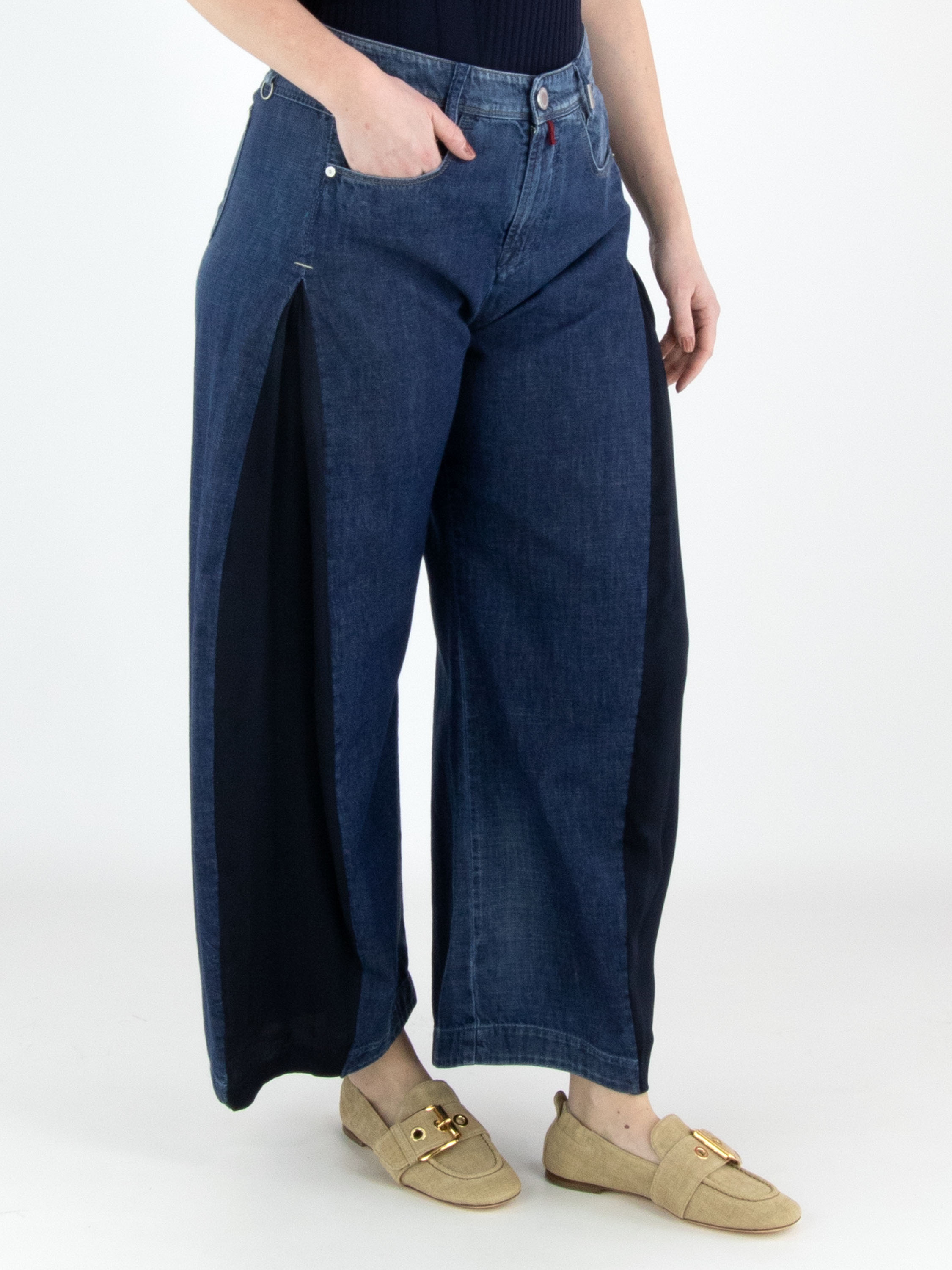 Een wijde jeans van High in een zachte katoenkwaliteit in een basic jeanskleur. De jeans is uitgevoerd in een 5-pocketmodel. Aan de zijkanten loopt vanaf de heup een wijd uitlopende split met een mat satijnen marineblauwe stof. Deze jeans mag op de hand worden gewassen.