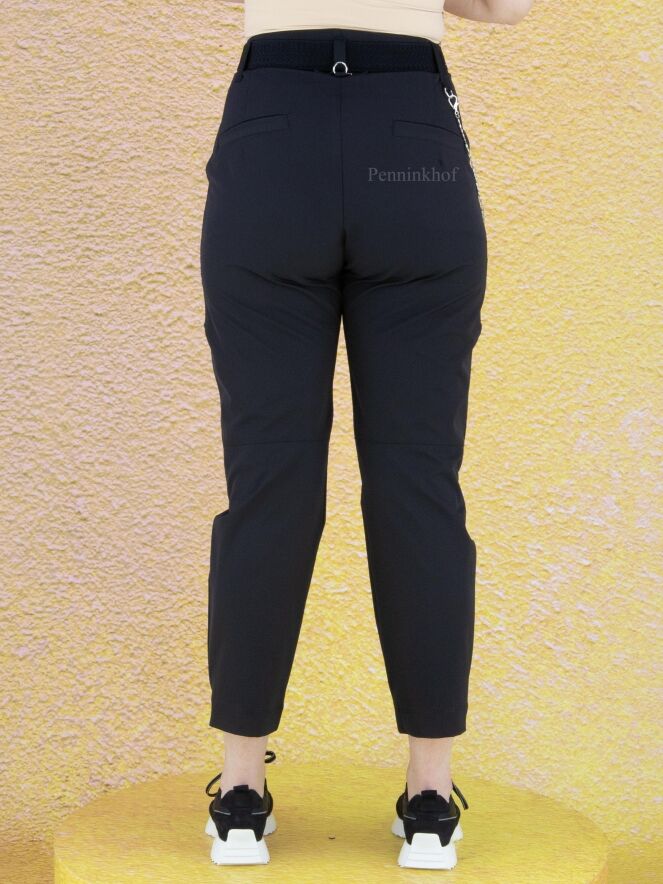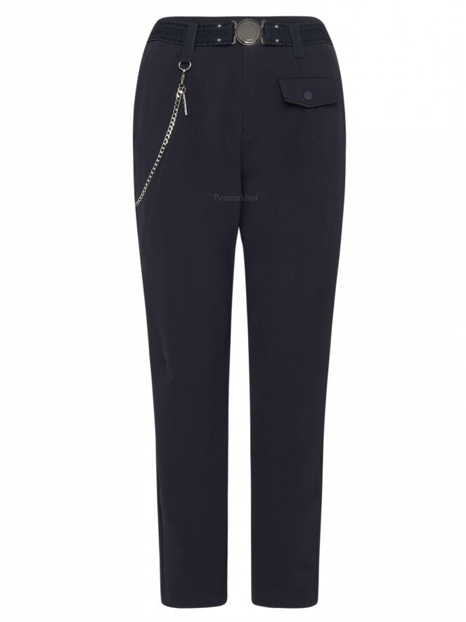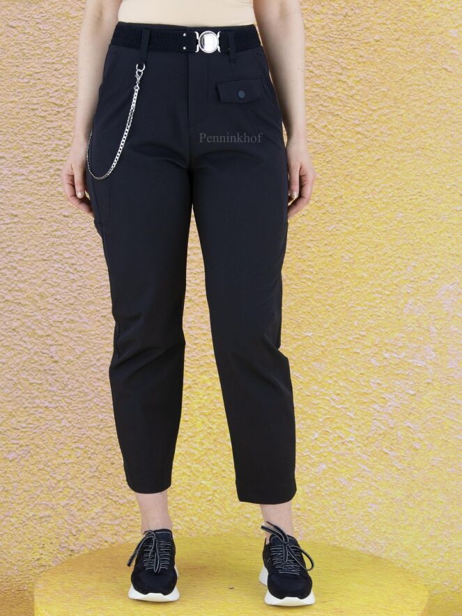 Een broek van High in een marineblauwe kleur. In de taille is een elastieken ceintuur met een ronde zilverkleurige gesp. Aan de voorkant zijn enkele diagonale stiknaden. De broek heeft steekzakken en vanuit de ceintuurlus aan de rechterkant is een ketting die naar achteren gaat. Deze broek mag op de hand worden gewassen.
