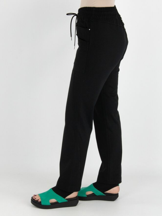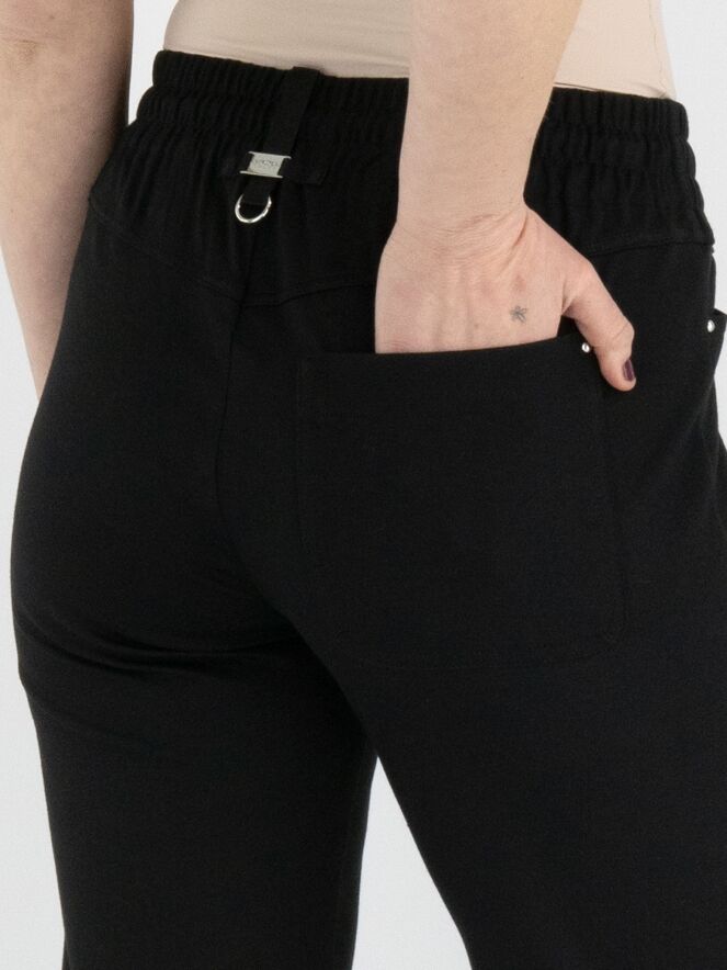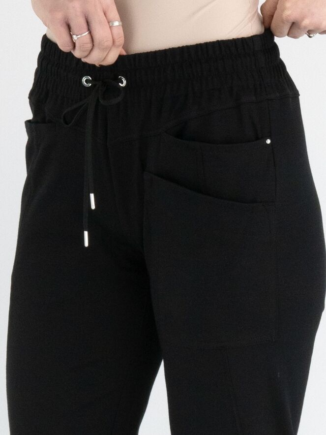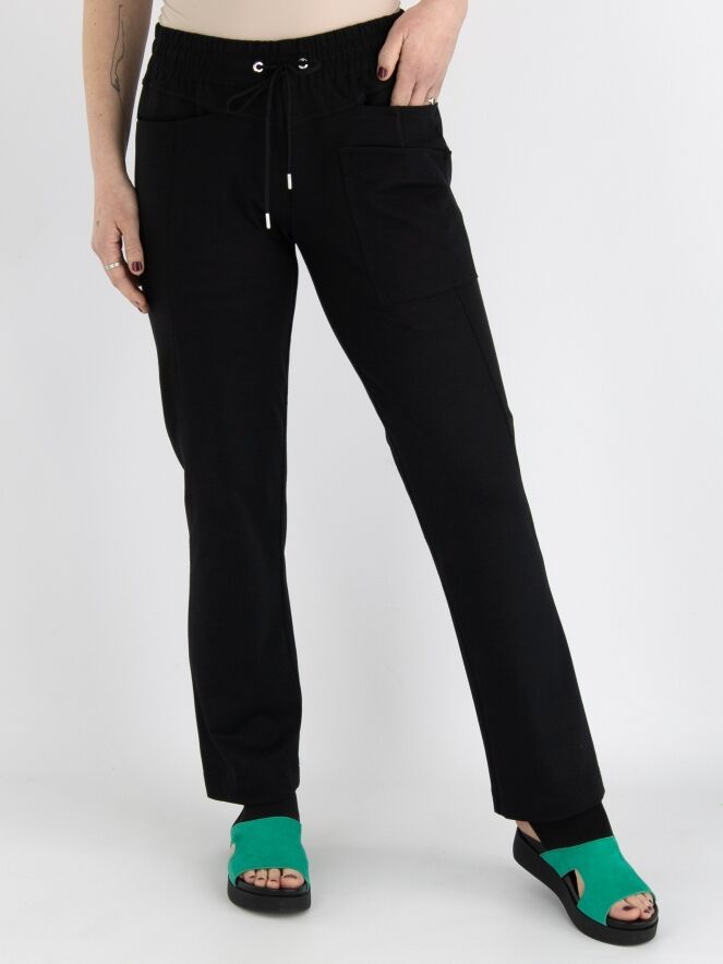 Een semi joggingbroek van High in de kleur zwart. In de taille is een brede geribbelde en elastische band met een koord in een tunnelverwerking. Aan de linker voorzijde is een dubbele zak. deze broek mag op 30 graden worden gewassen.