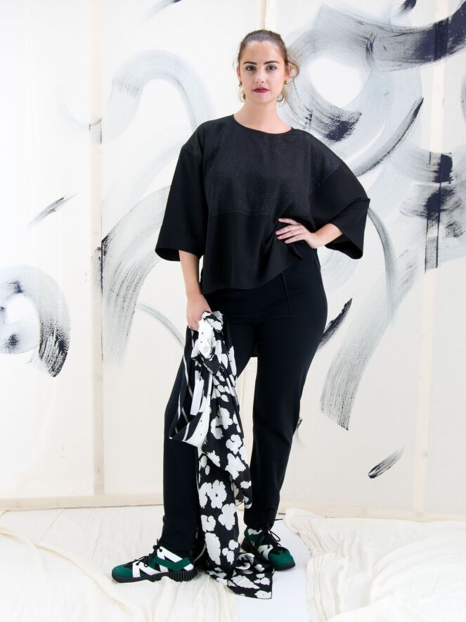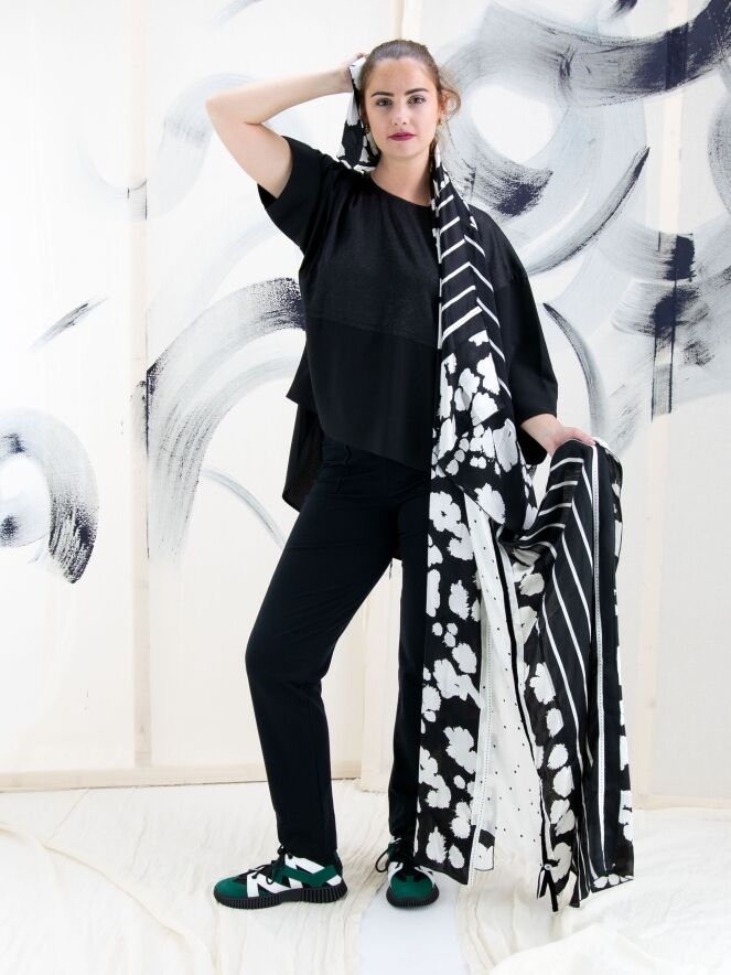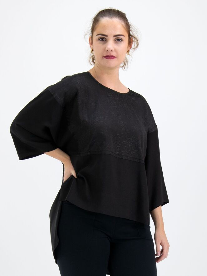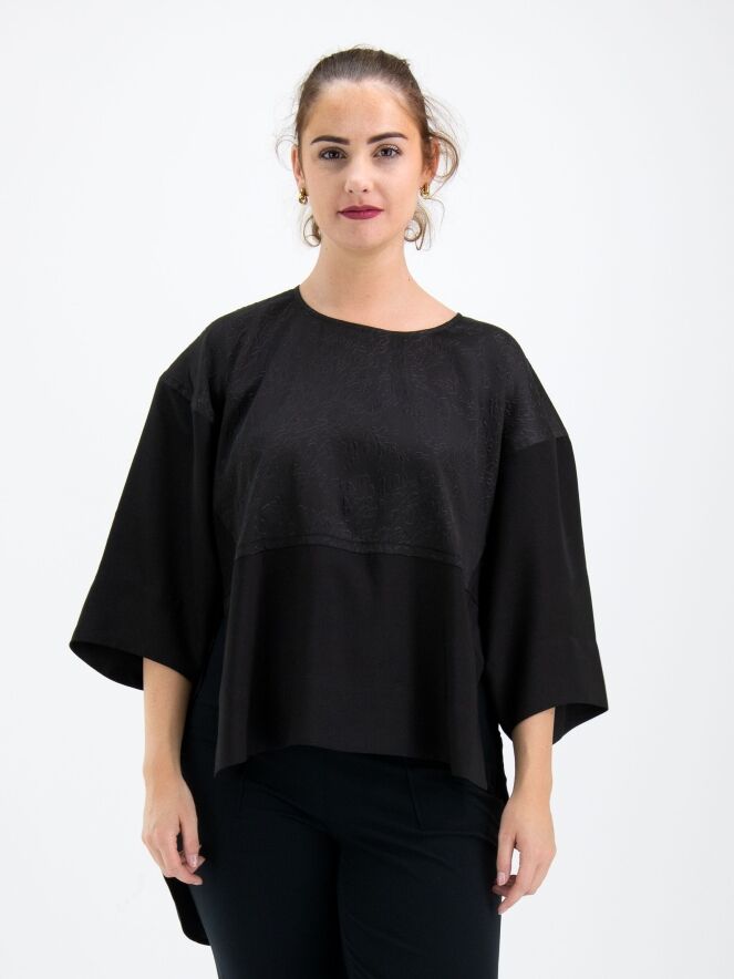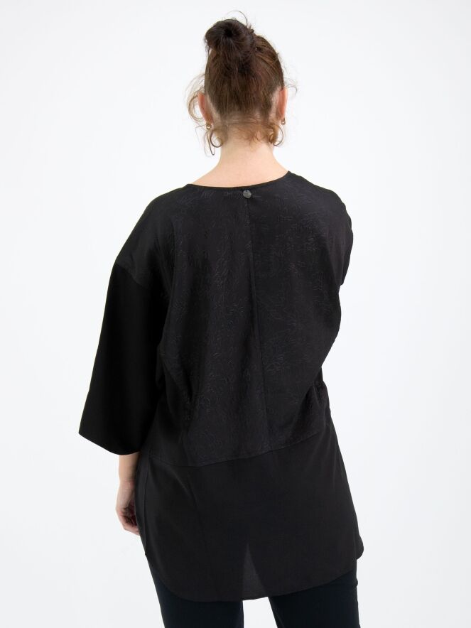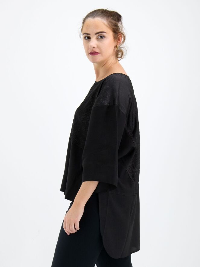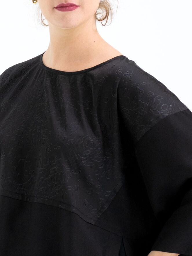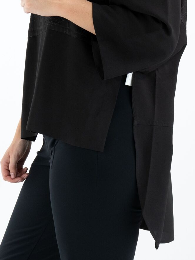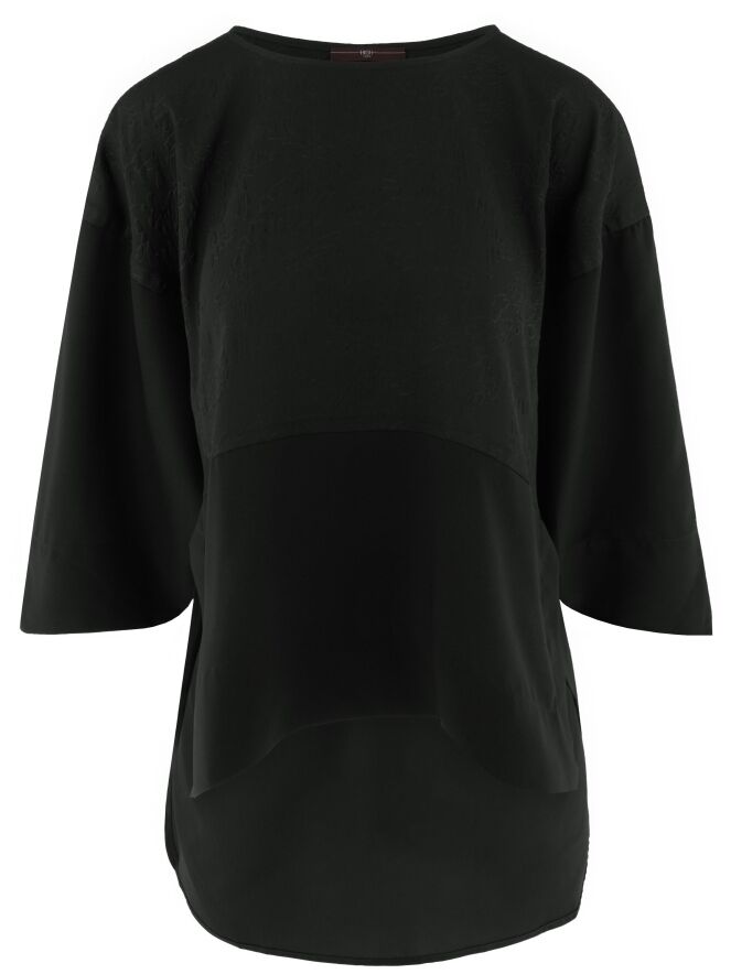 Een wijde shirt van High in de kleur zwart. Tot aan de taille heeft het shirt een stof met een grafische reliëfprint waaronder de stof uni glad is. Vanaf de taille zijn de zijkanten open. Dit shirt mag op 30 graden worden gewassen.
