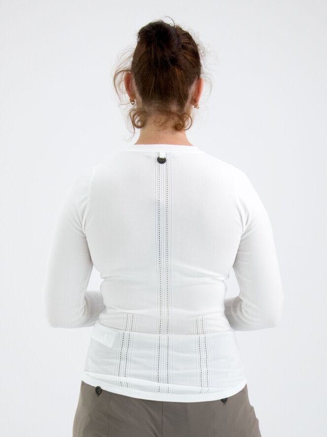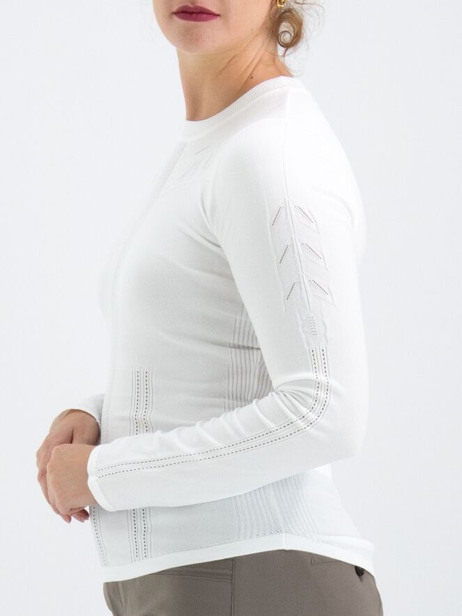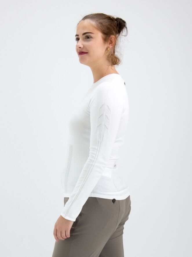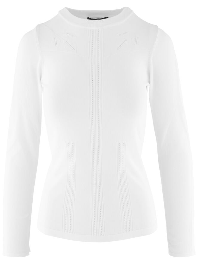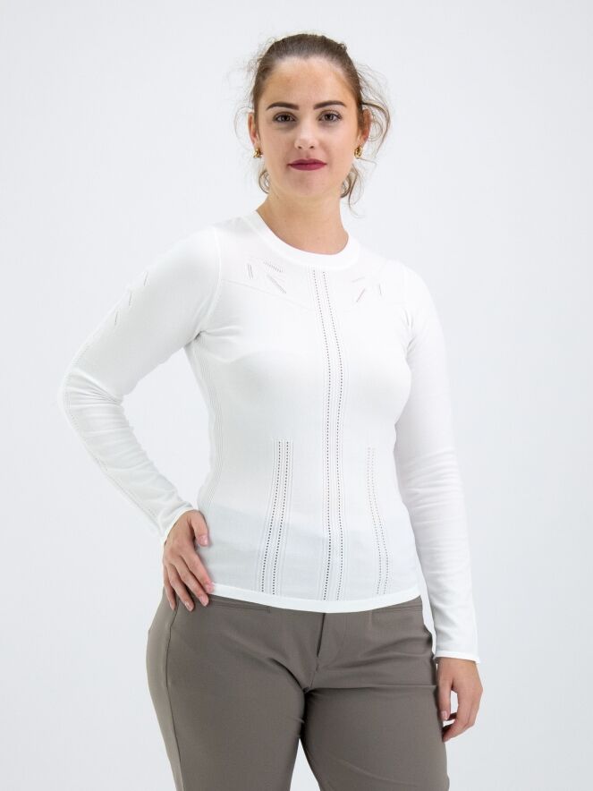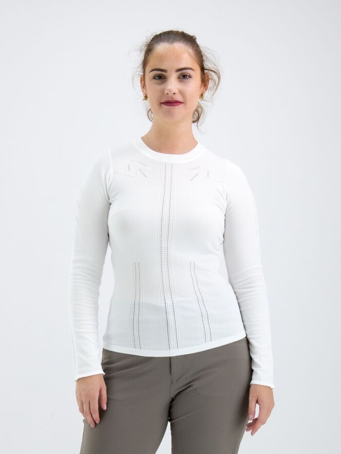 Een shirt van High in de kleur roomwit. Langs de rand van de hoge ronde hals is een fijn geribbelde tricot boord. Boven de buste is een bladeren patroon geweven met in de bladeren ajour lijnen. Vanuit de hals is in het midden een dubbele ajourlijn met daarlangs een fijn geribbelde stof. Dit shirt mag op de hand worden gewassen.